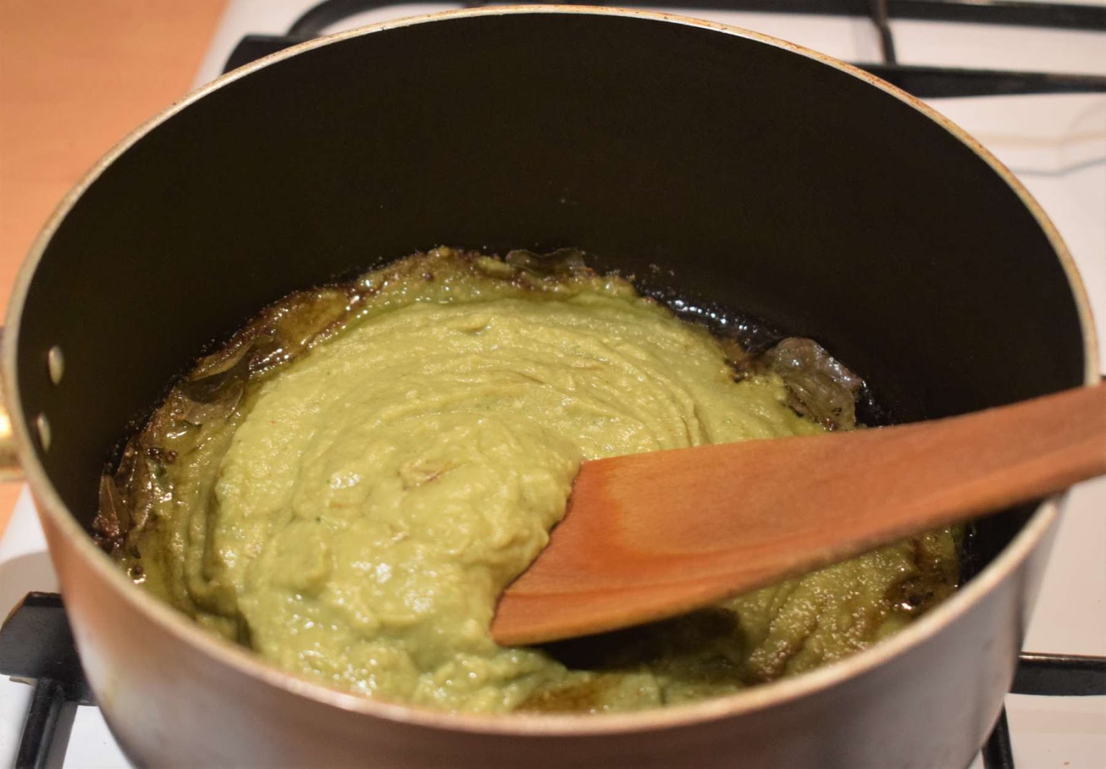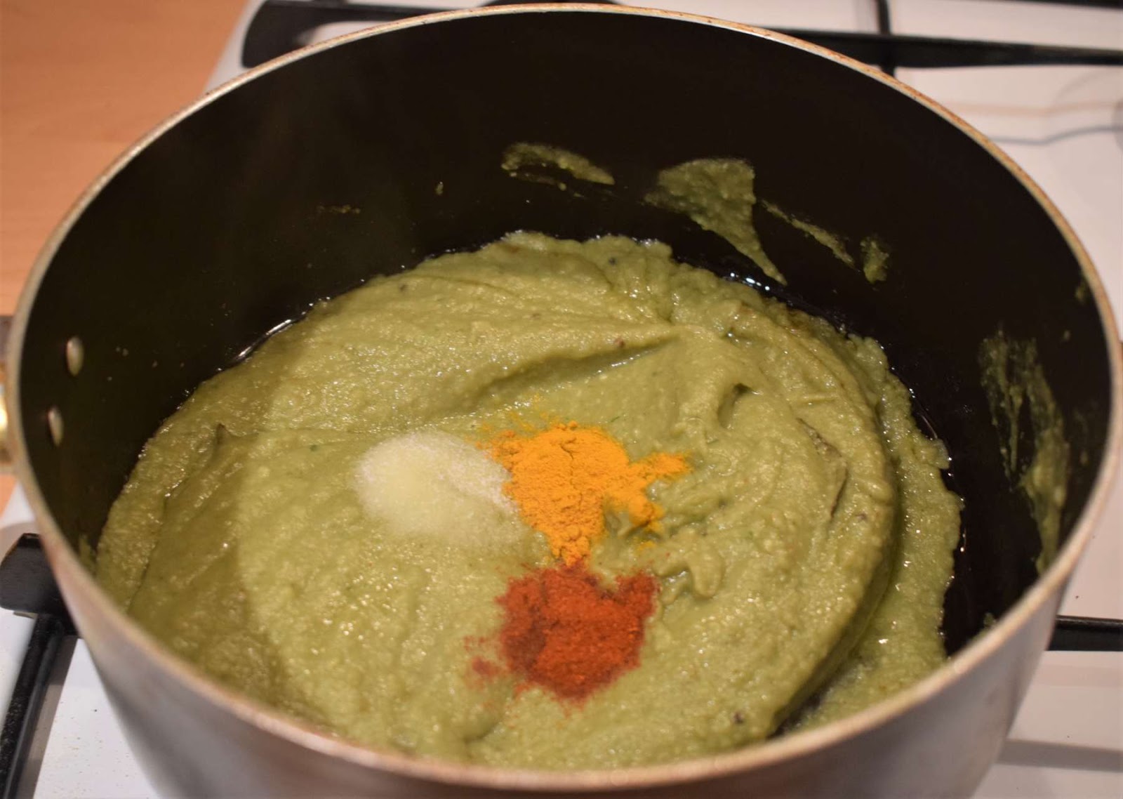 - Put the flame in low and pour the paste (Step 16) into the pan.