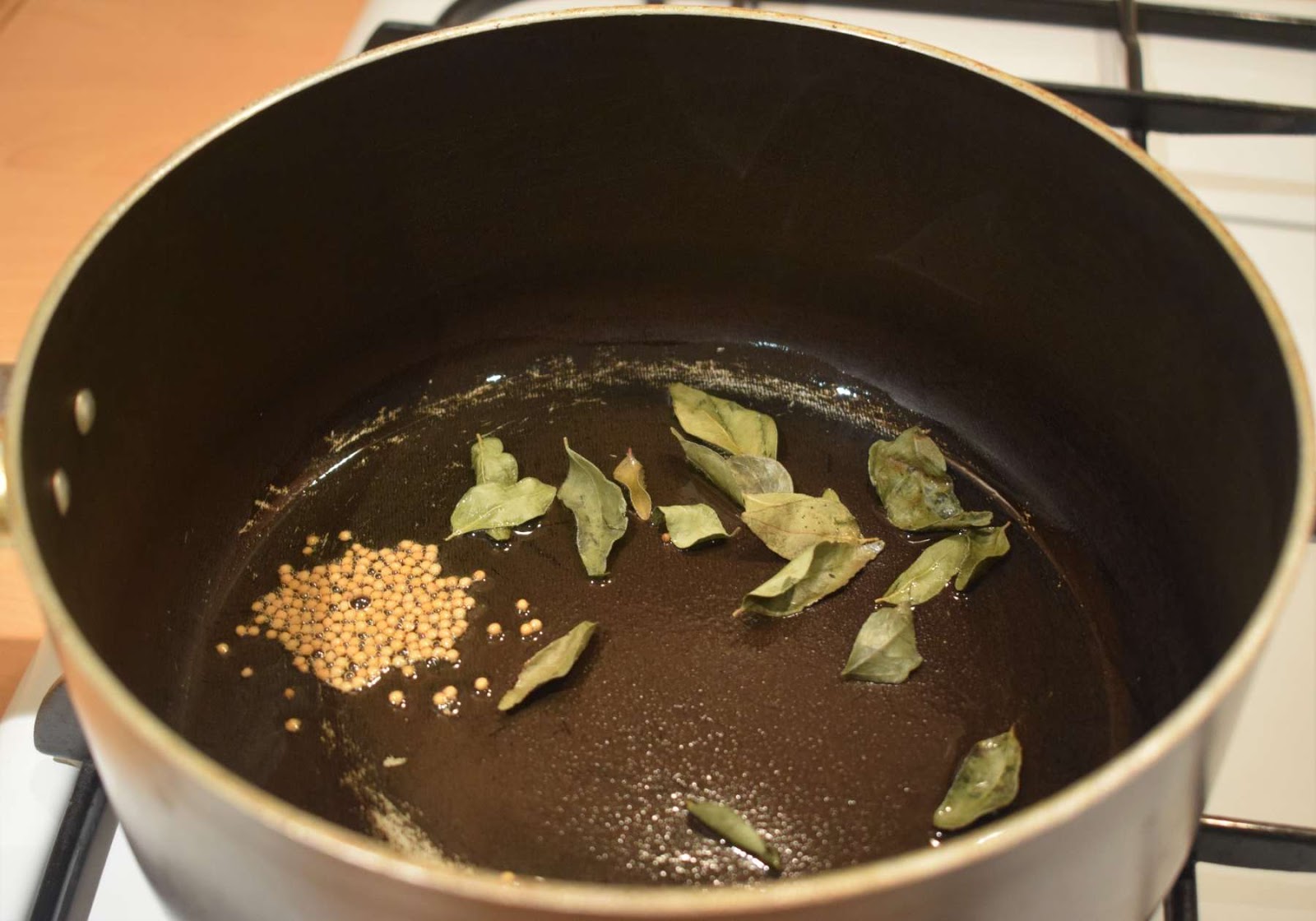 - Once the Oil is hot, add Mustard seeds, Curry leaves and let them crackle.