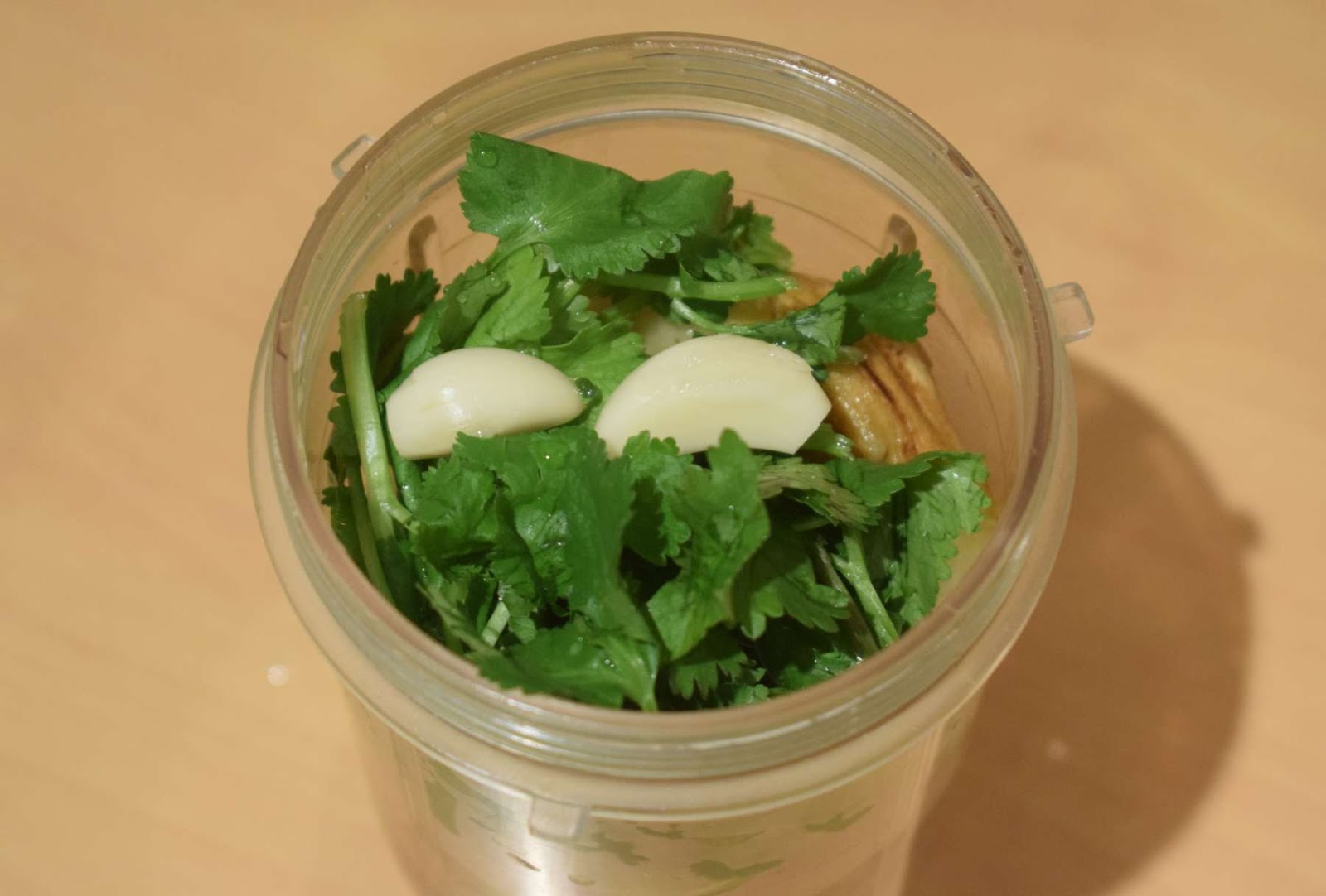 - Add Garlic cloves, Coriander leaves, grated Coconut into the jar.