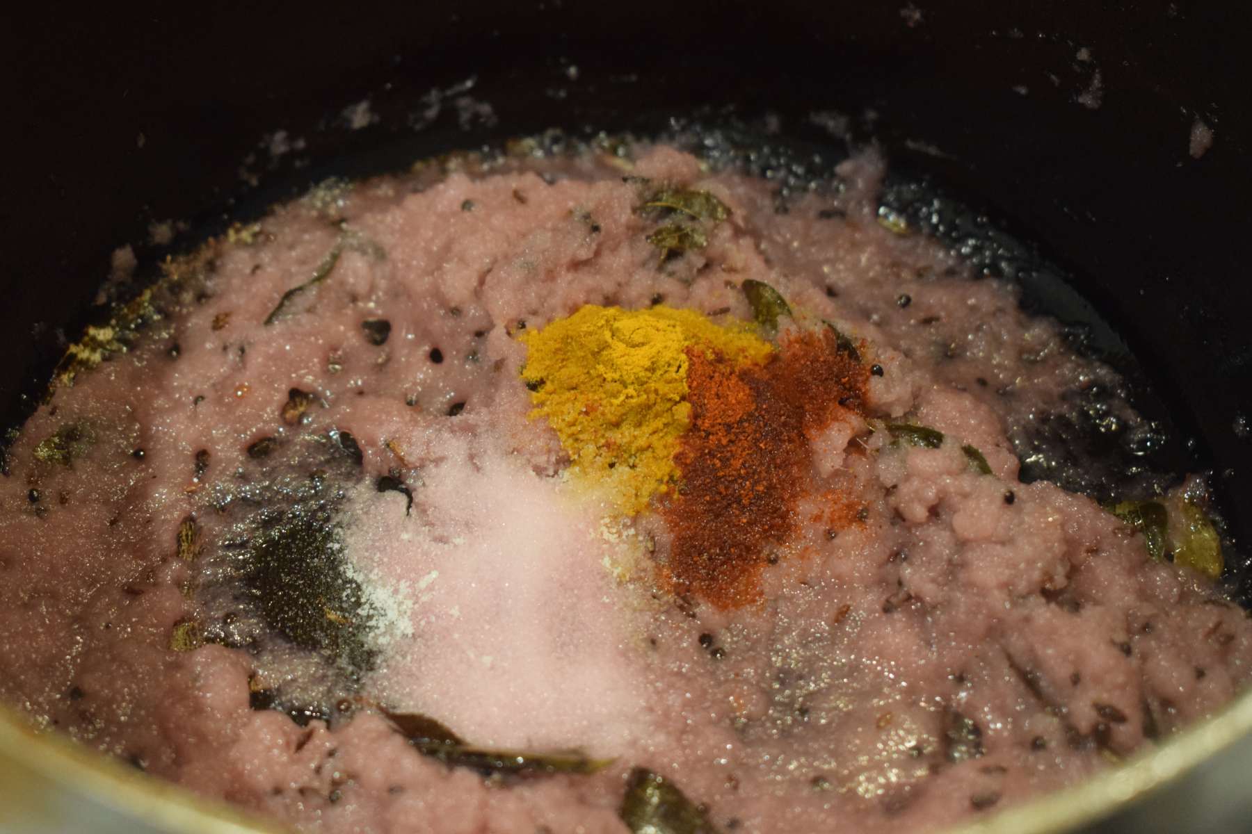 - Add salt, turmeric powder, chilli powder into the pan and give a nice mix.