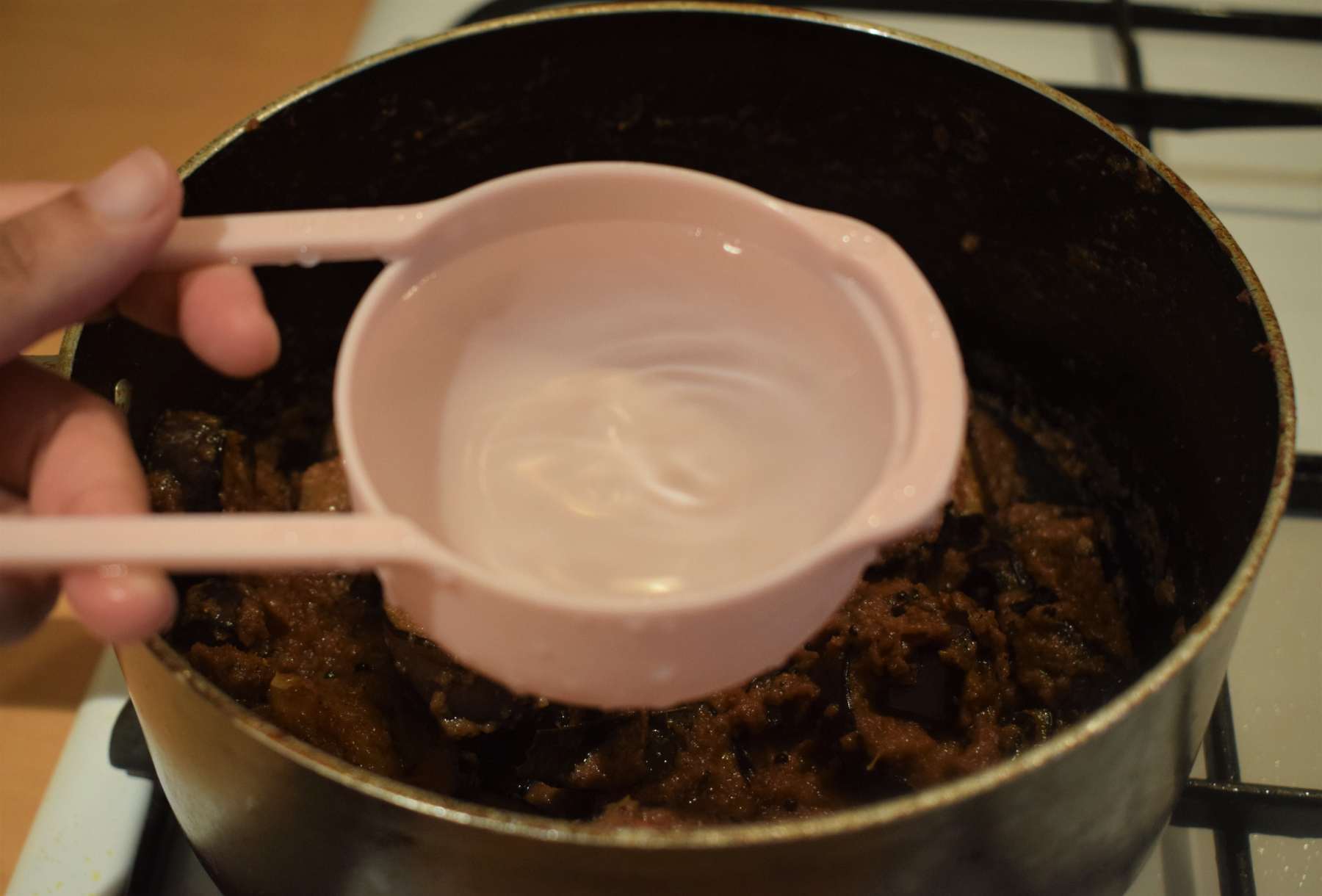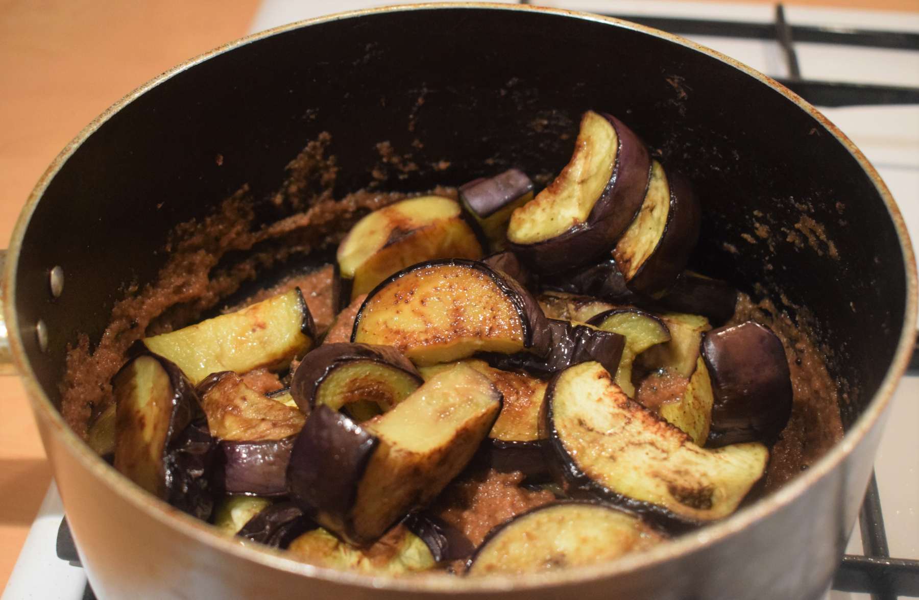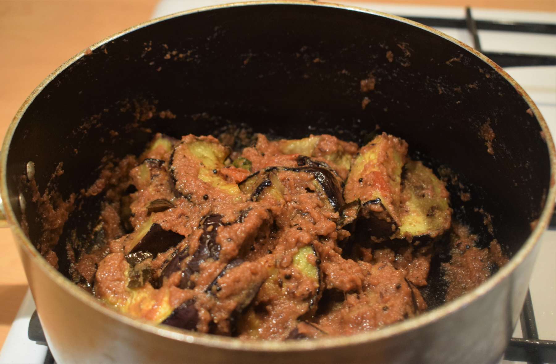 - Add the shallow fried brinjal pieces (Step 11) into the pan and mix it properly.