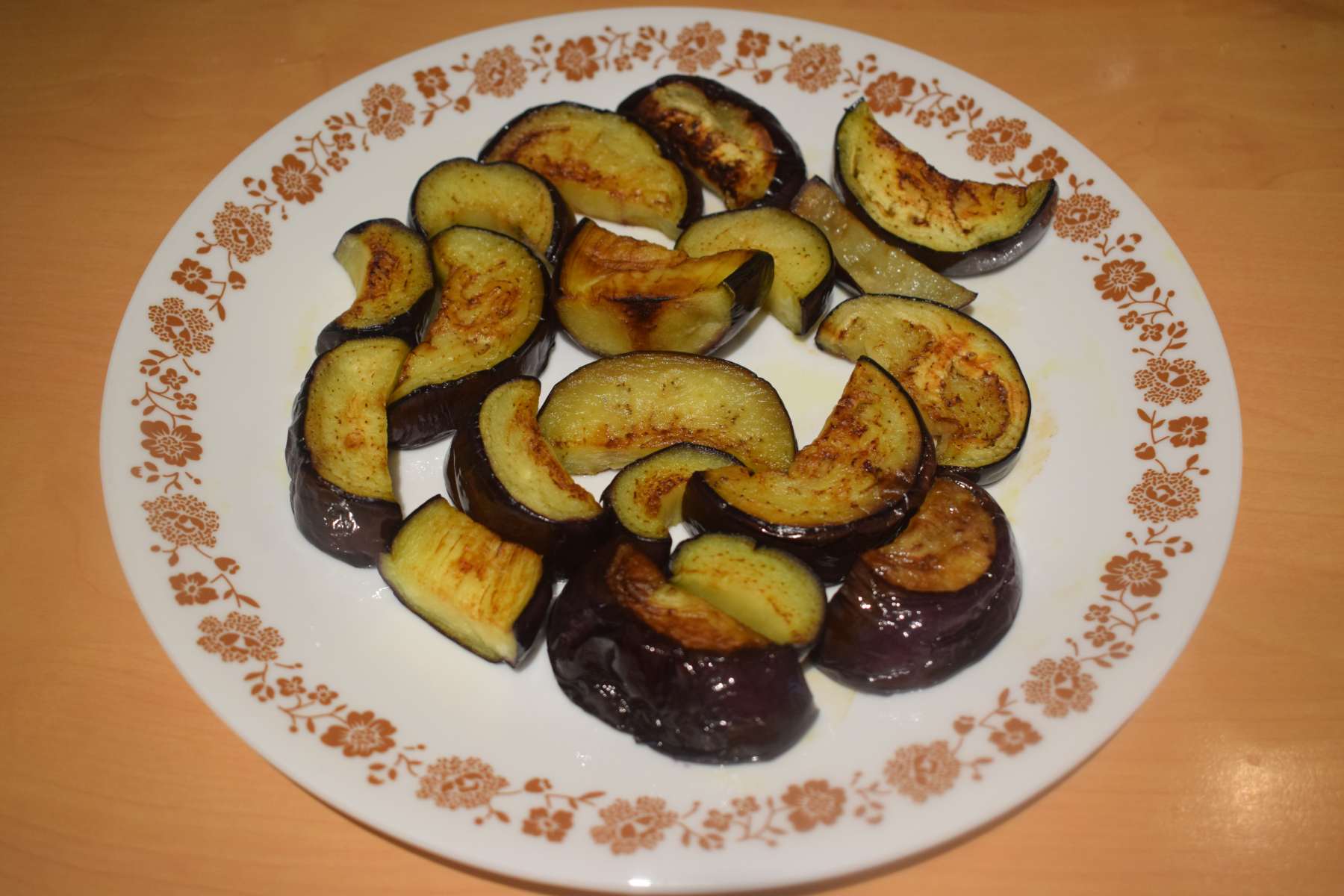 - Once the oil is hot, add the brinjal pieces and fry them from both the sides until the brinjal pieces shrink and brown spots occur on them. Take the pieces out on a separate plate.