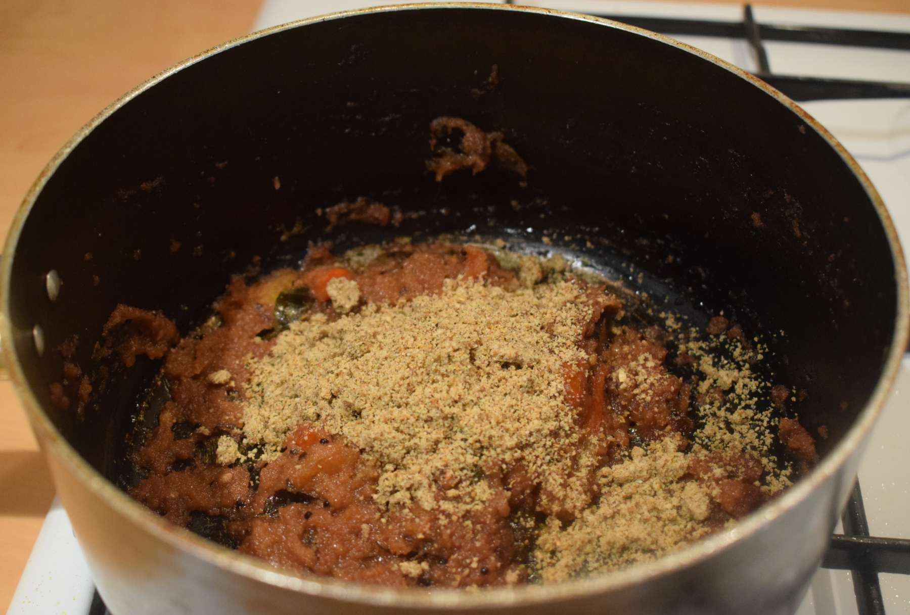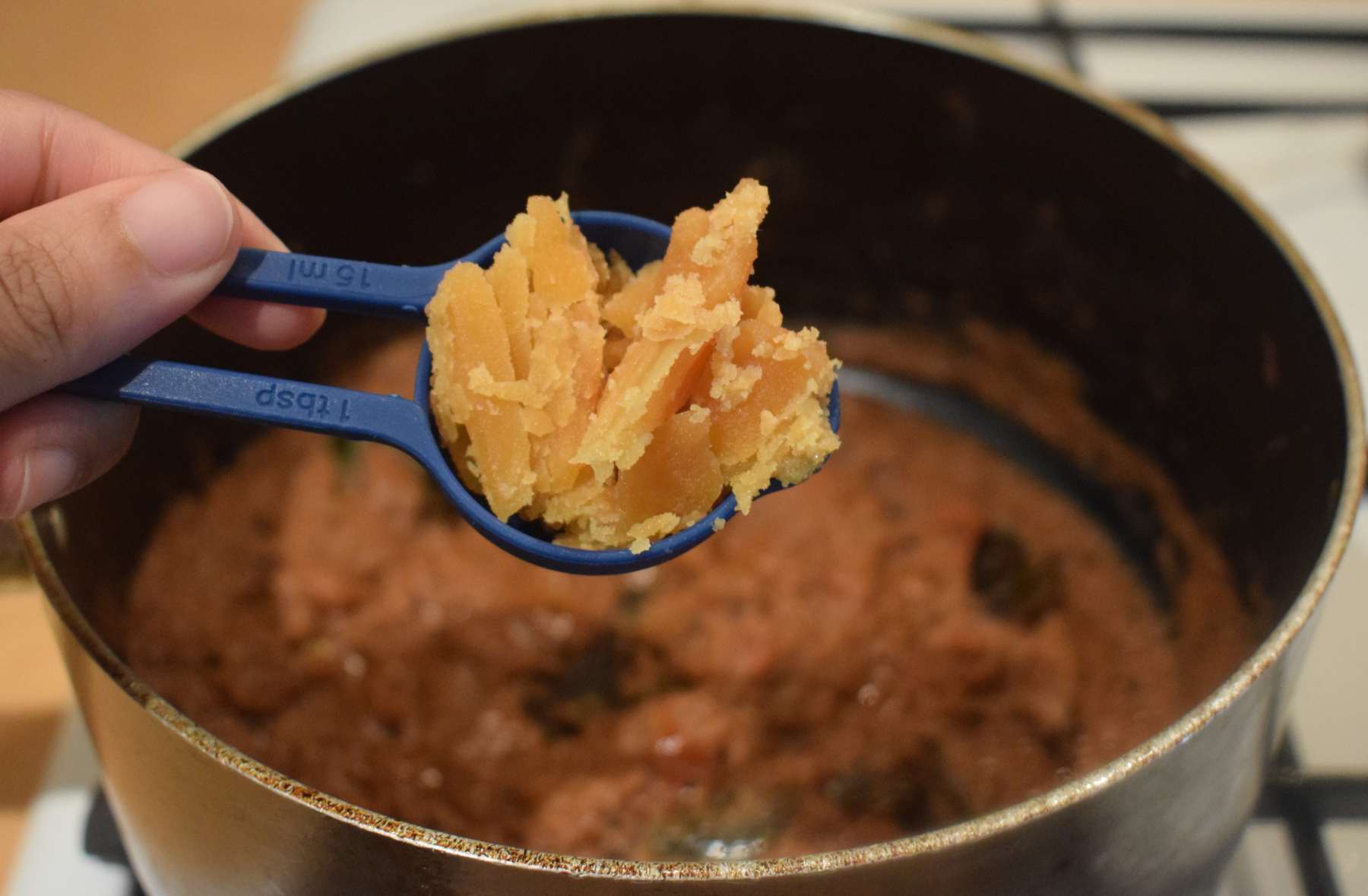 - Add grated jaggery into the masala and mix it properly until it melts.