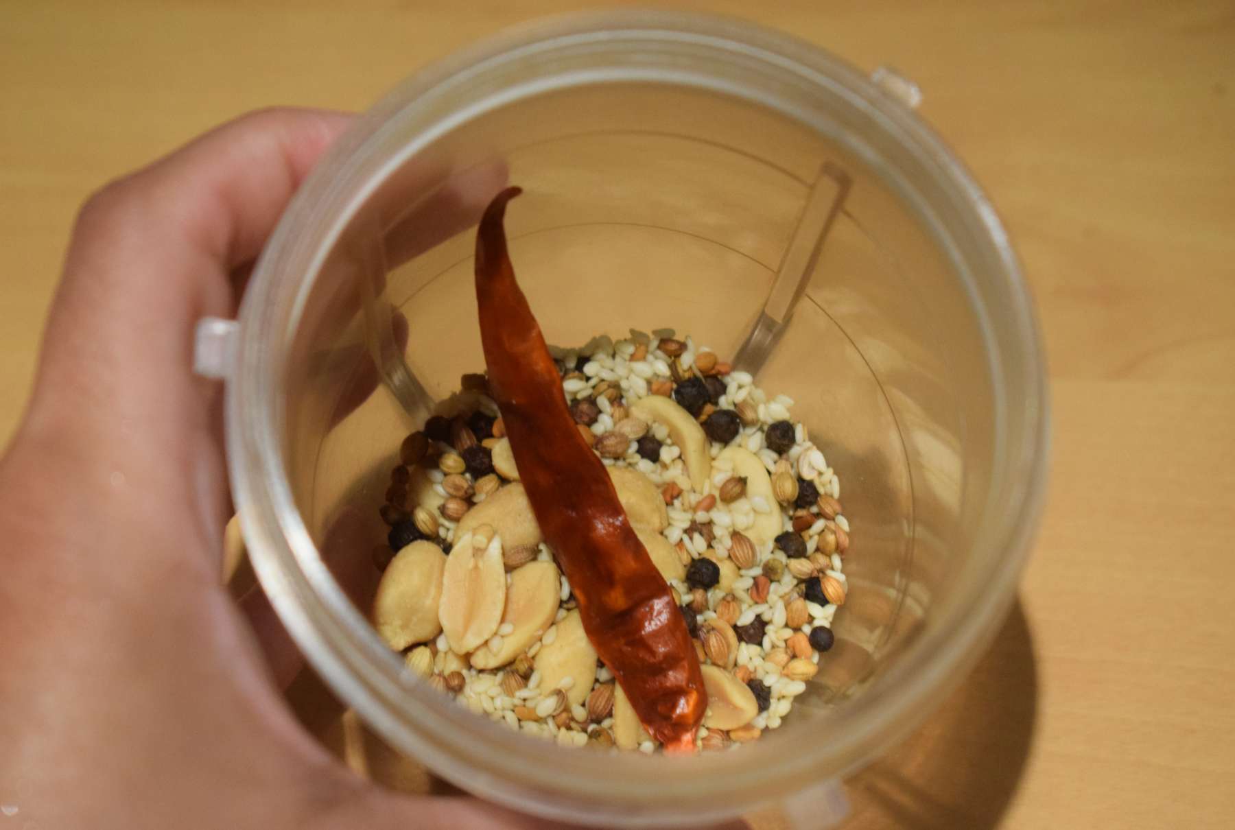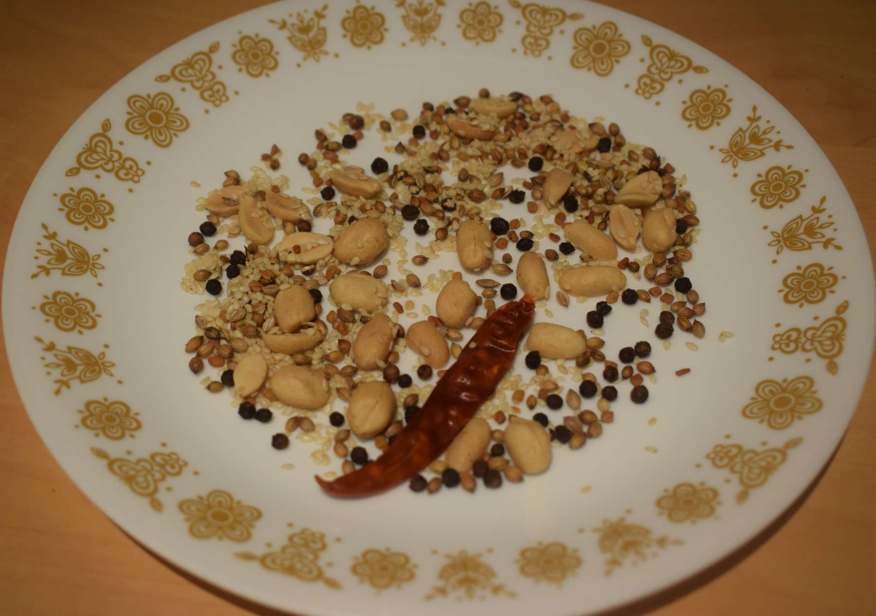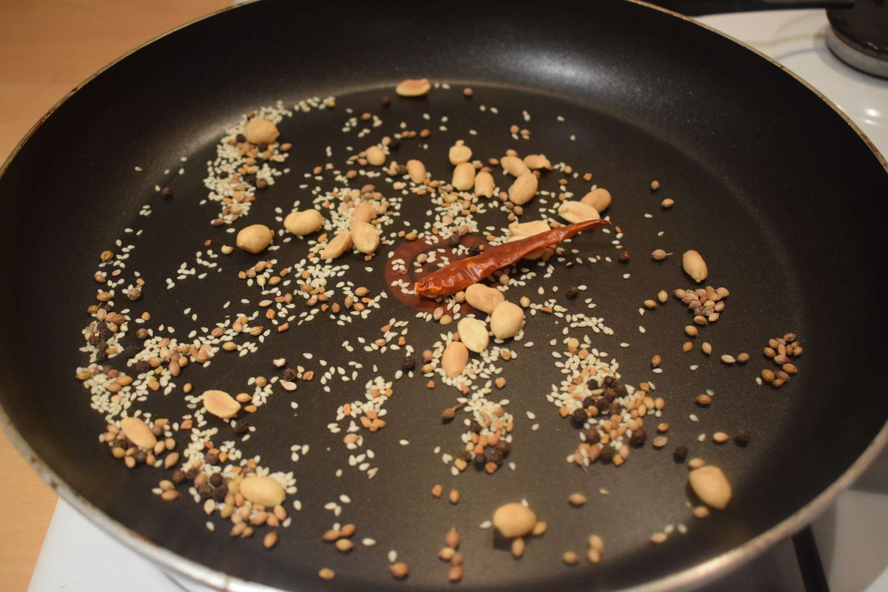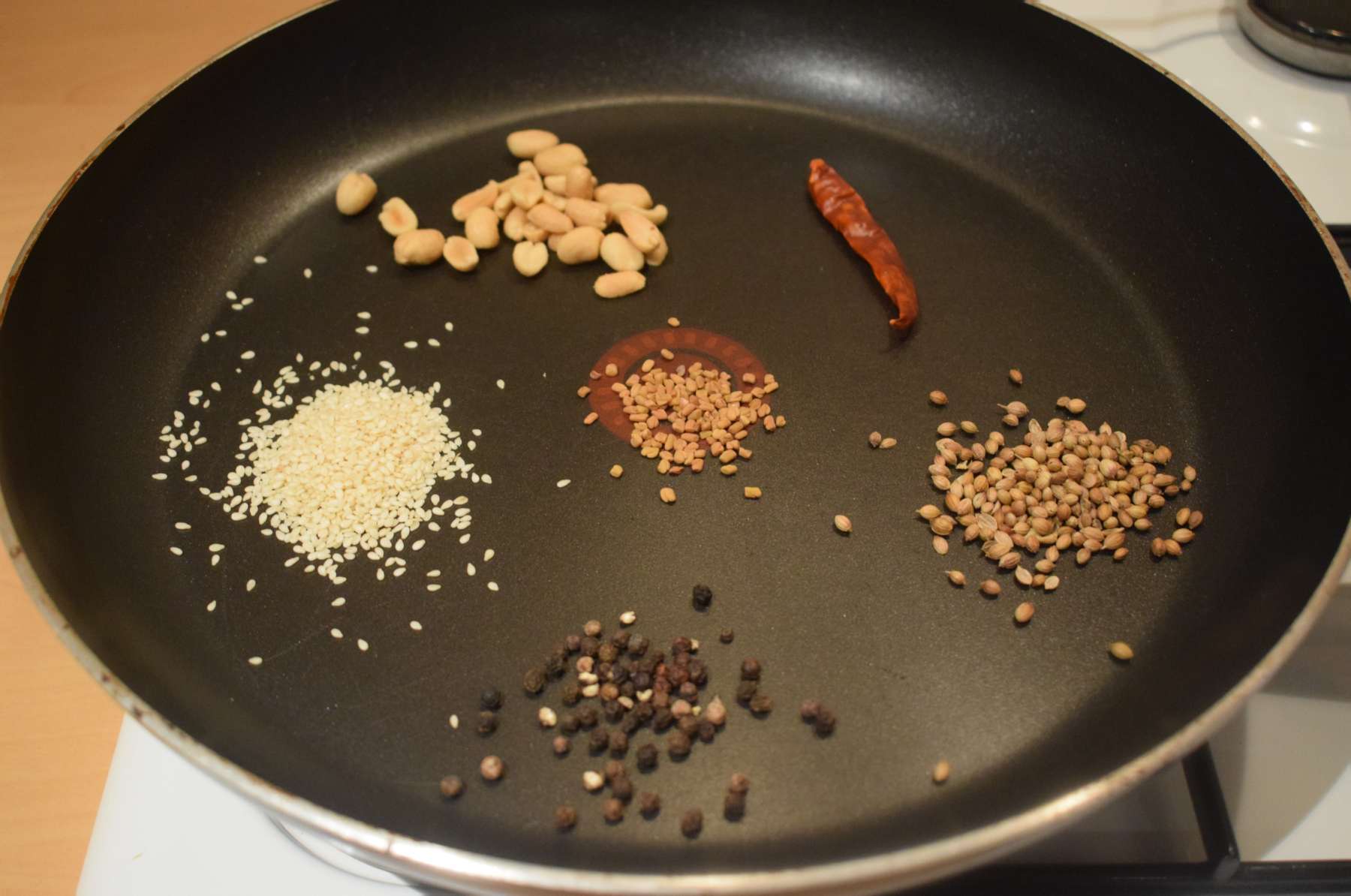 - Take a pan and add the whole spices – peanuts, sesame, peppercorns, fenugreek seeds, coriander seeds and dry red chilli into it.