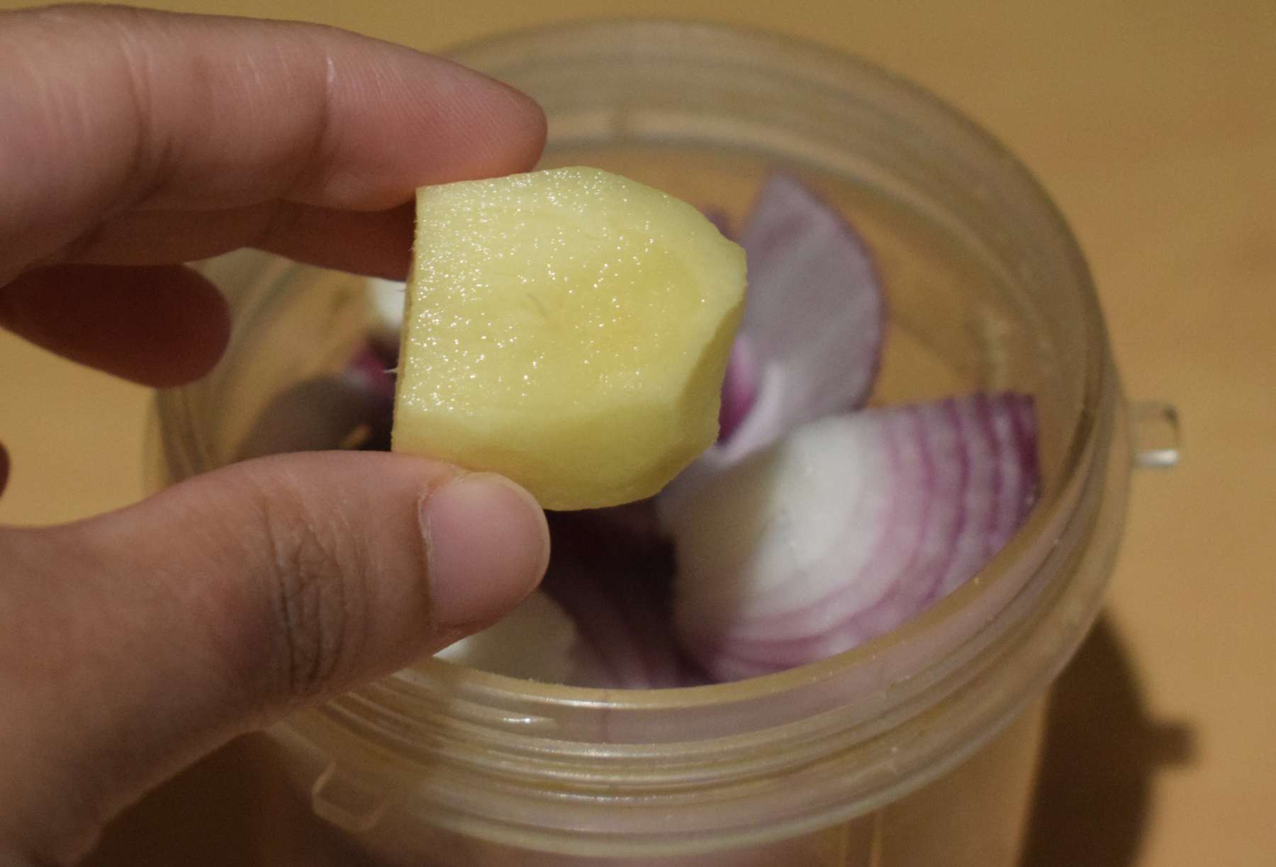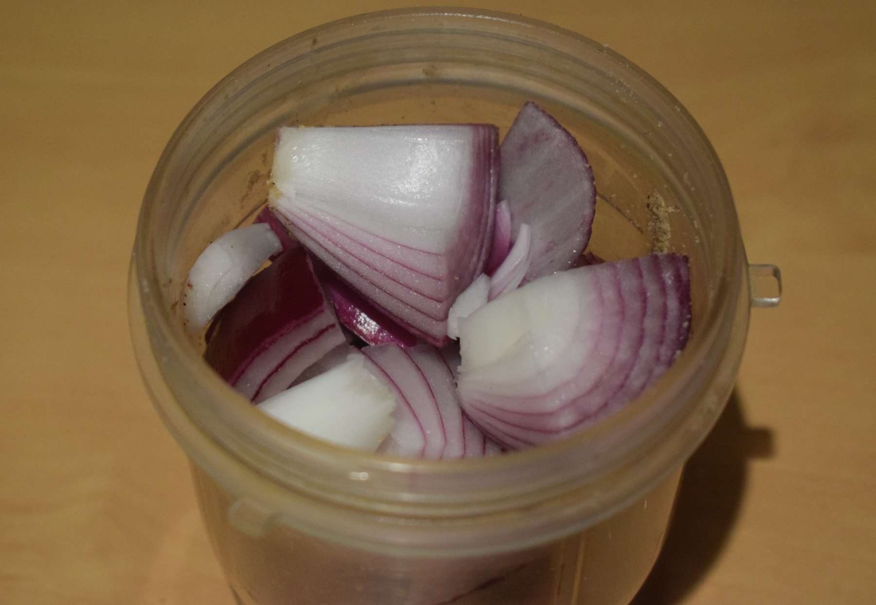 - On the other hand, transfer the onion chunks into the medium jar of the grinder.
