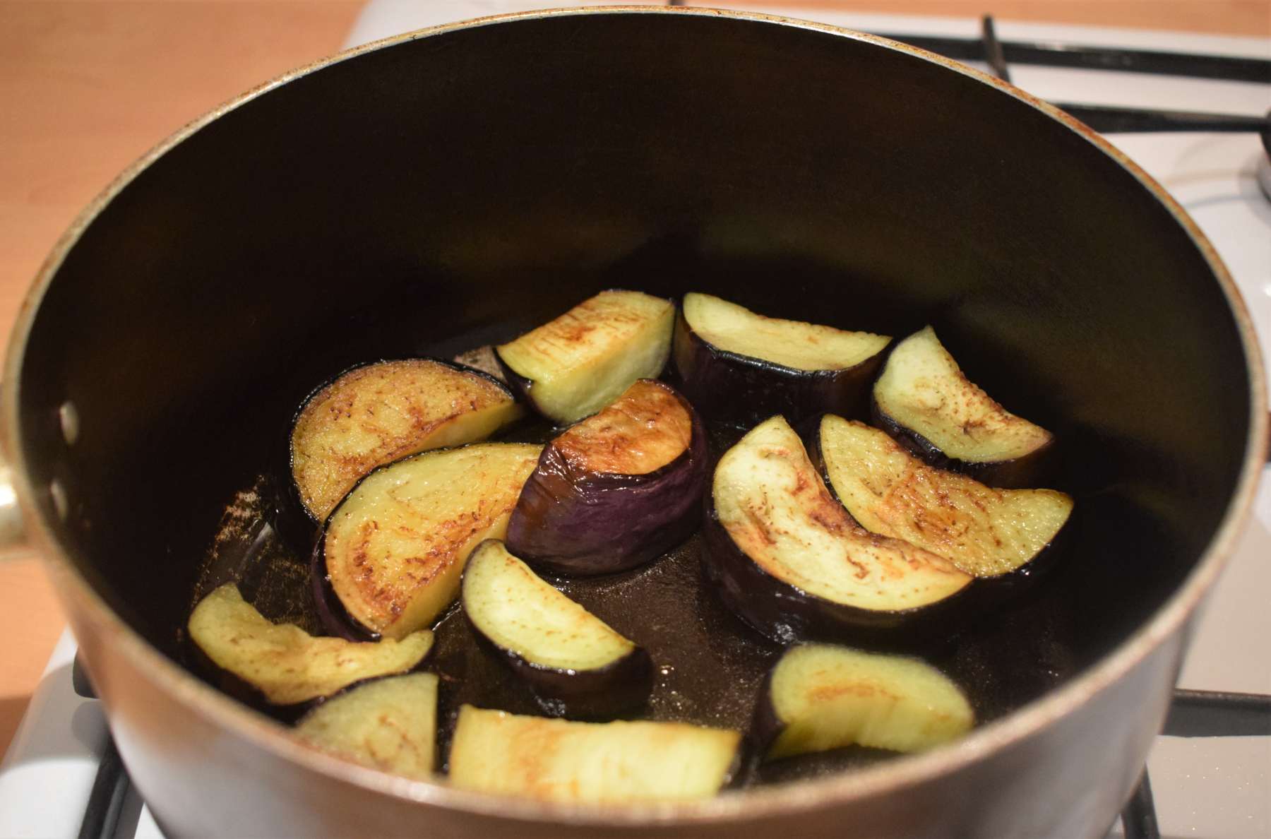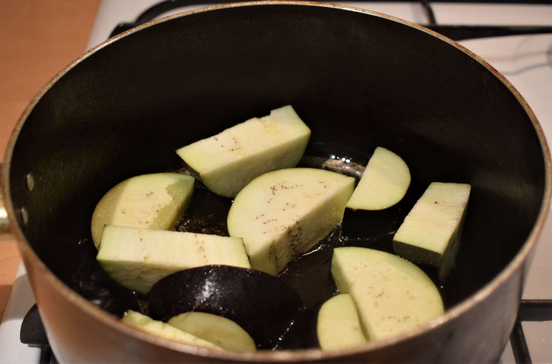 - Add oil into the pan to shallow fry the brinjal pieces.