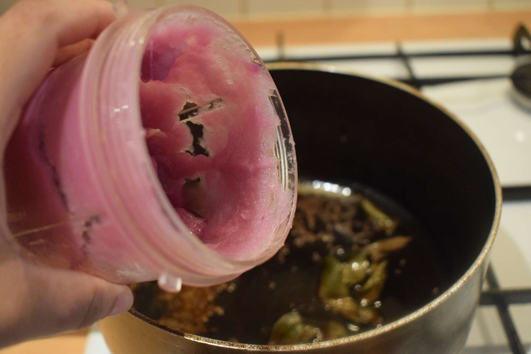 - Put the flame in low and add onion paste (Step 5) into the pan and give a stir.