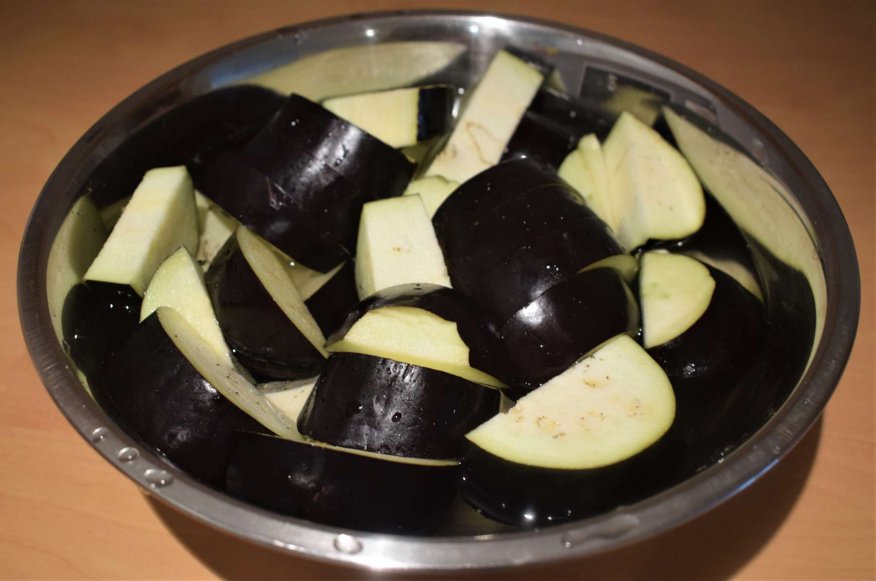 - Cut the brinjals into thick semi-circular shape and soak it in water or else the brinjal would get dark in colour.