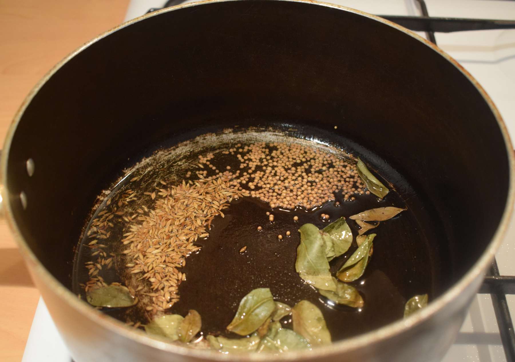 - Add cumin seeds, mustard seeds, curry leaves into the pan and let them crackle.