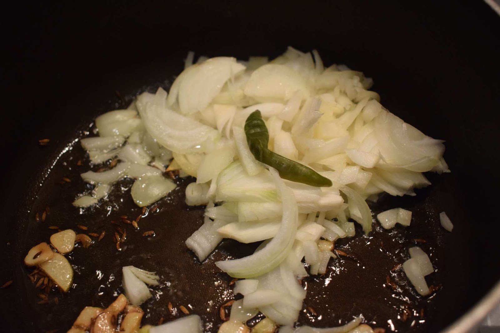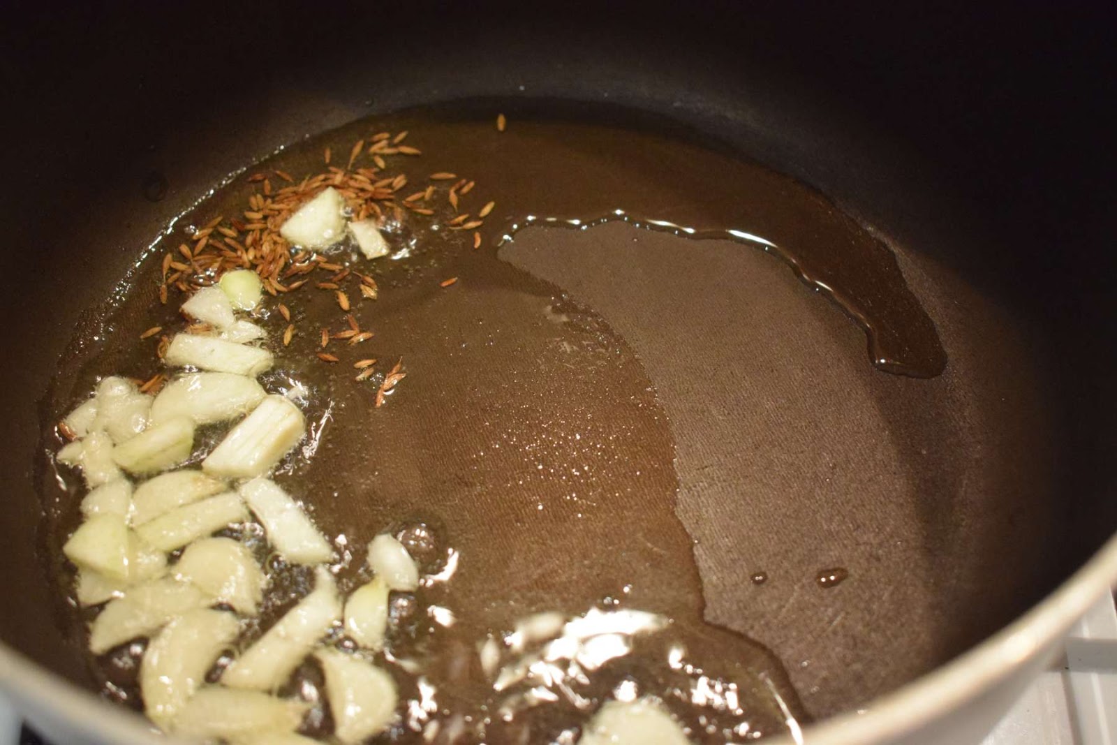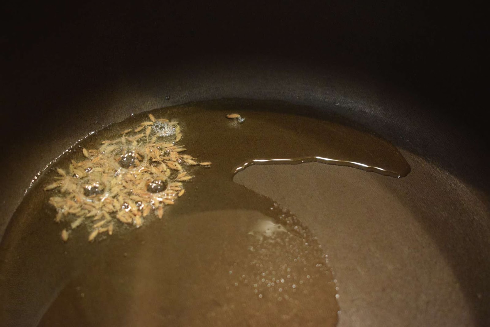 - Once the Oil is hot, add Cumin seeds (Jeera) and let them crackle.
