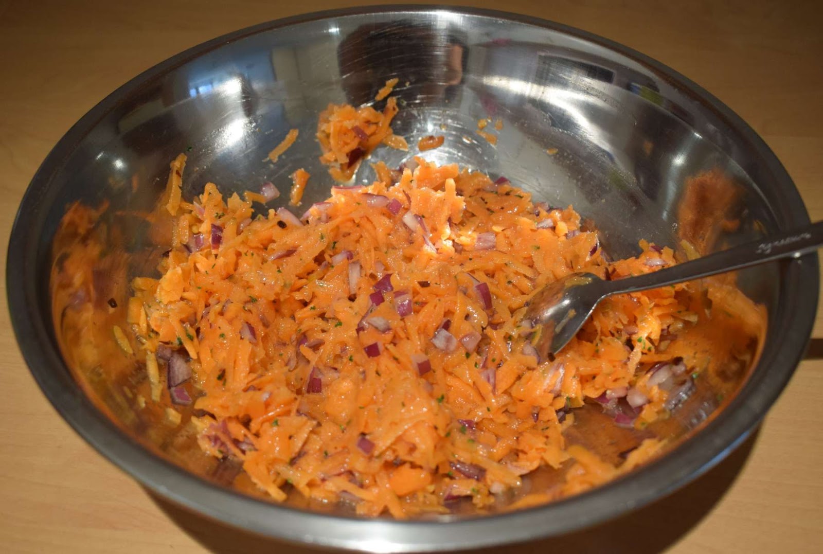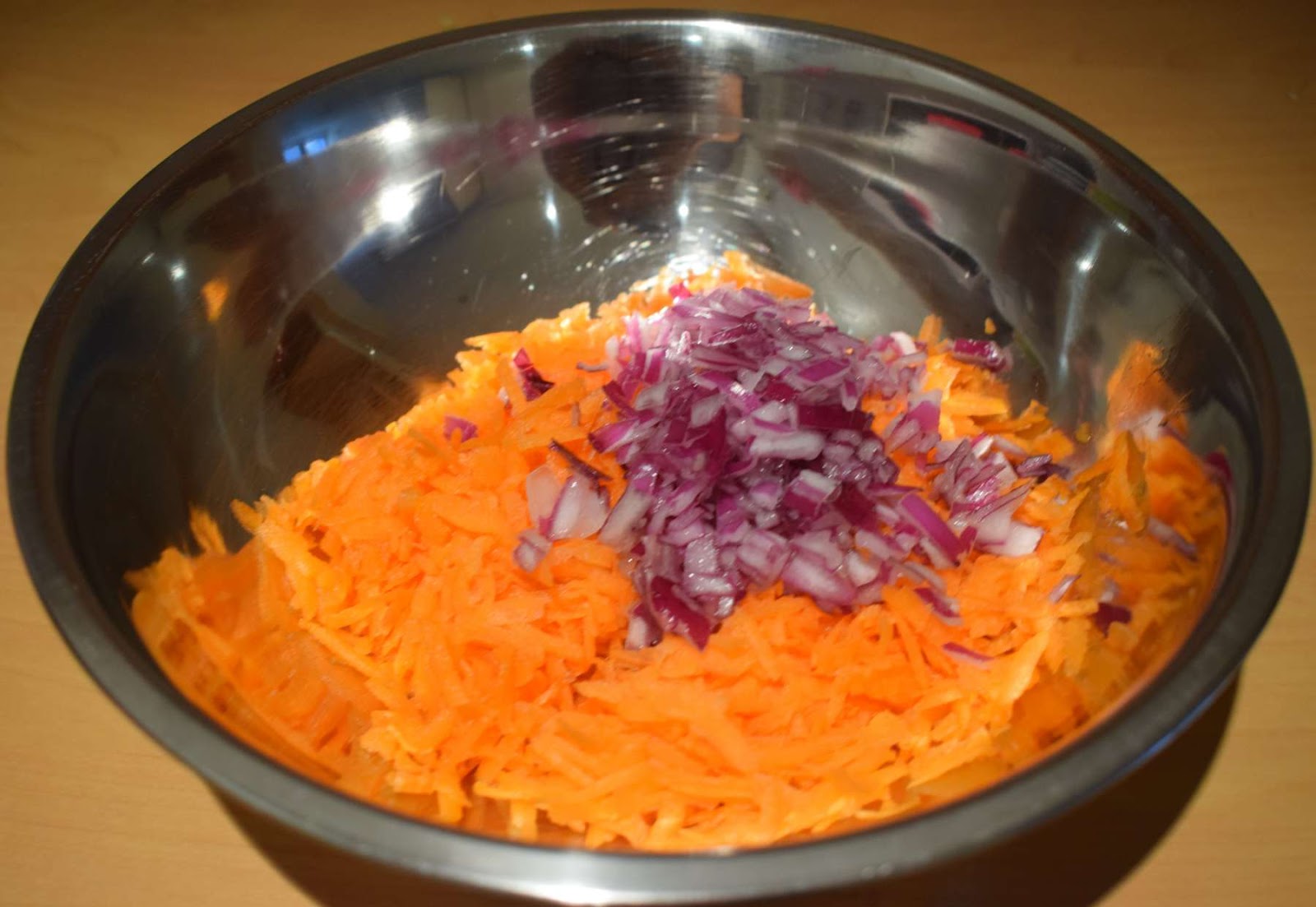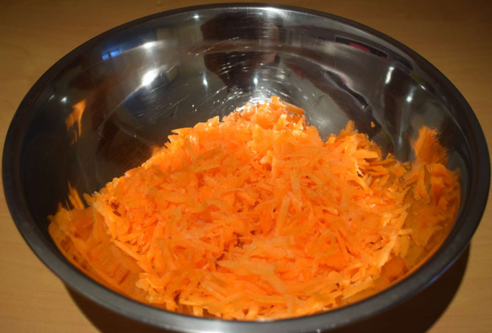 - Take the grated carrots into a large mixing bowl.
