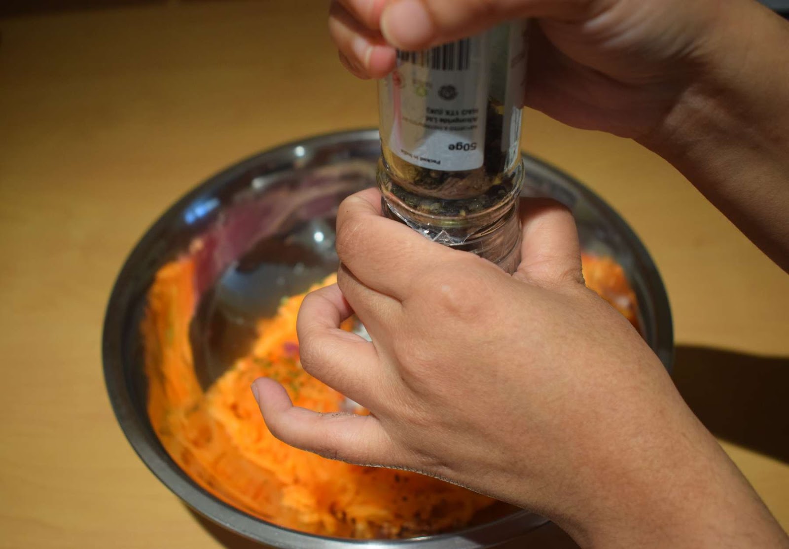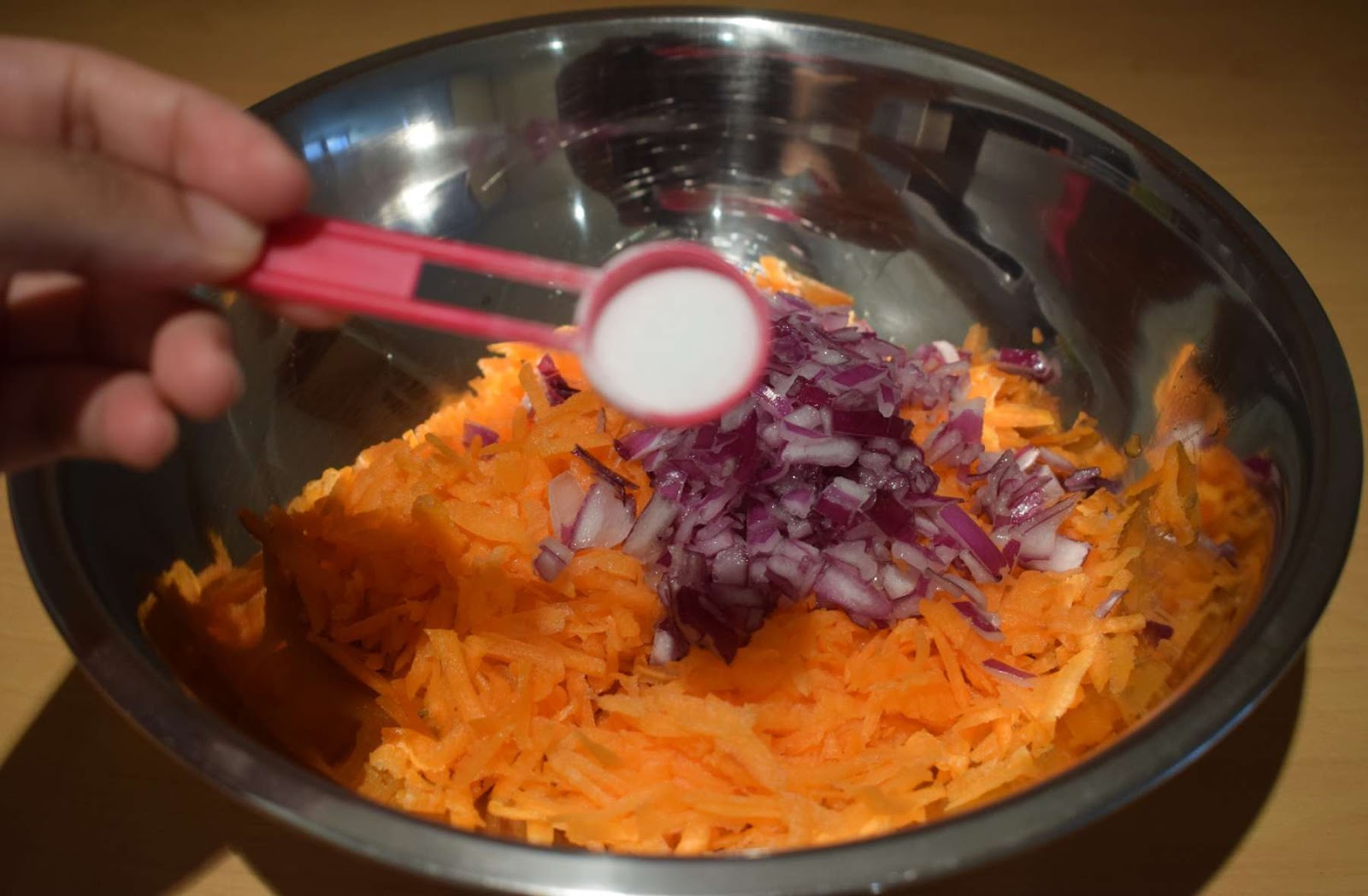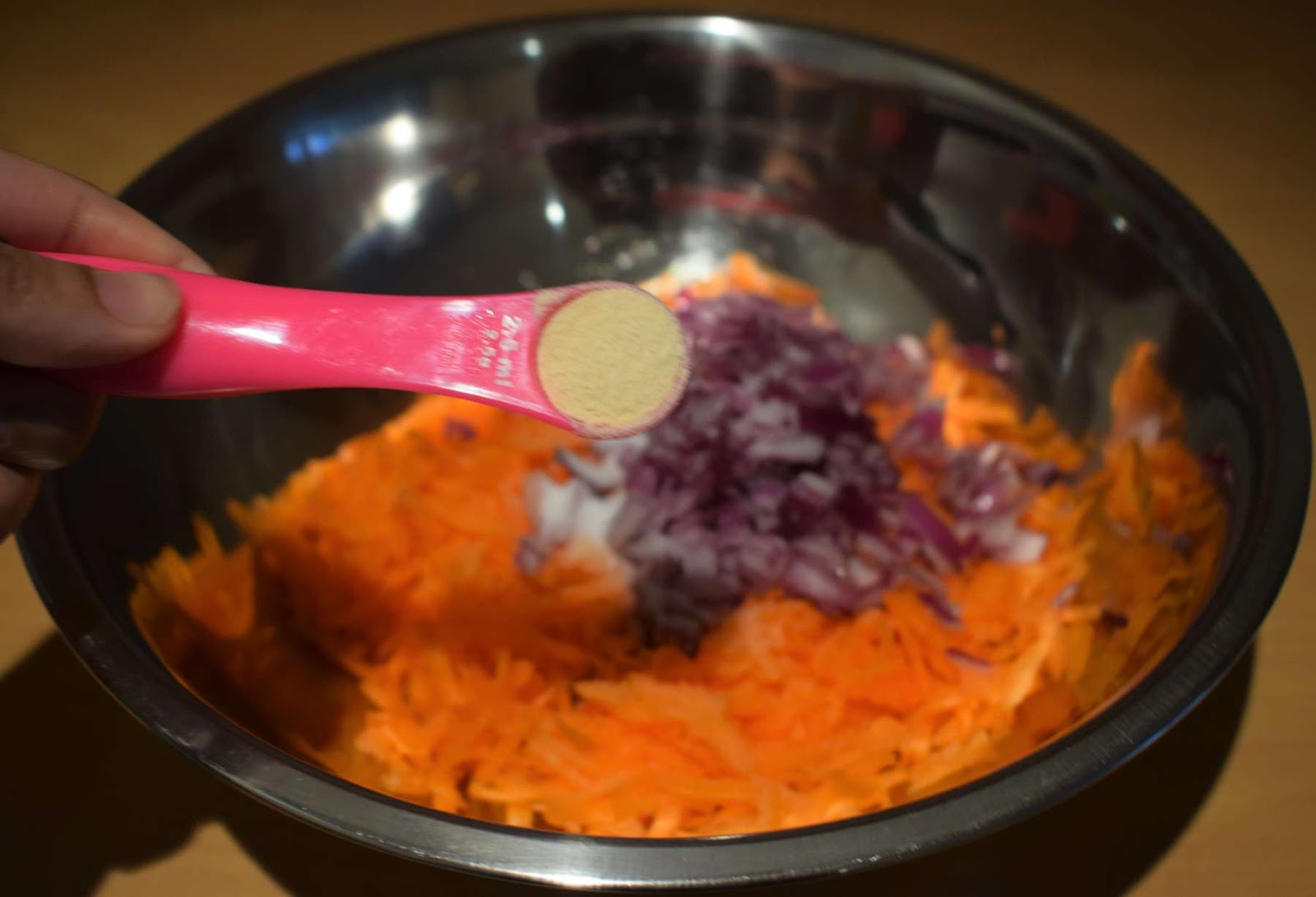 - Take the grated carrots into a large mixing bowl.