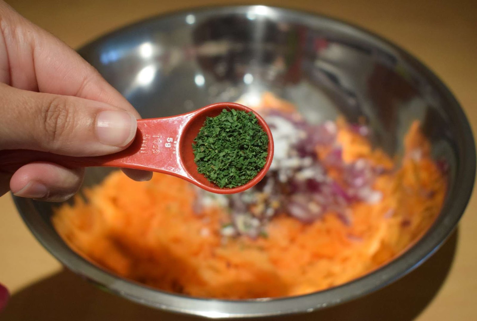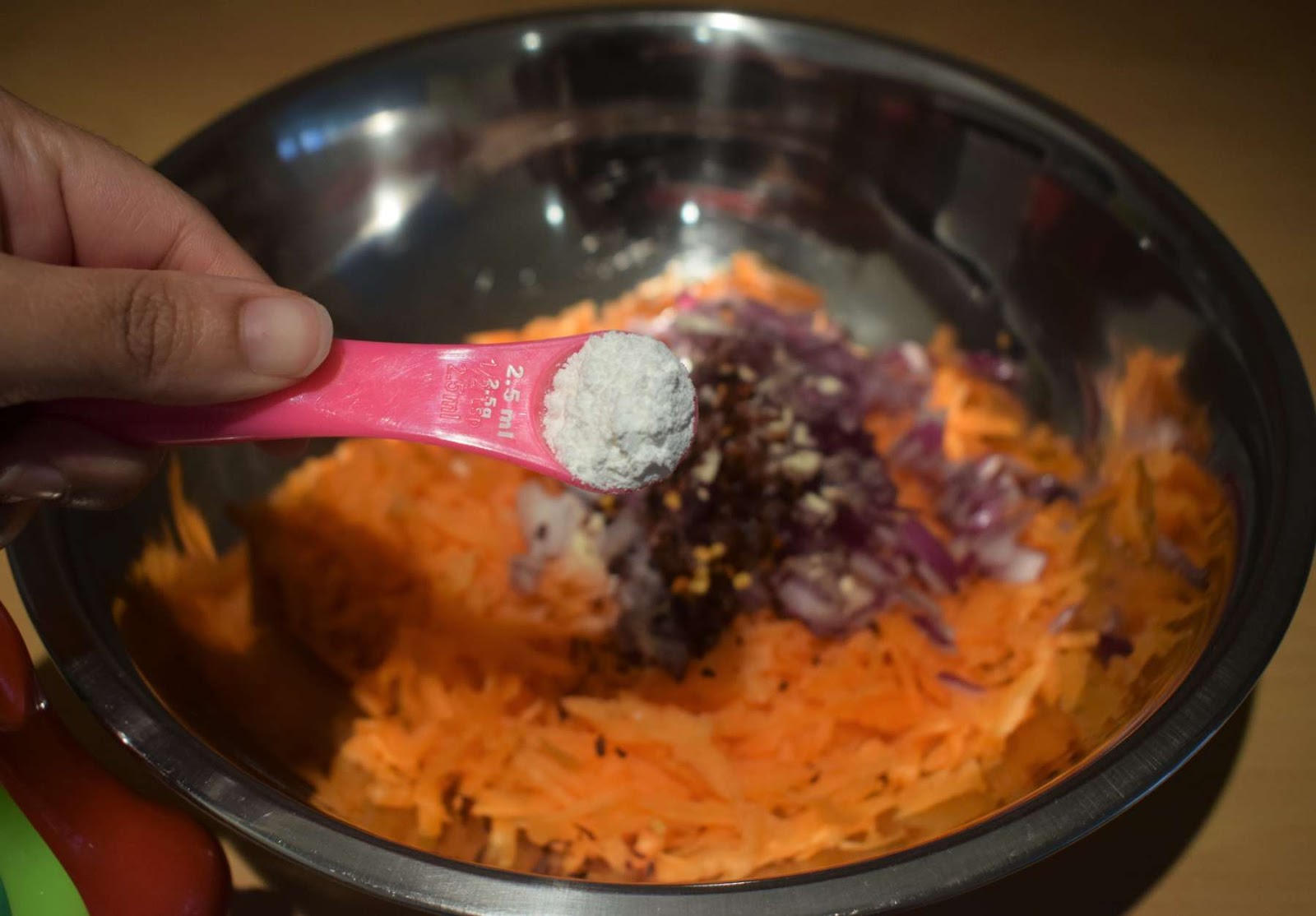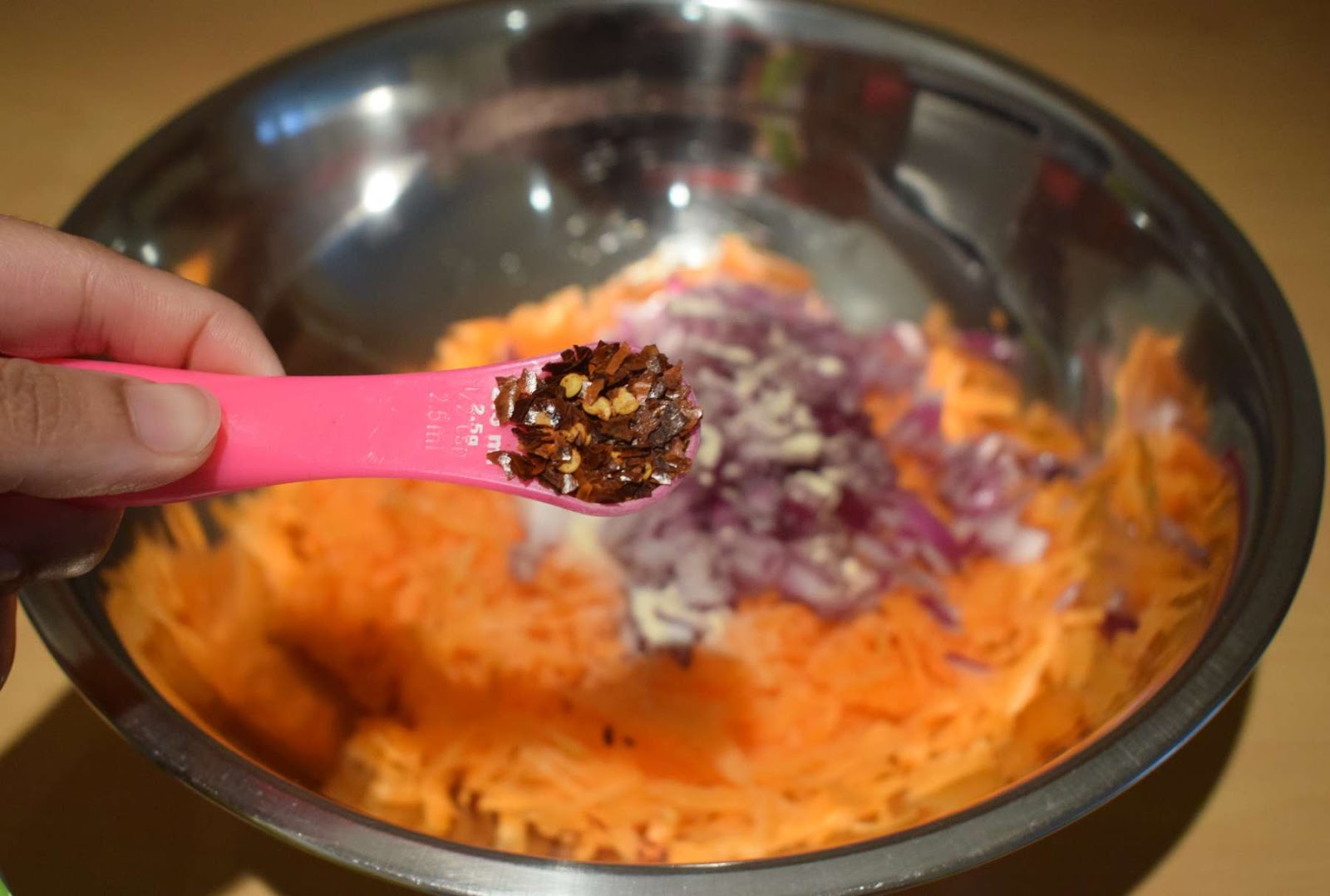 I have used garlic powder, chilli flakes, crushed black pepper and dried parsley for the flavouring of the fritters. If you don’t have garlic powder you can also use garlic paste instead of it. The chilli flakes give a fiery touch to the fritters. If you are preparing these carrot fritters for your kids, you can skip it.