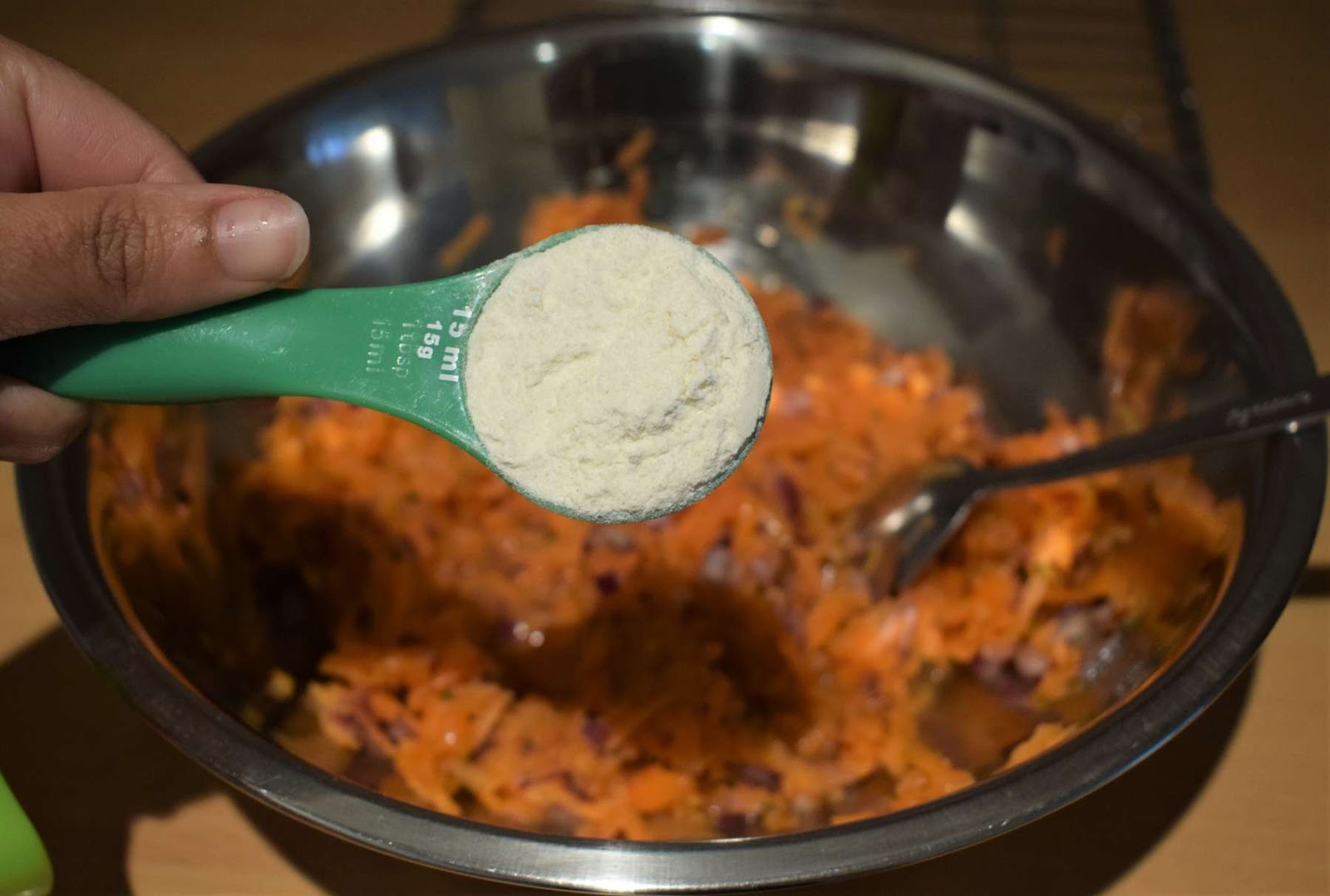 I love fritters but I had never tried it with carrots before. The toughest part of the recipe is to grate the carrots. If you have grater attachment in your food processor then don’t hesitate to use it. I hate this job and pass this work to my husband. Poor husband trapped in lockdown does the work for me. He grated the carrots with the help of a hand grater, and it took him around 7-8 minutes.