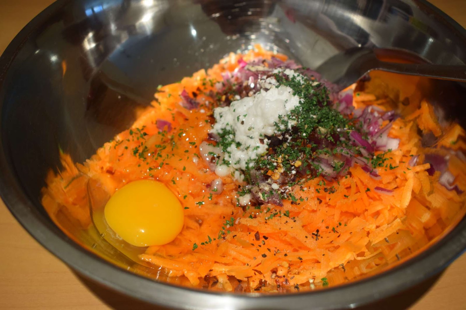 To prepare the carrot fritters, first grate the carrots and take it in a large mixing bowl. Then add finely chopped onions, seasonings, herbs and egg into the mixing bowl and mix all the ingredients thoroughly and wait for 5 minutes for the mixture to release moisture.