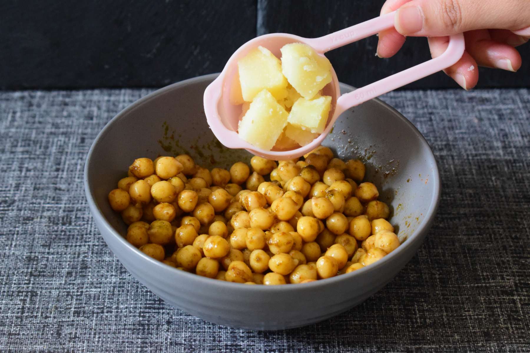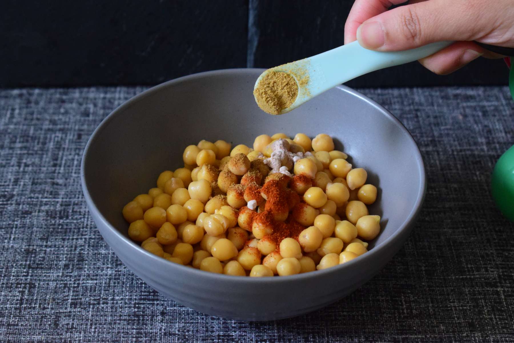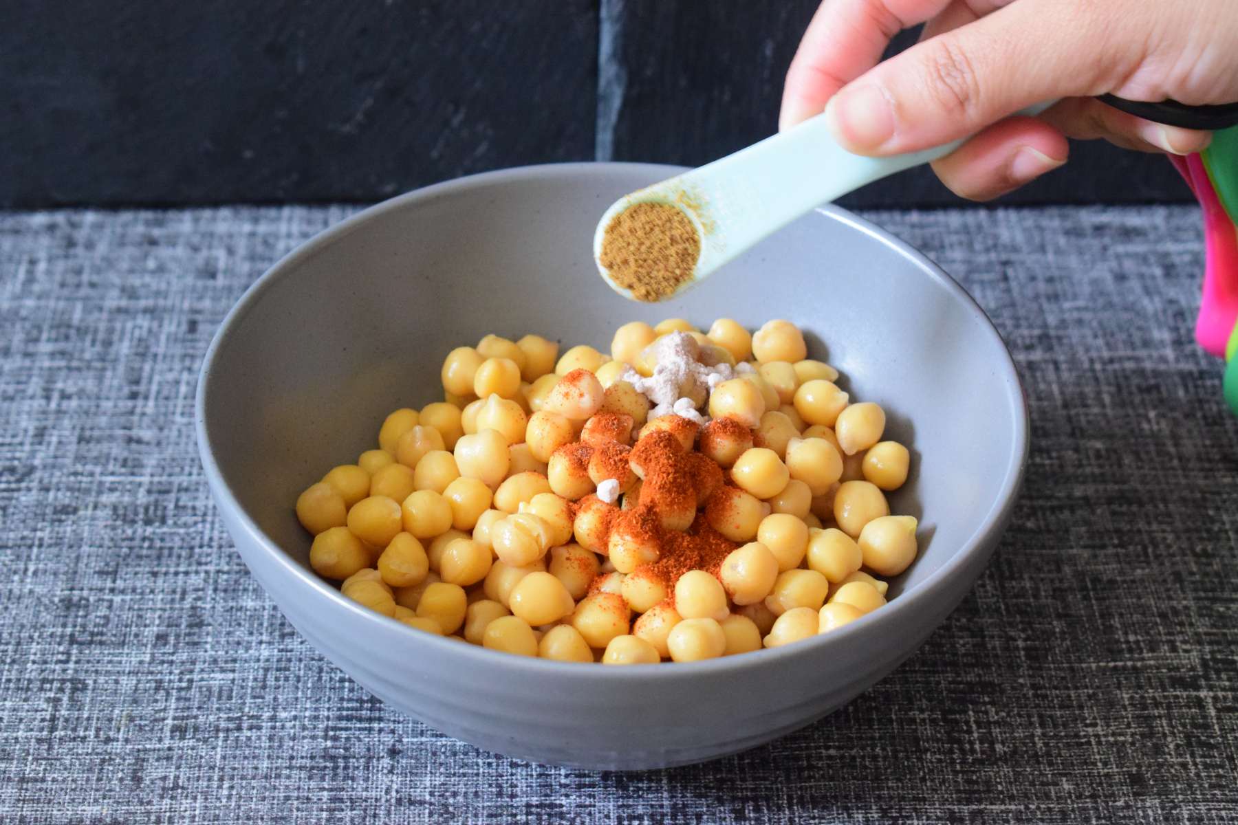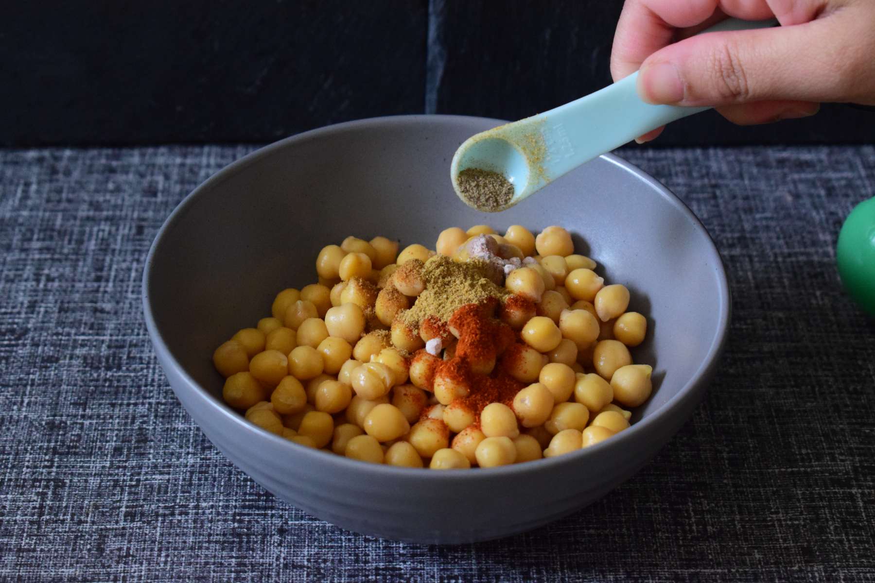 - Stir all the ground spices with the help of a spoon and coat the chickpeas evenly.
