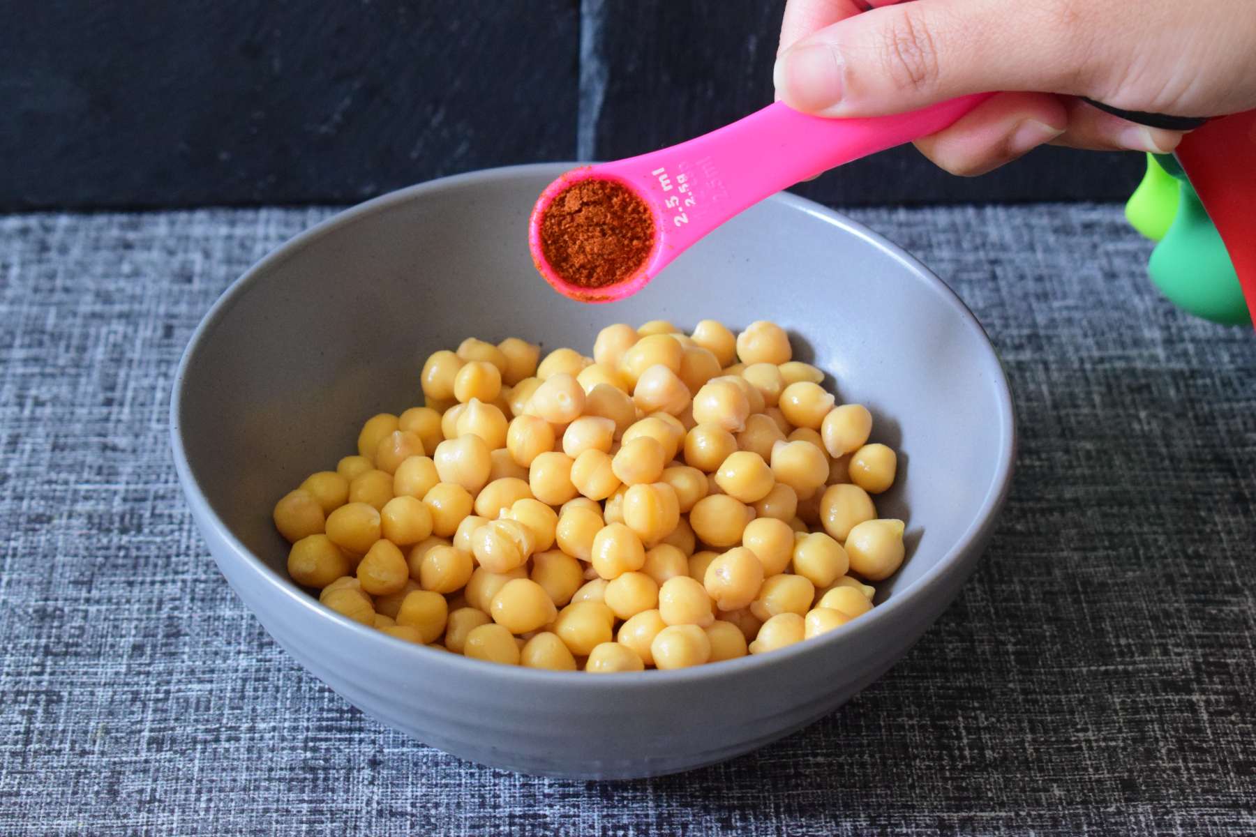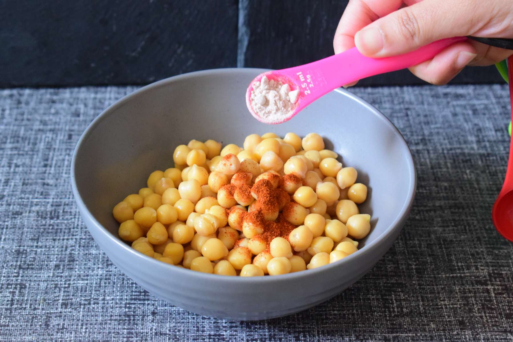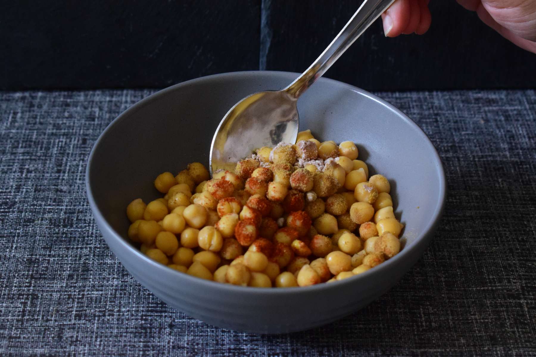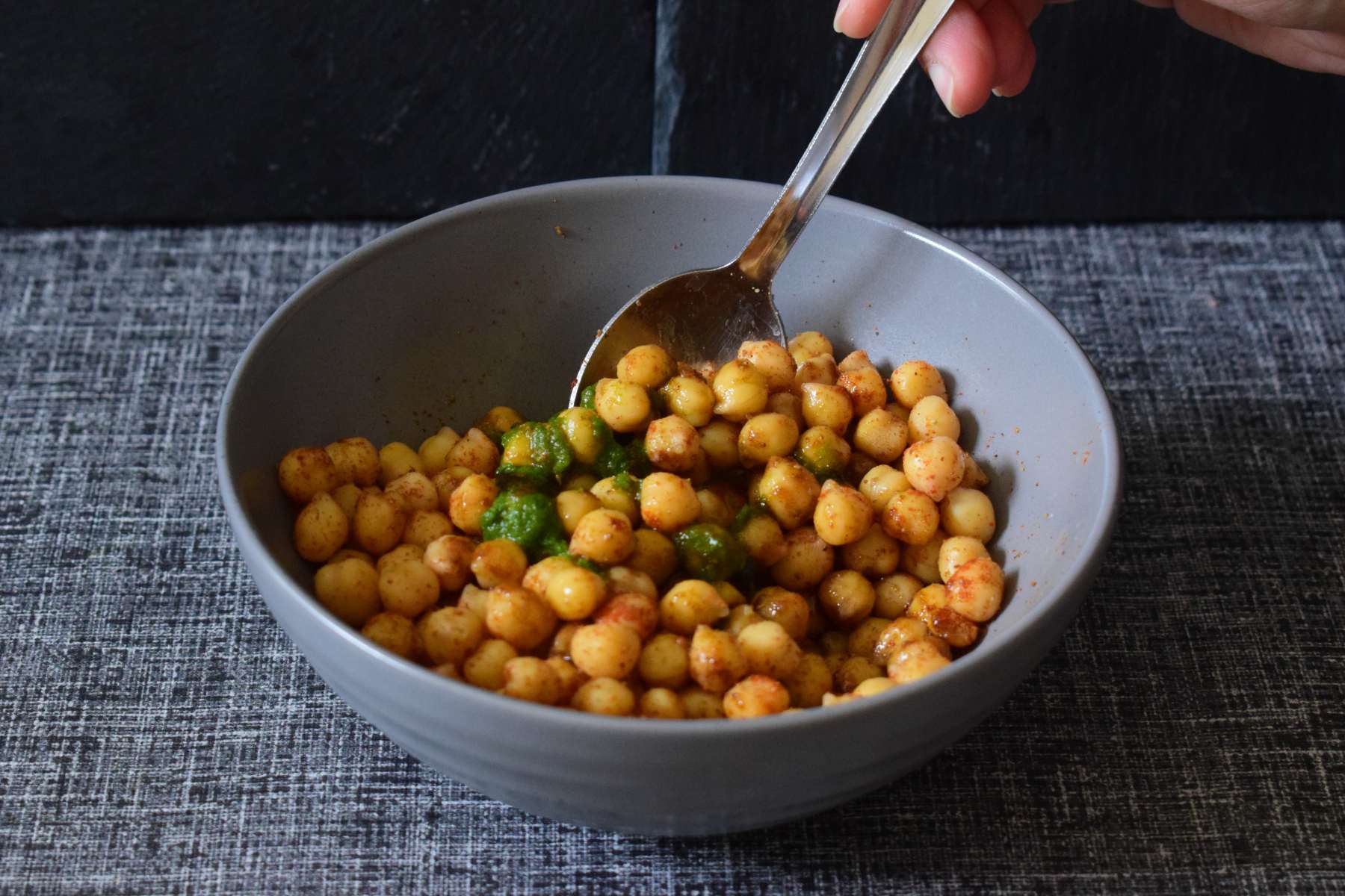- Stir all the ground spices with the help of a spoon and coat the chickpeas evenly.