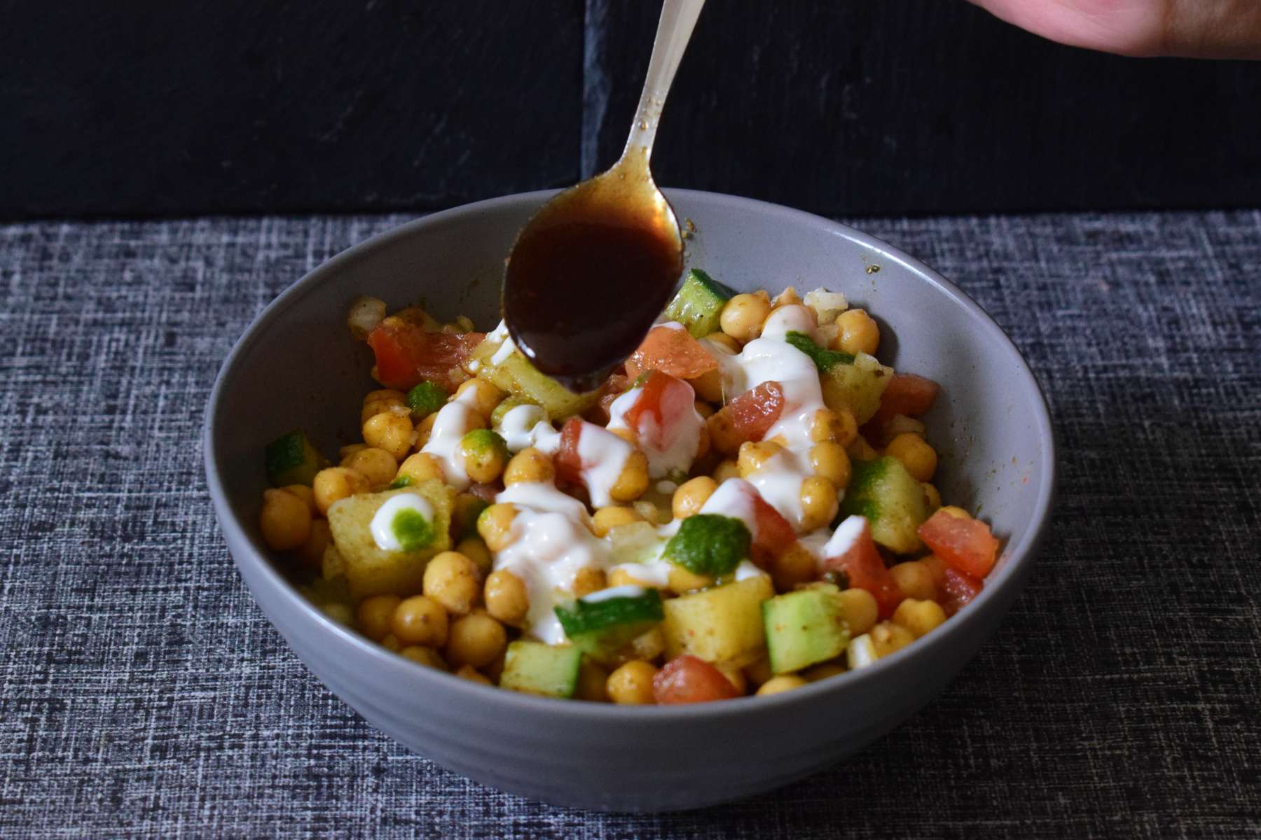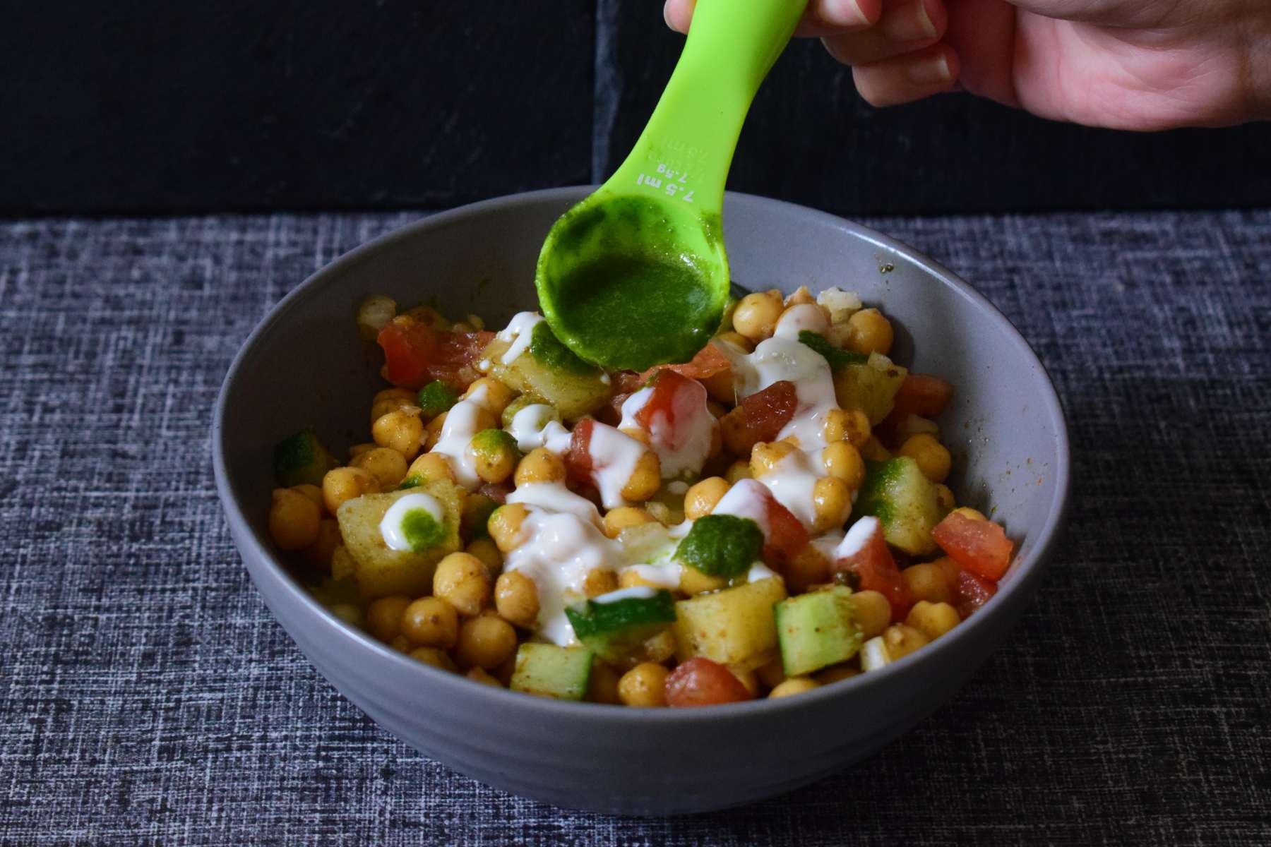 - Drizzle ¼ cup of whipped yogurt mix (Step 8) over the chana chaat.