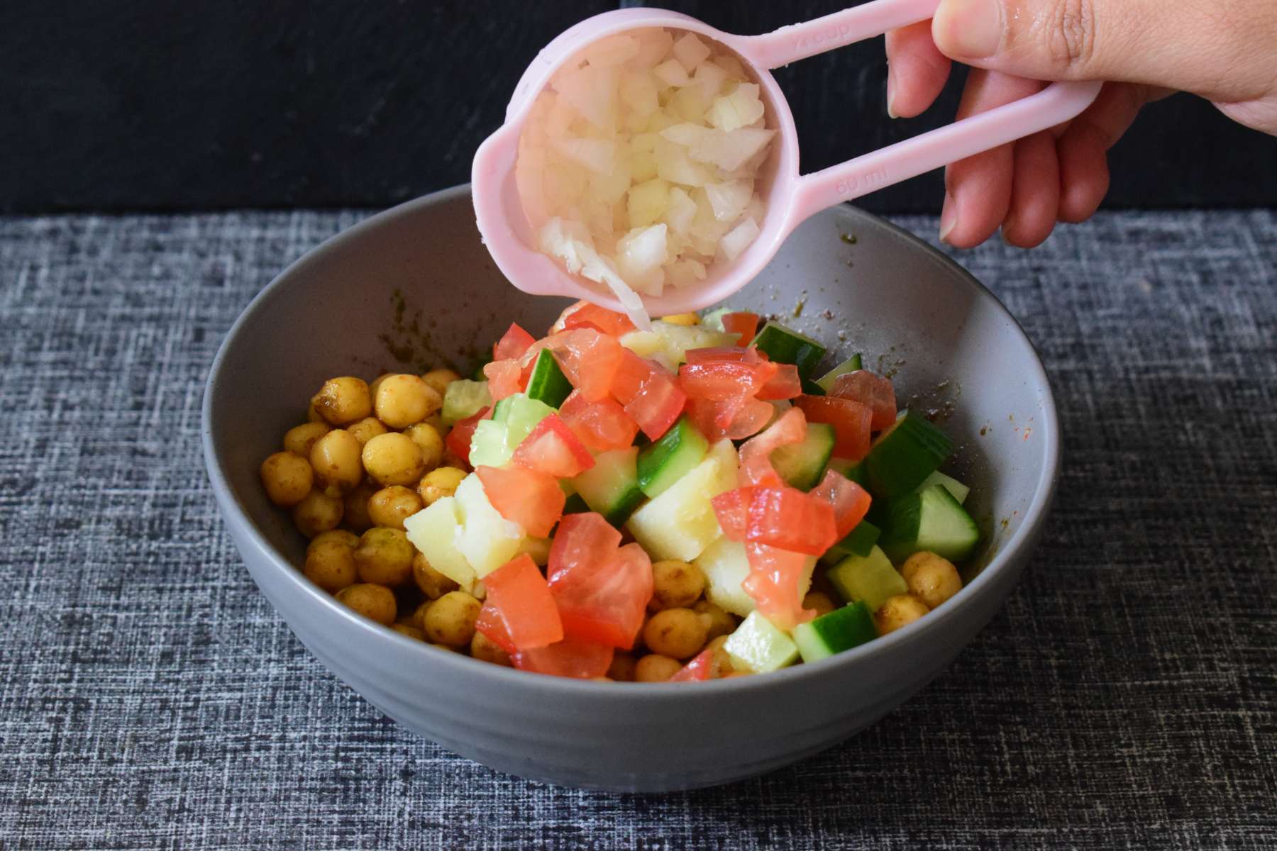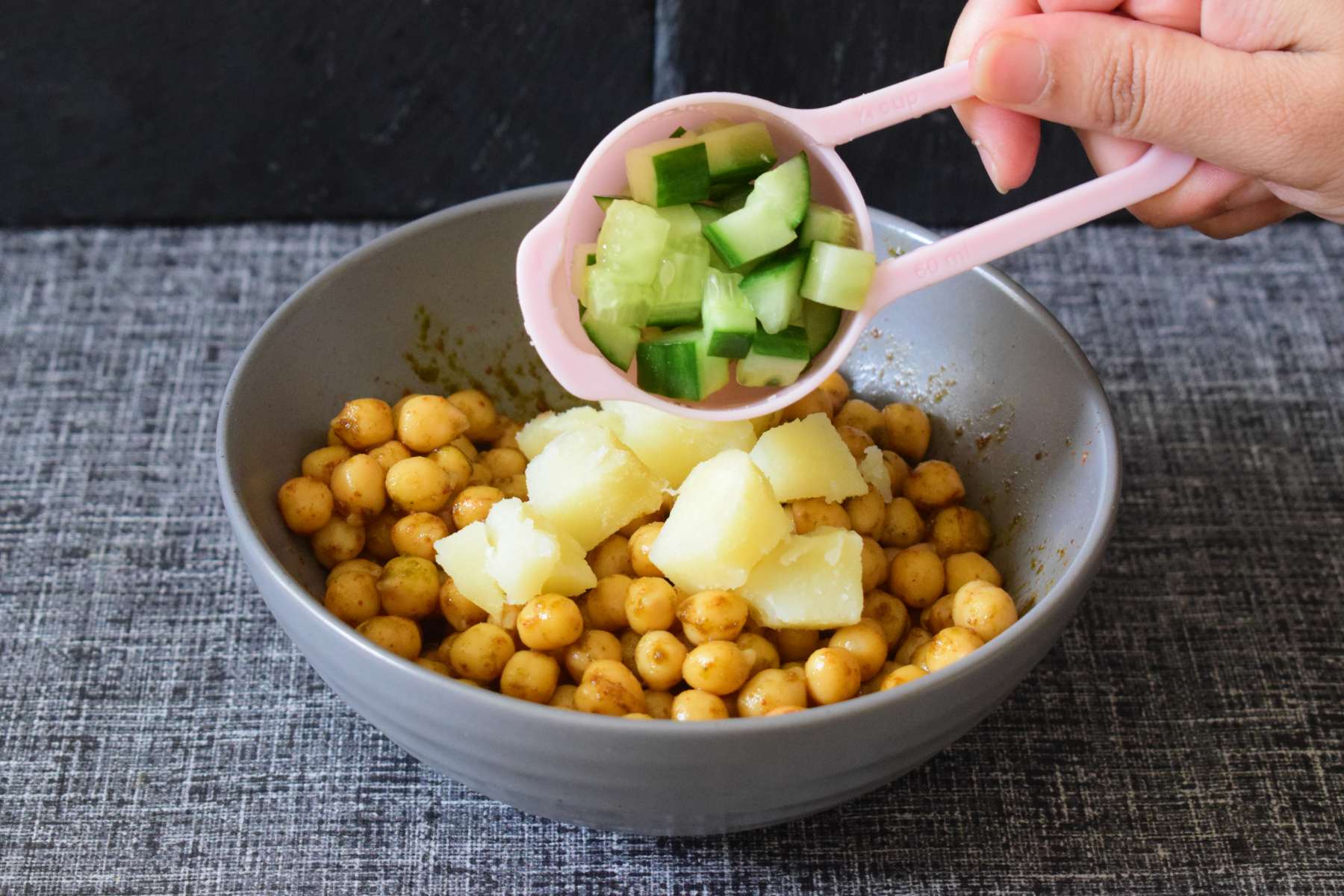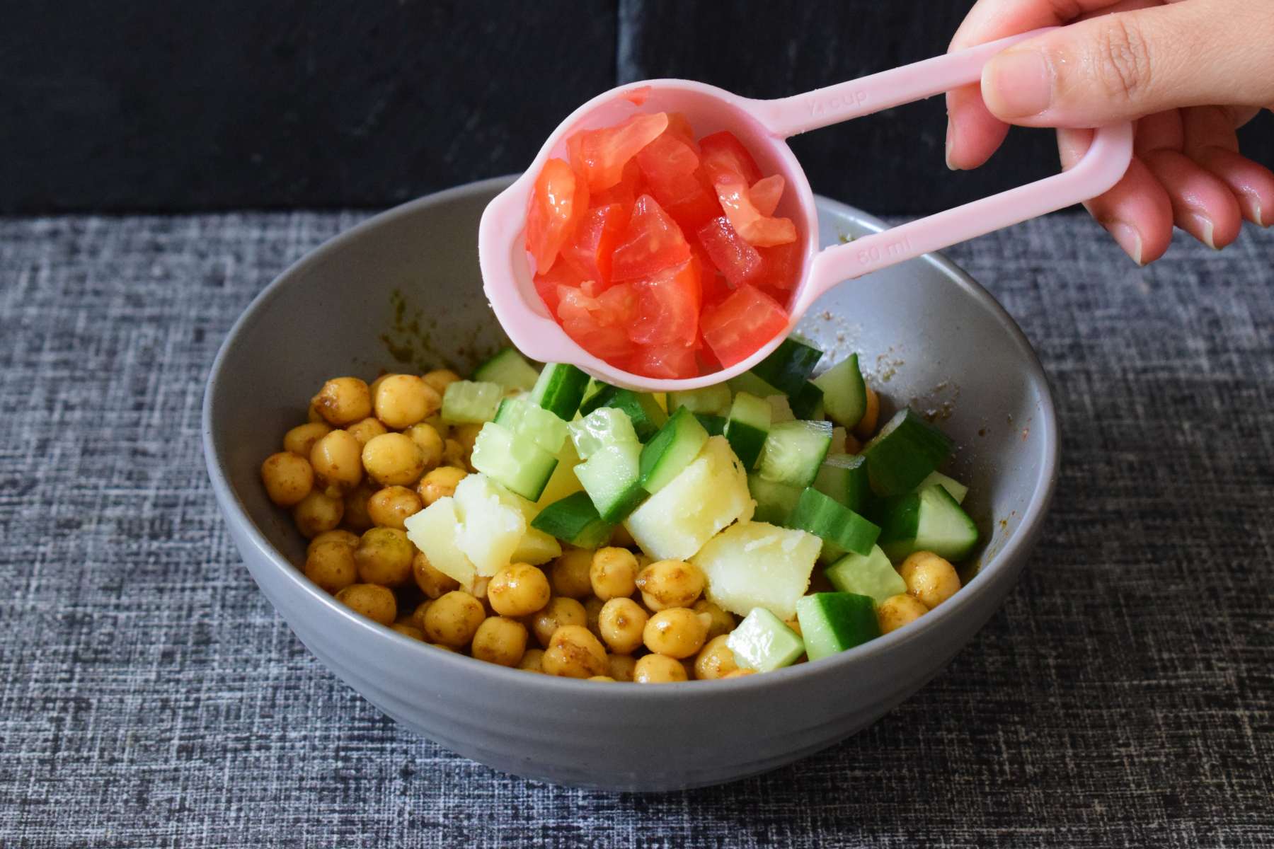 - Add boiled potato, cucumber, tomato, onion into the bowl and mix them nicely.