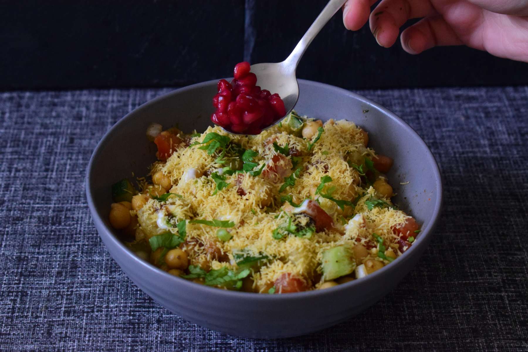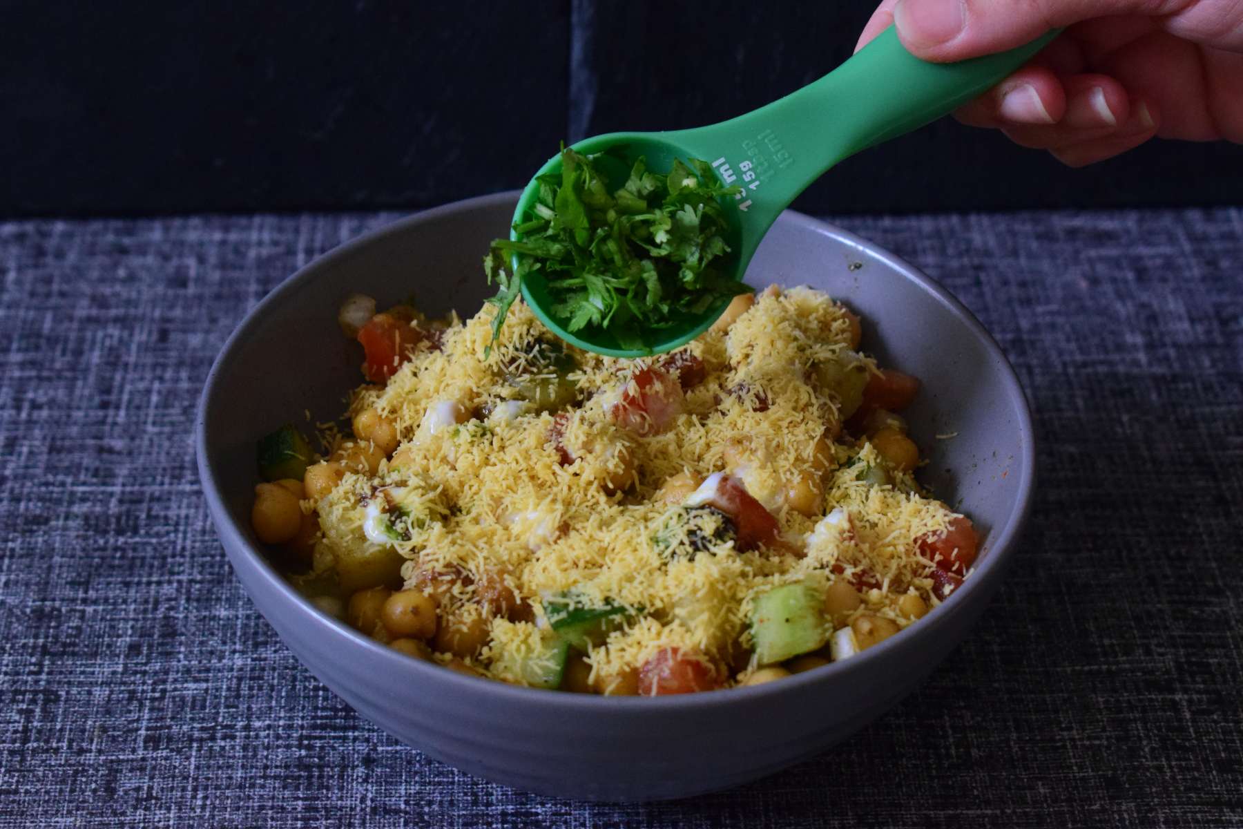 - Sprinkle 2 tablespoons coriander leaves, 1 tablespoon pomegranate seeds on the top. The chana chaat is ready to serve.