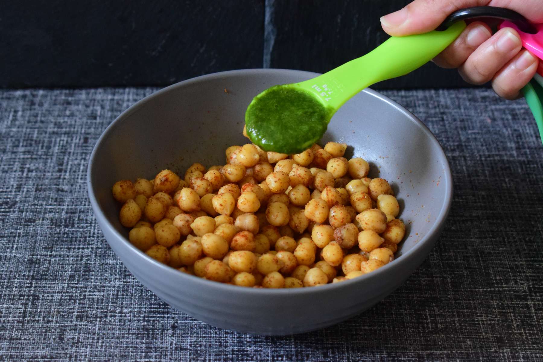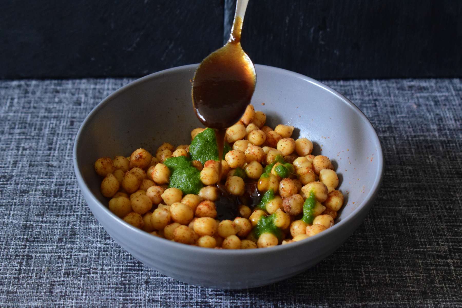 - Drizzle ½ tablespoon green chutney and 1 tablespoon tamarind chutney into the bowl.
