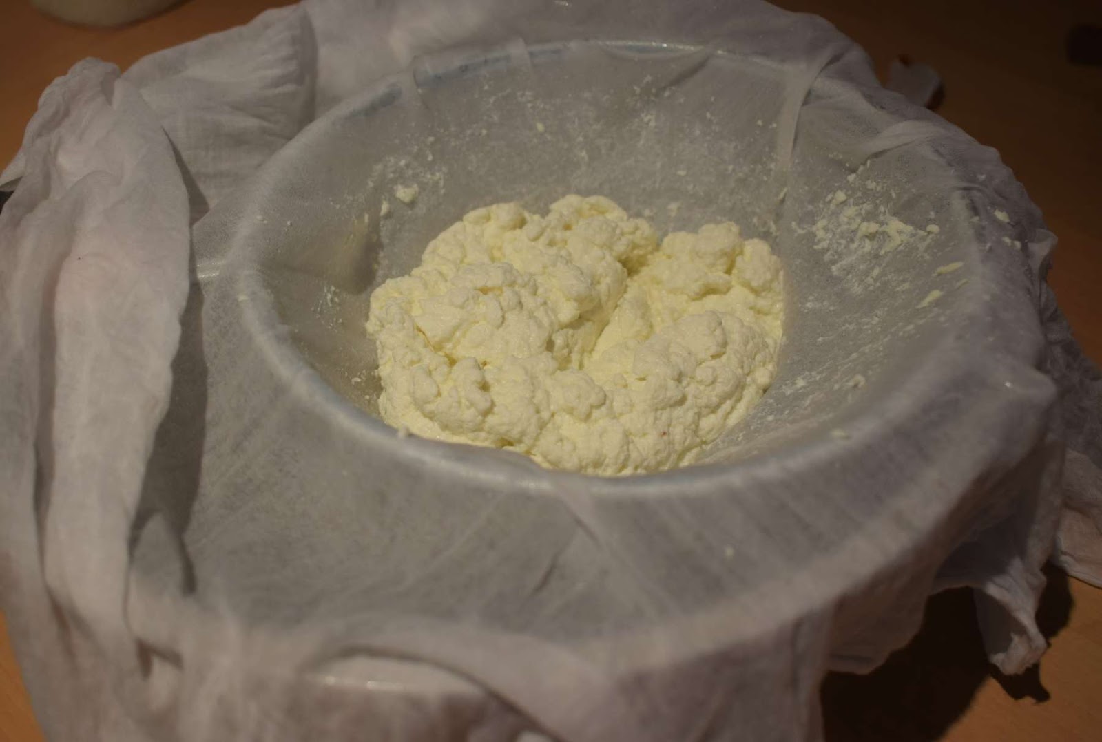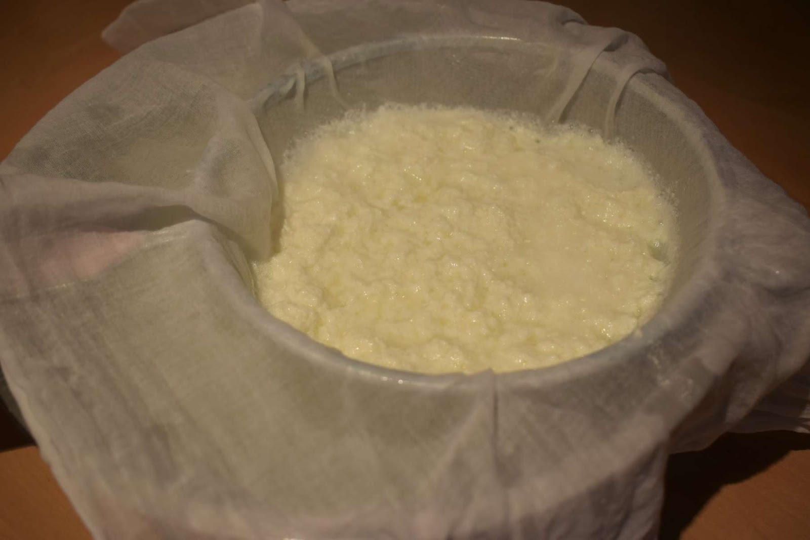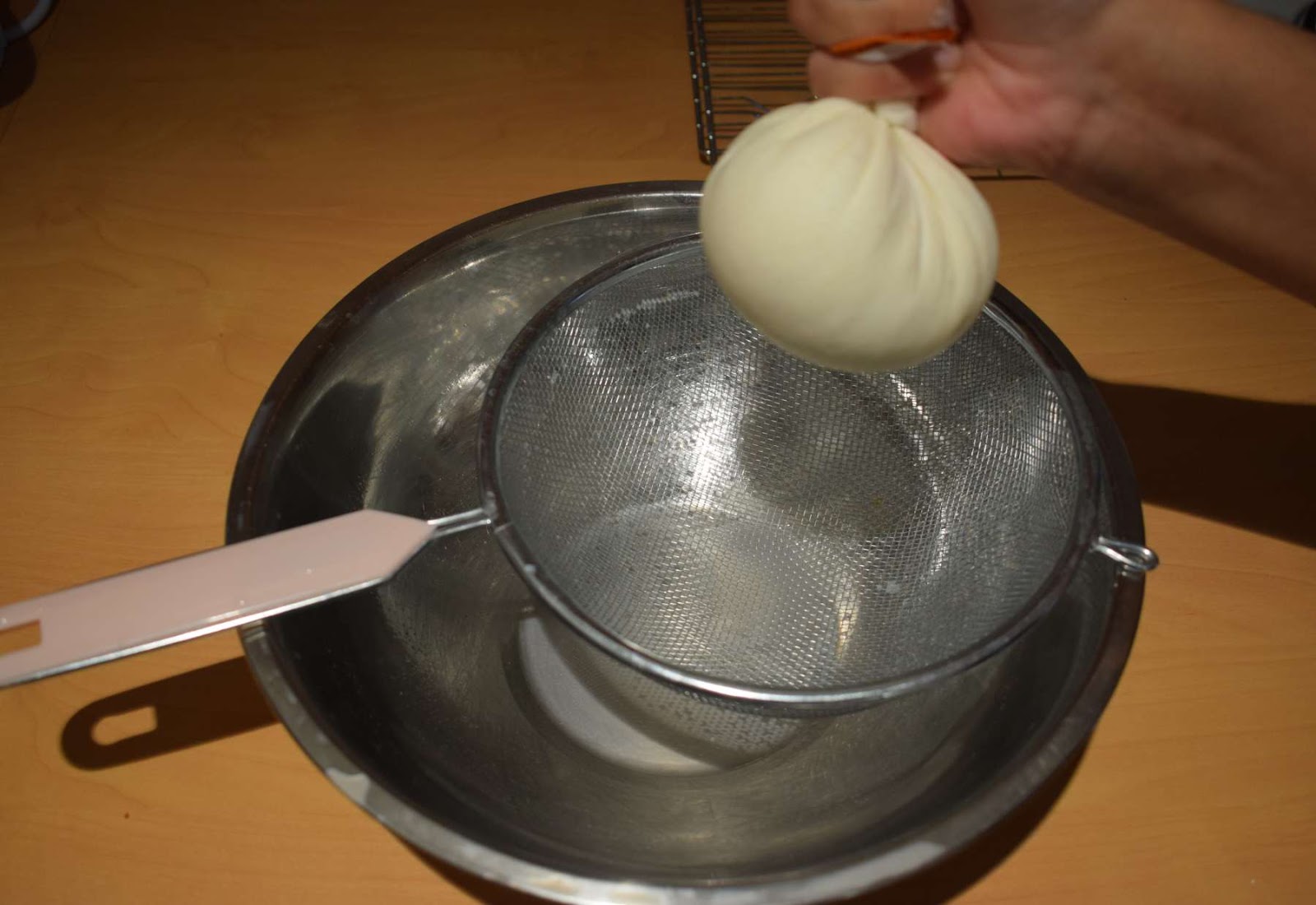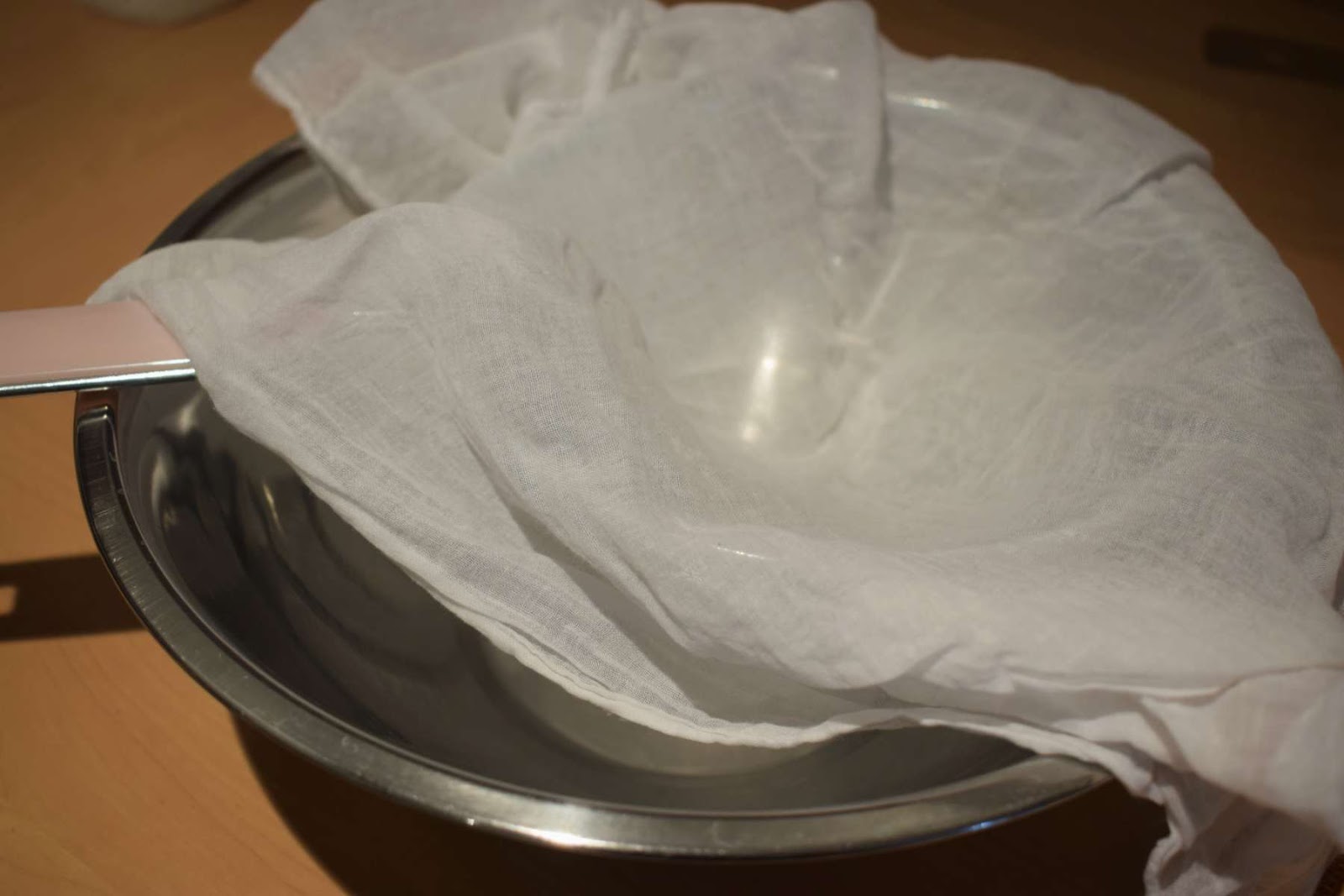 - Strain the water of the curdled milk with the help of a Muslin cloth.