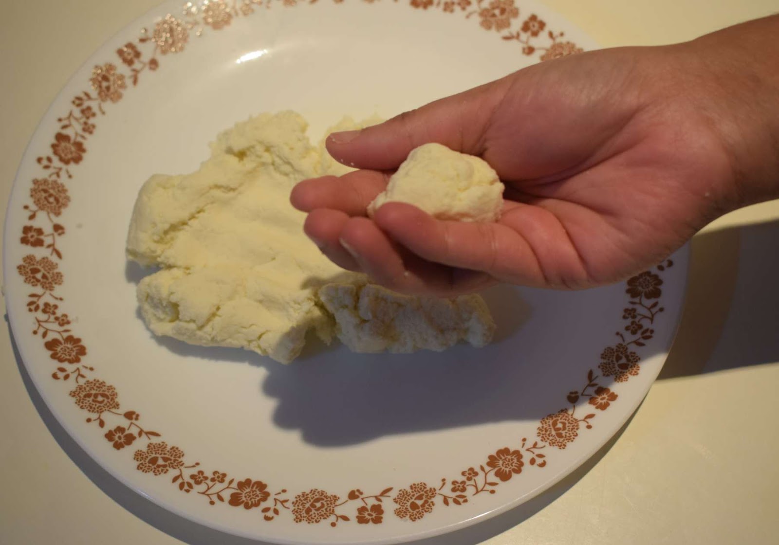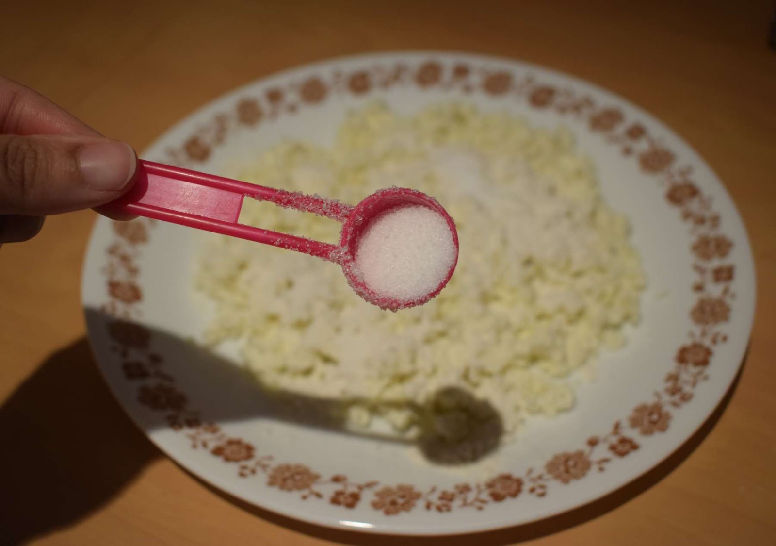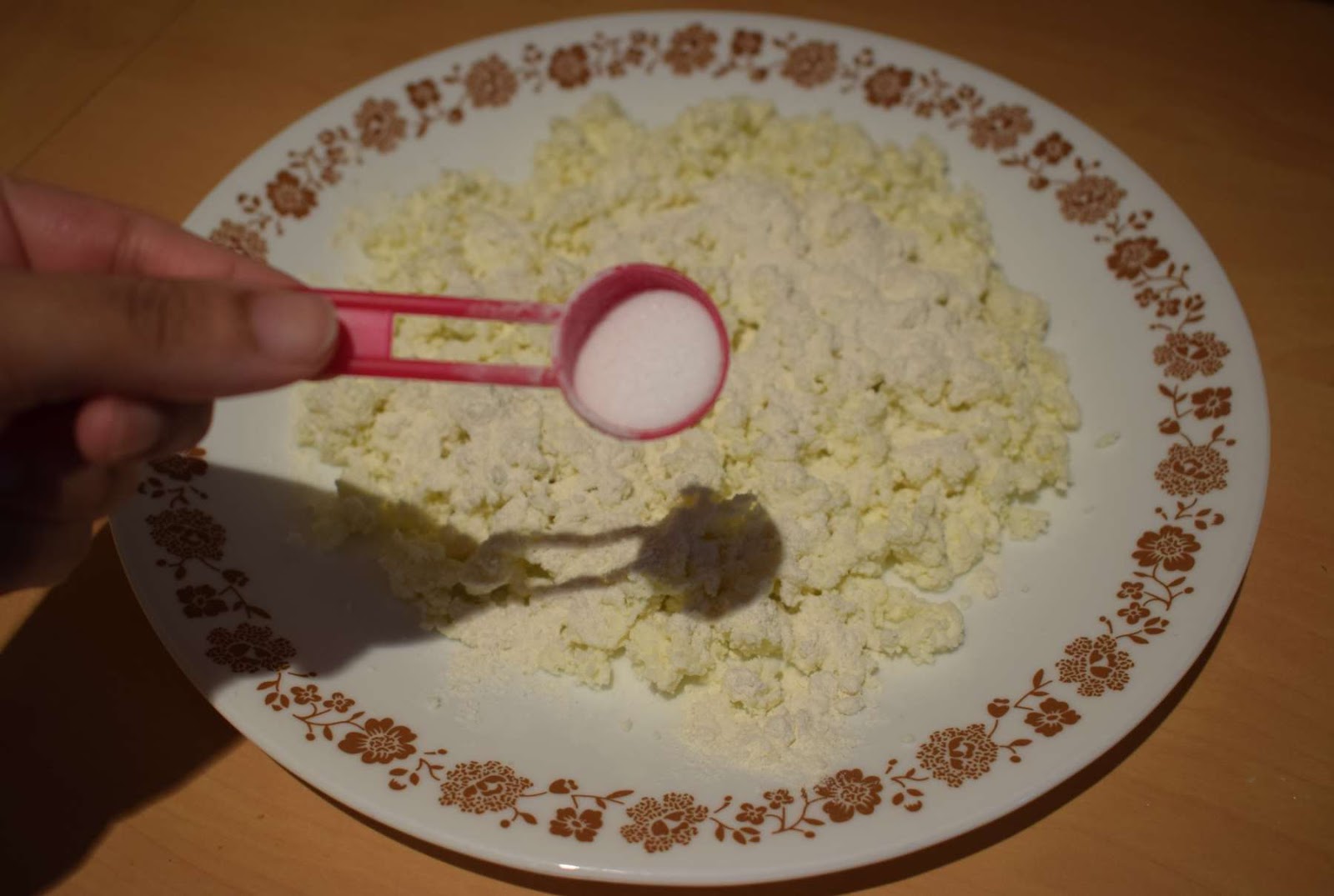 - Add all-purpose Flour, Sugar, Salt one by one into the chenna and mix it nicely with the help of your hand.