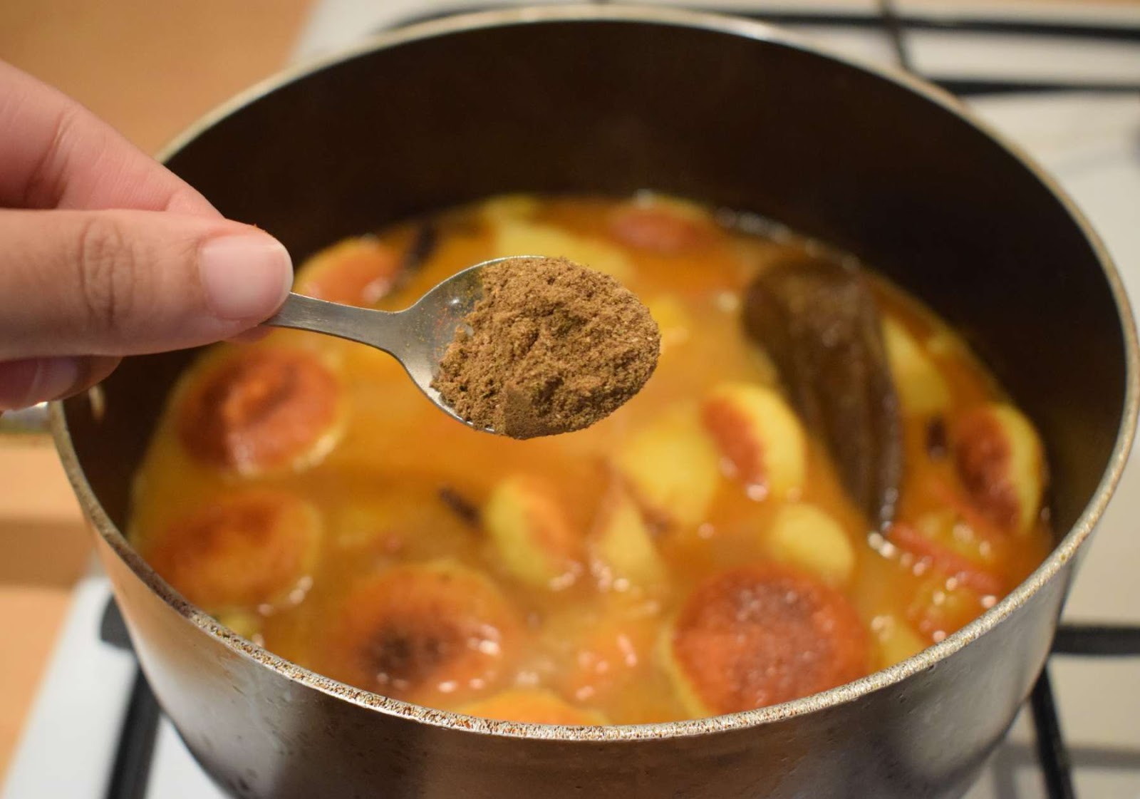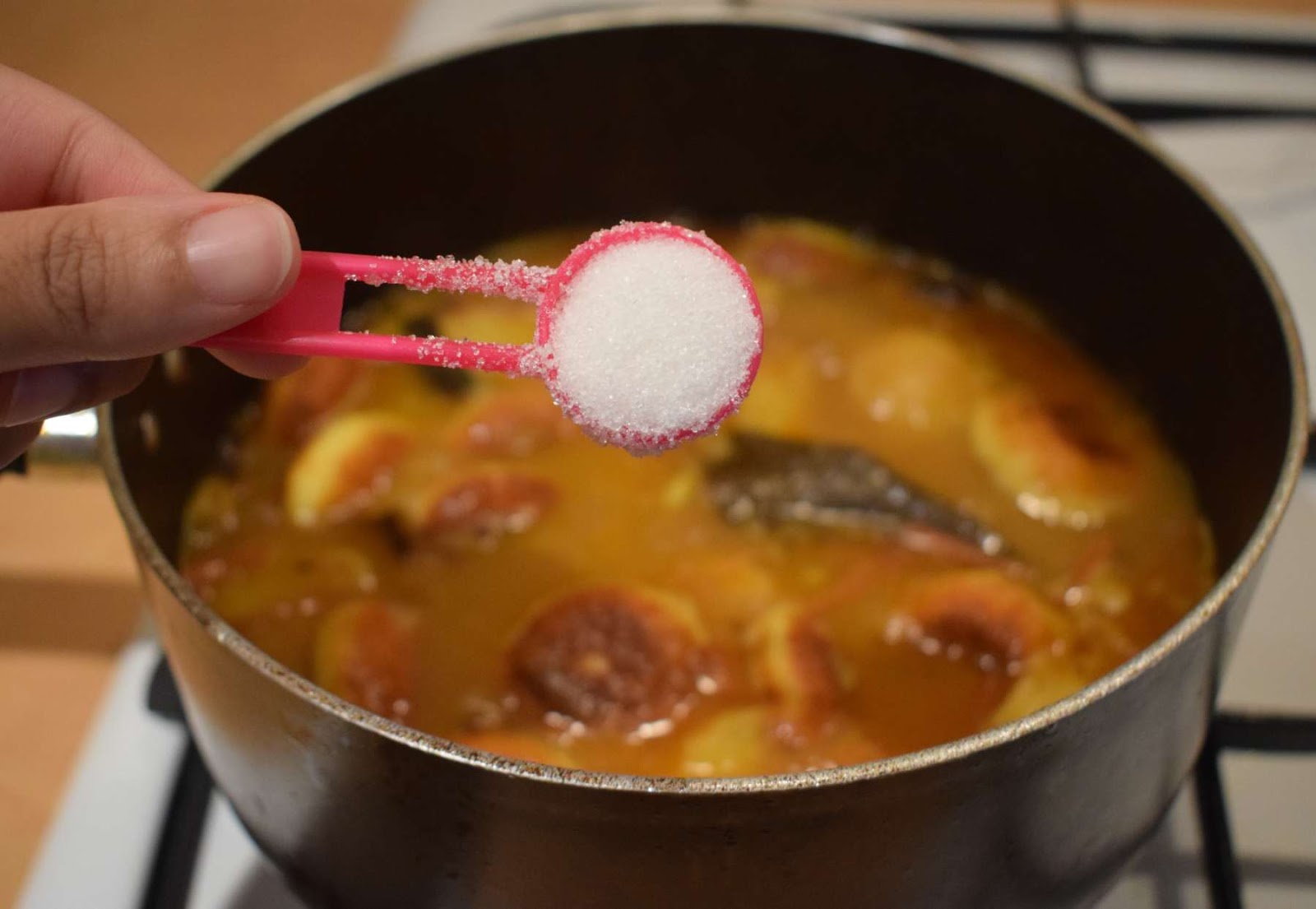 - Add sugar, Bengali garam masala powder into the pan and cook it in lowest flame for a minute.