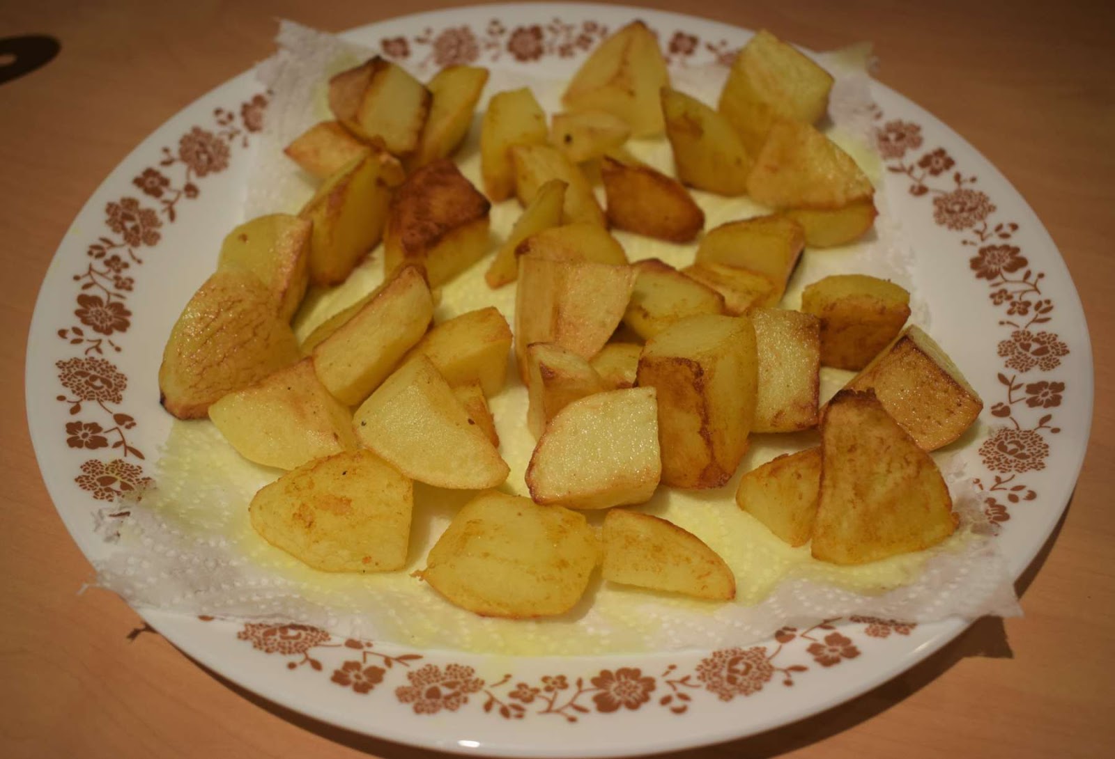 - Shift the potato chunks on a tissue lined plate. The tissue will absorb the excess oil.