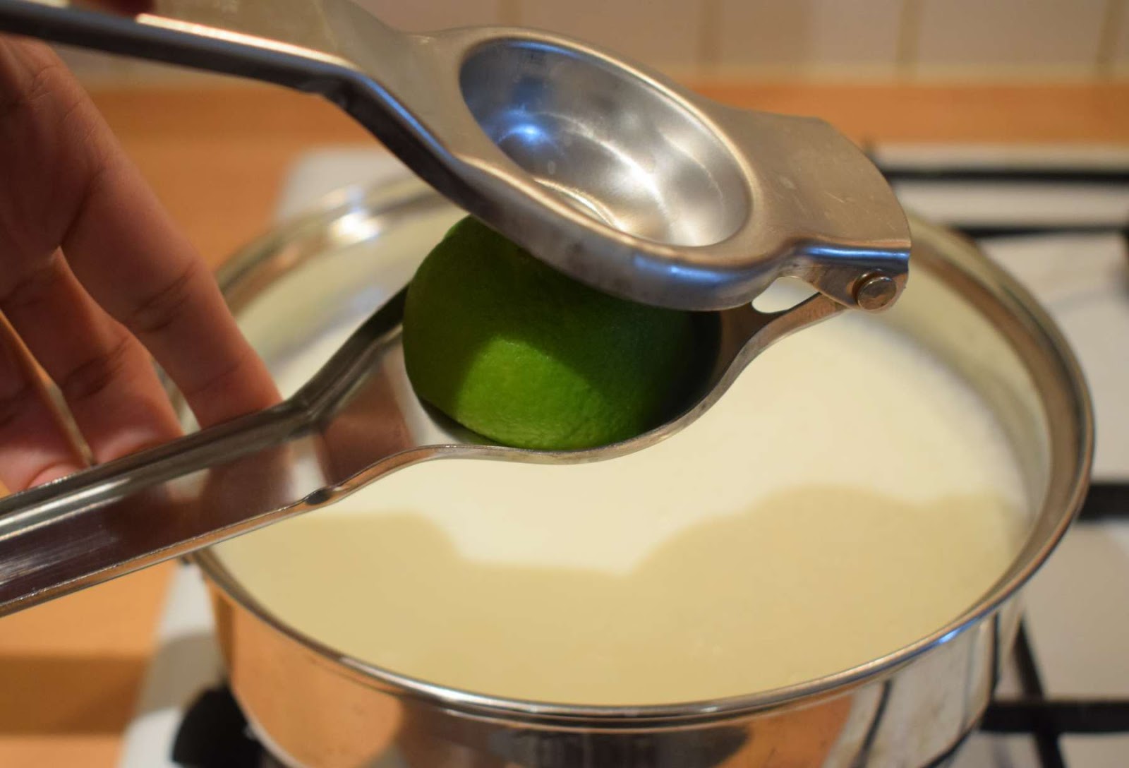 - Squeeze out the lemon juice into the milk with the help of a lemon squeezer.