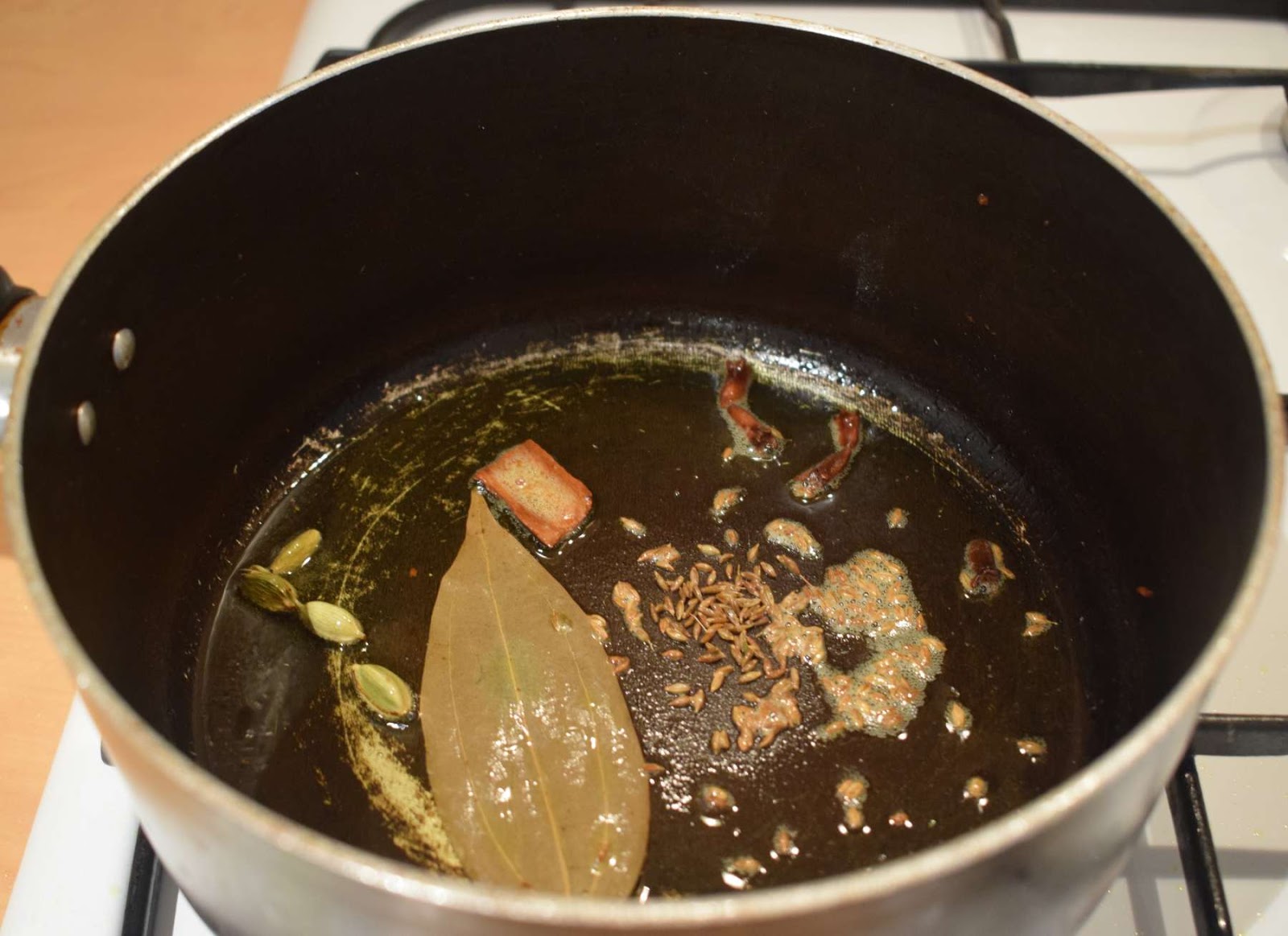- Once the oil is hot add Cumin seeds, Cinnamon stick, Cardamoms, Bay leaves, Cloves and let them crackle.