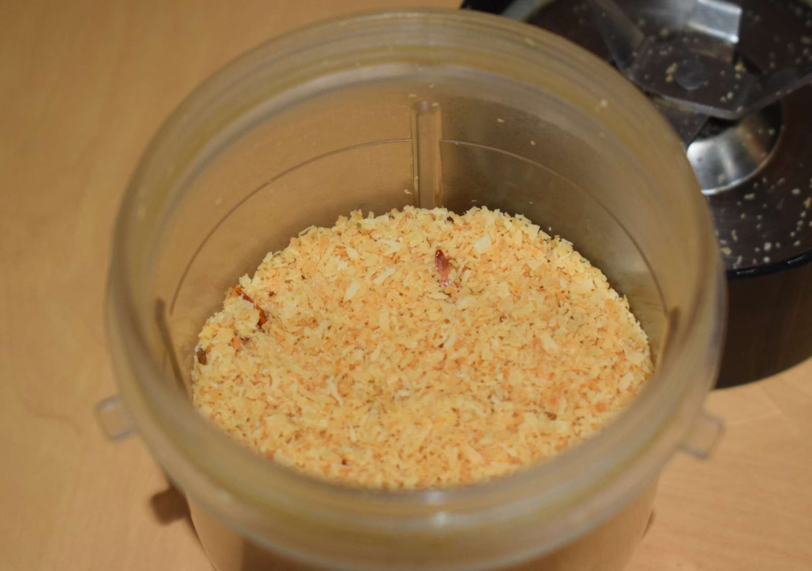 - Transfer the whole spices and coconut into the jar of a grinder.