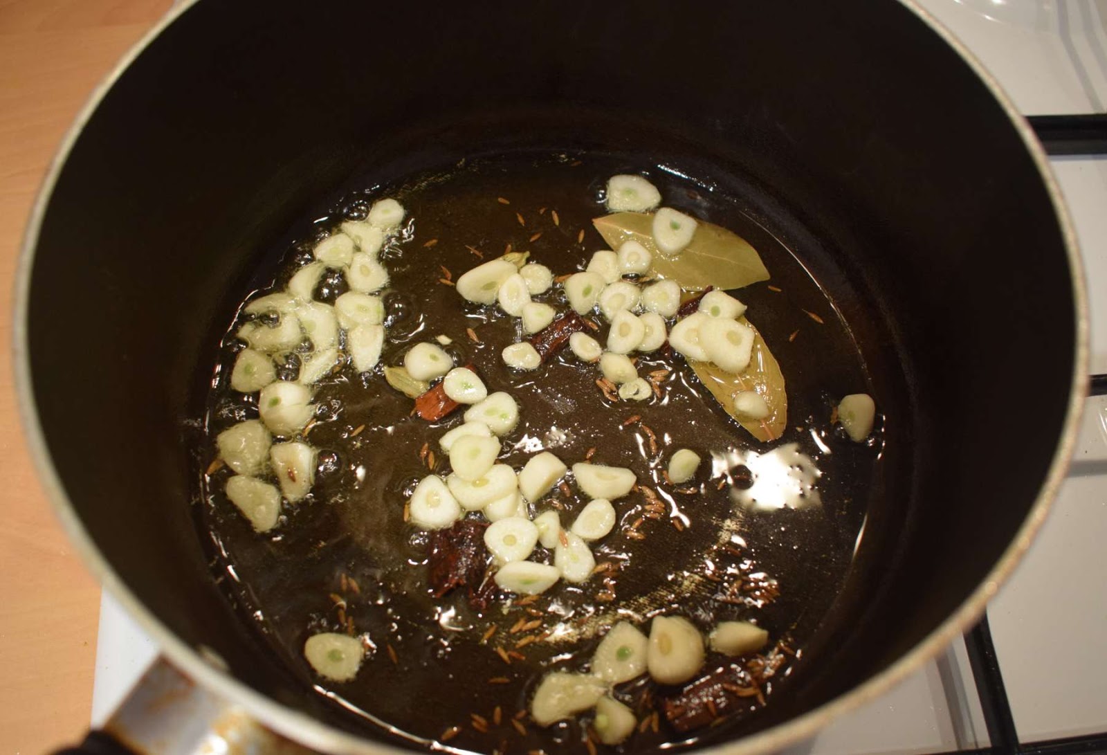 For the chicken with curry recipe, I have tempered whole spices Cinnamon sticks, Cardamom, Cloves, Bay leaves and Cumin seeds. Then I have added sliced Garlic into the oil to make oil aromatic.