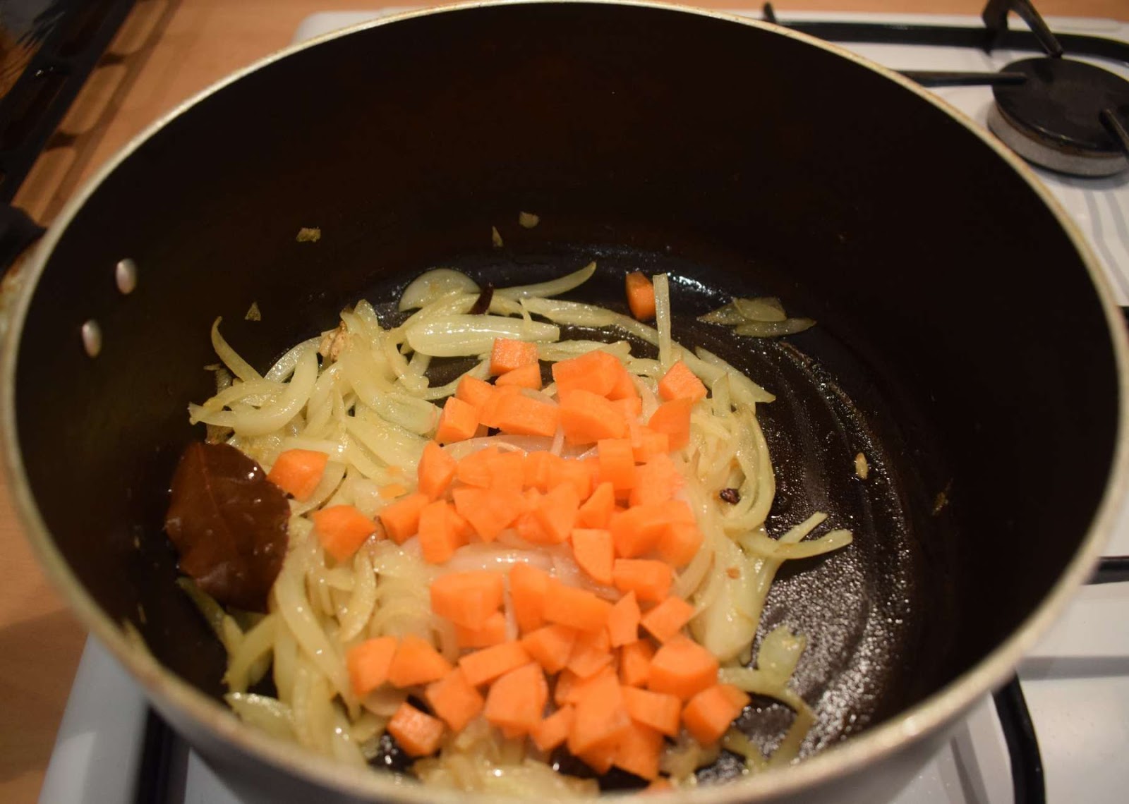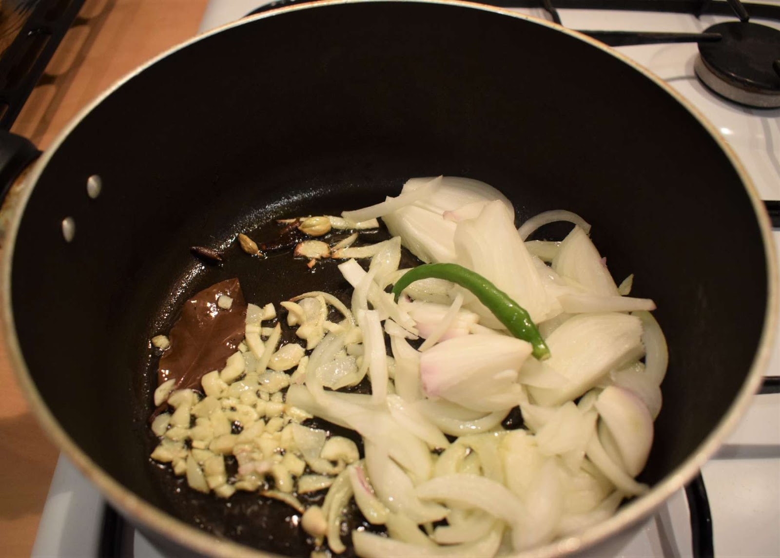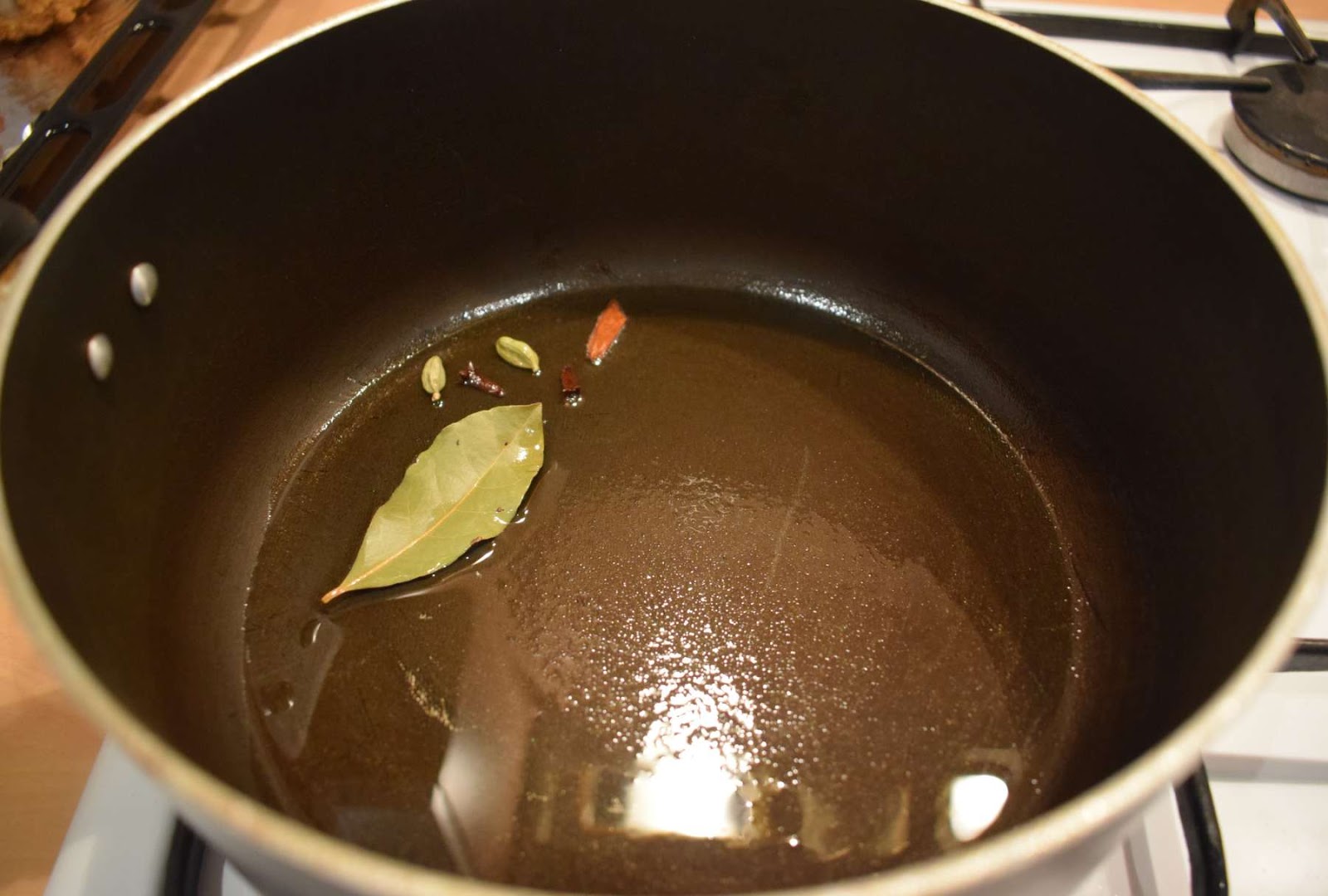- Once the Oil is hot, add Bay Leaf, Cinnamon stick, Cardamoms, Cloves and let them crackle.