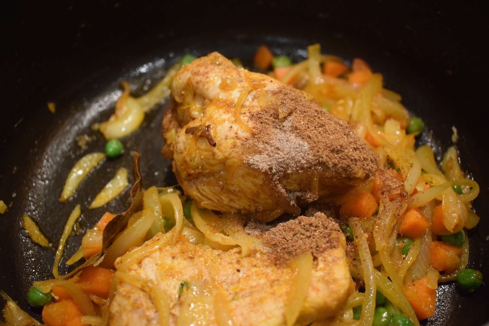 - Add the Chicken pieces into the pan.