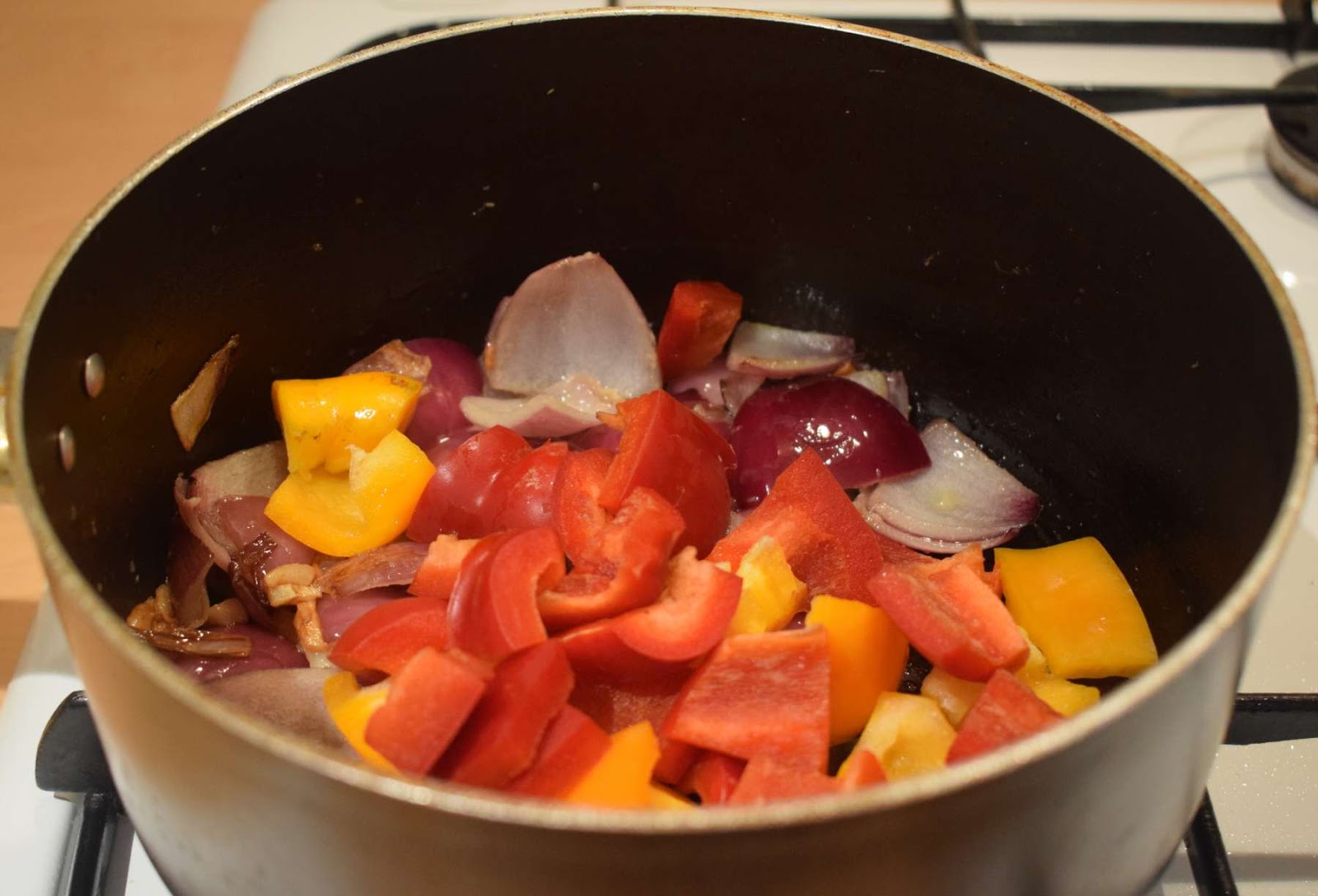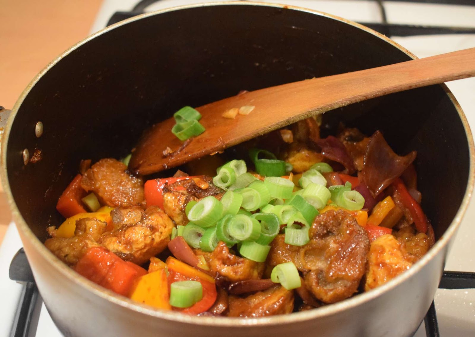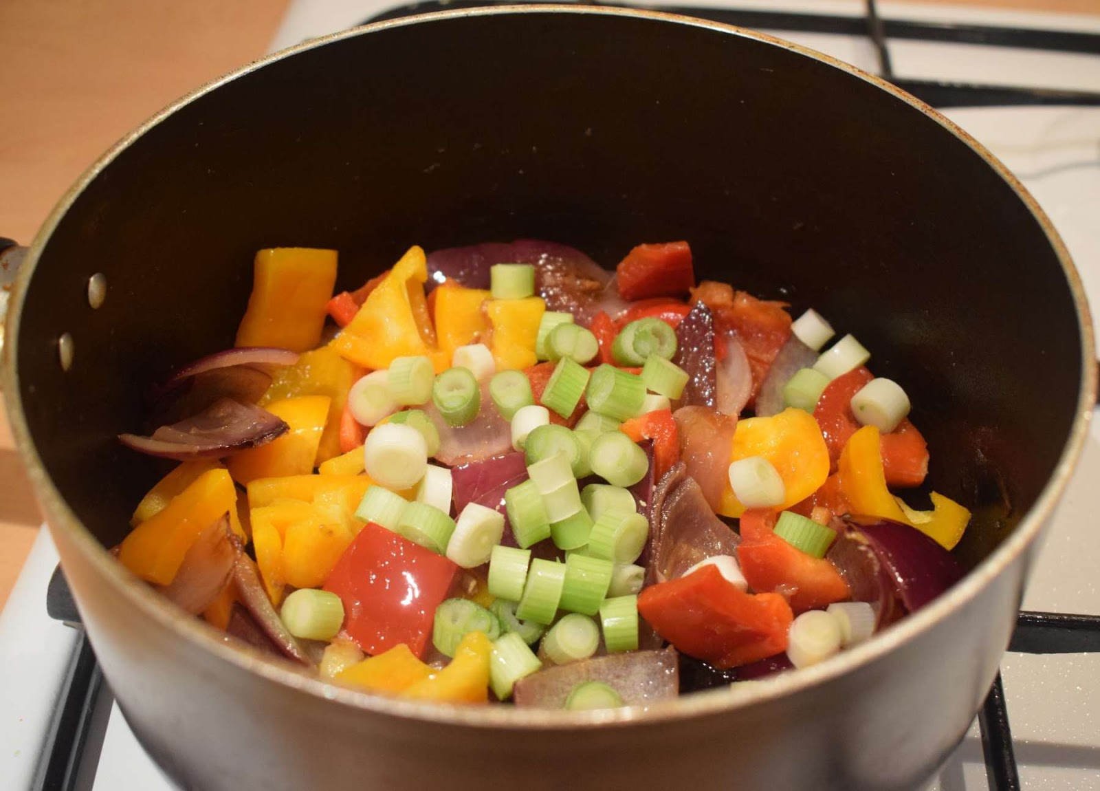 - Add white parts of the Spring Onions into the pan and give a mix.
