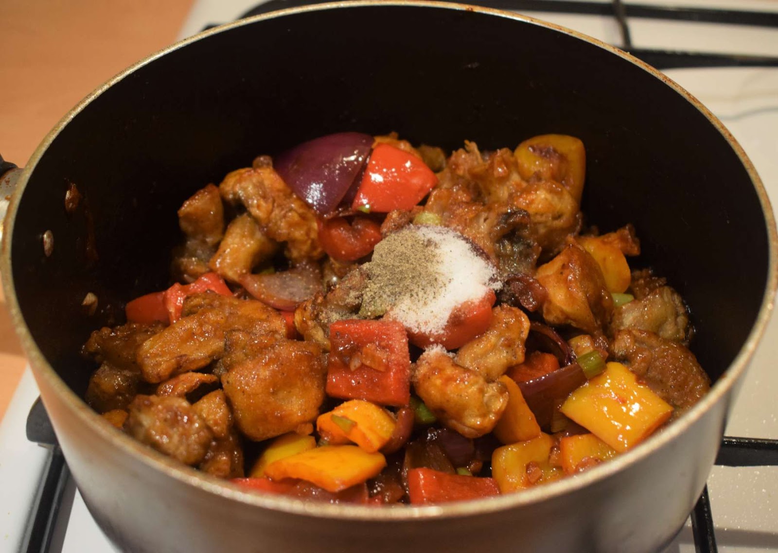 - Add Salt, Sugar and crushed Black Pepper into the pan and give a nice mix.