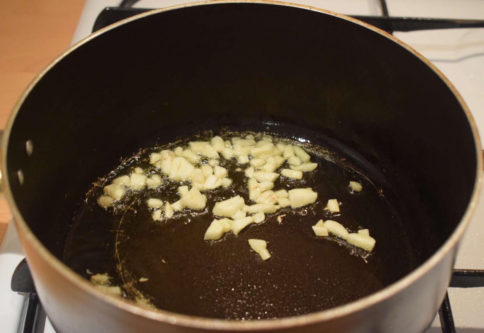 - Once the oil is hot, add Garlic into the pan and fry them till golden.