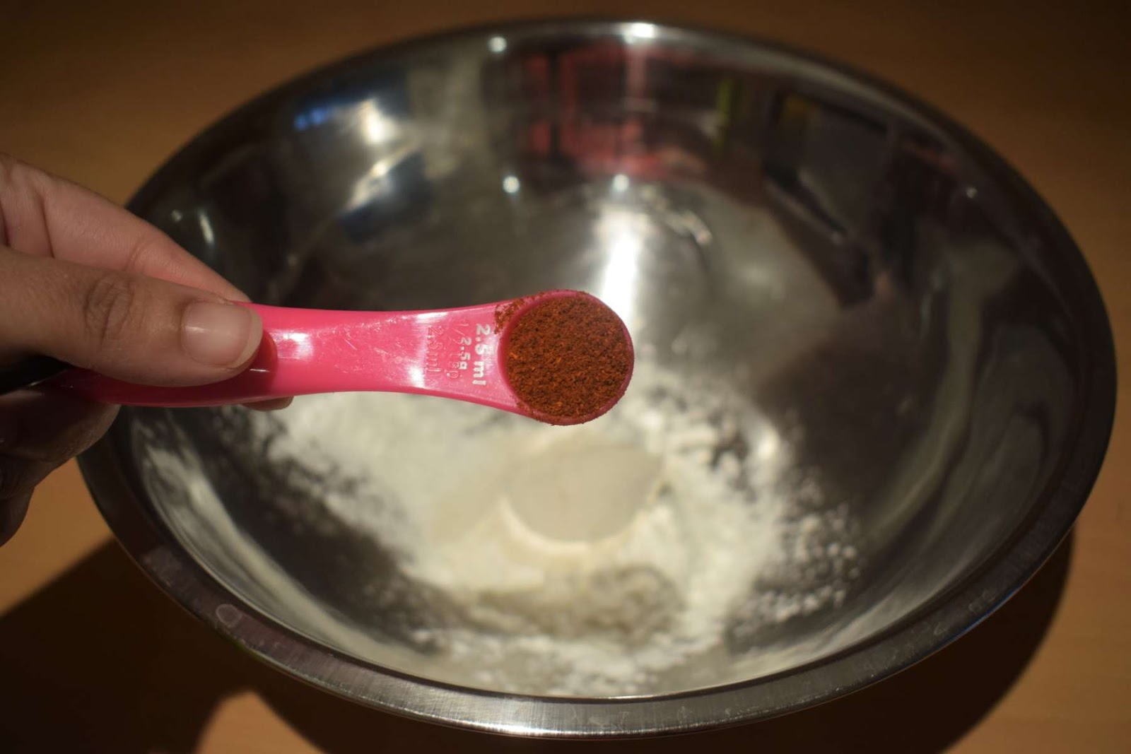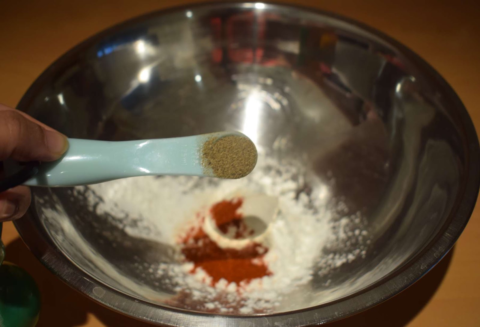 - Add Black Pepper powder and red Chilli powder into the bowl.
