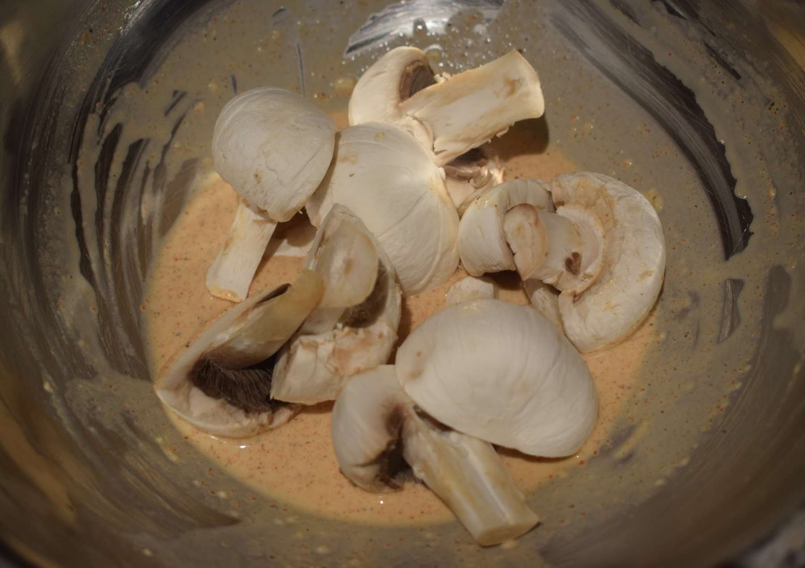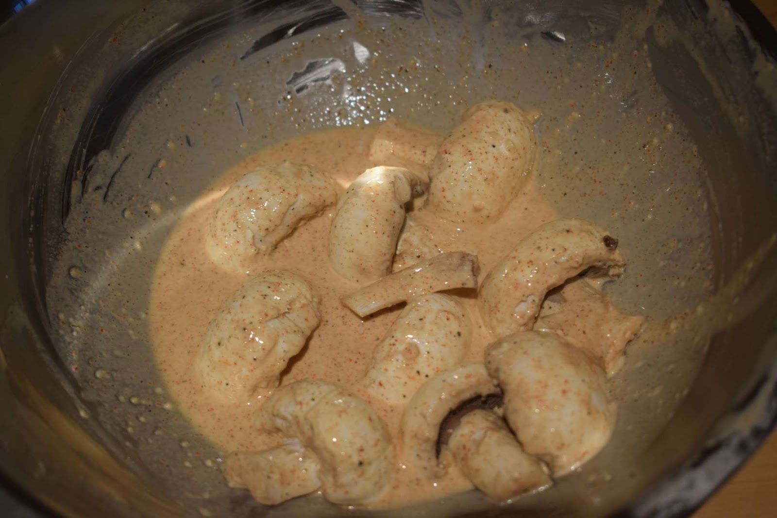 I have added black pepper, red chilli powder, salt and ginger-garlic paste into the batter. It gives a nice flavour and taste to the mushroom nuggets.
