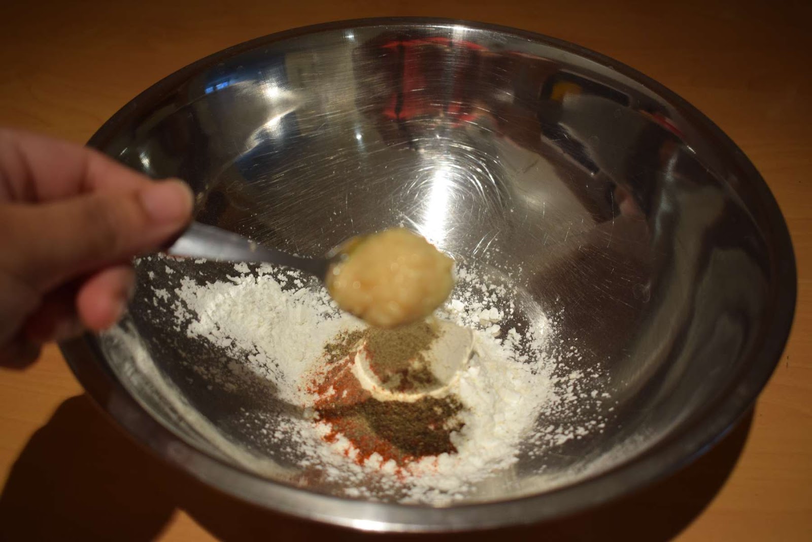 - Mix all the Ingredients and add little water at a time and mix it. Make a smooth and lumps free batter. I have used ¼ cup of water for the batter. The consistency of batter should be slightly thick.