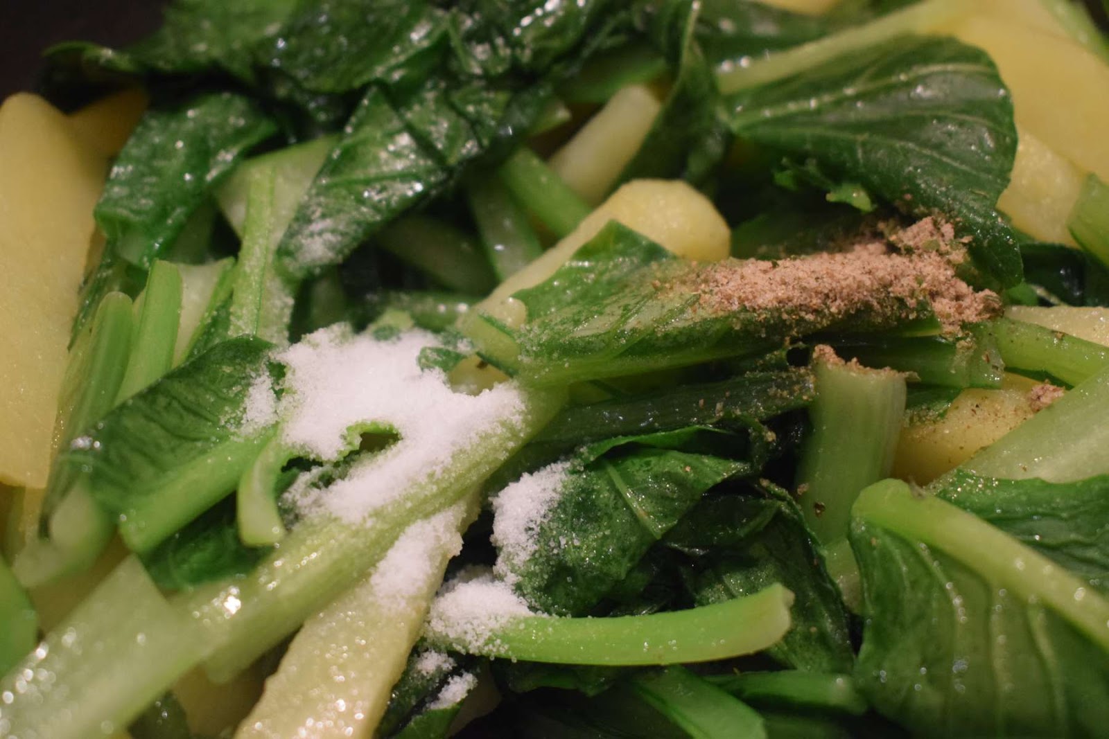 - Add Choy Sum (Step 3), Black Pepper, Garlic powder, Salt and give a nice mix.