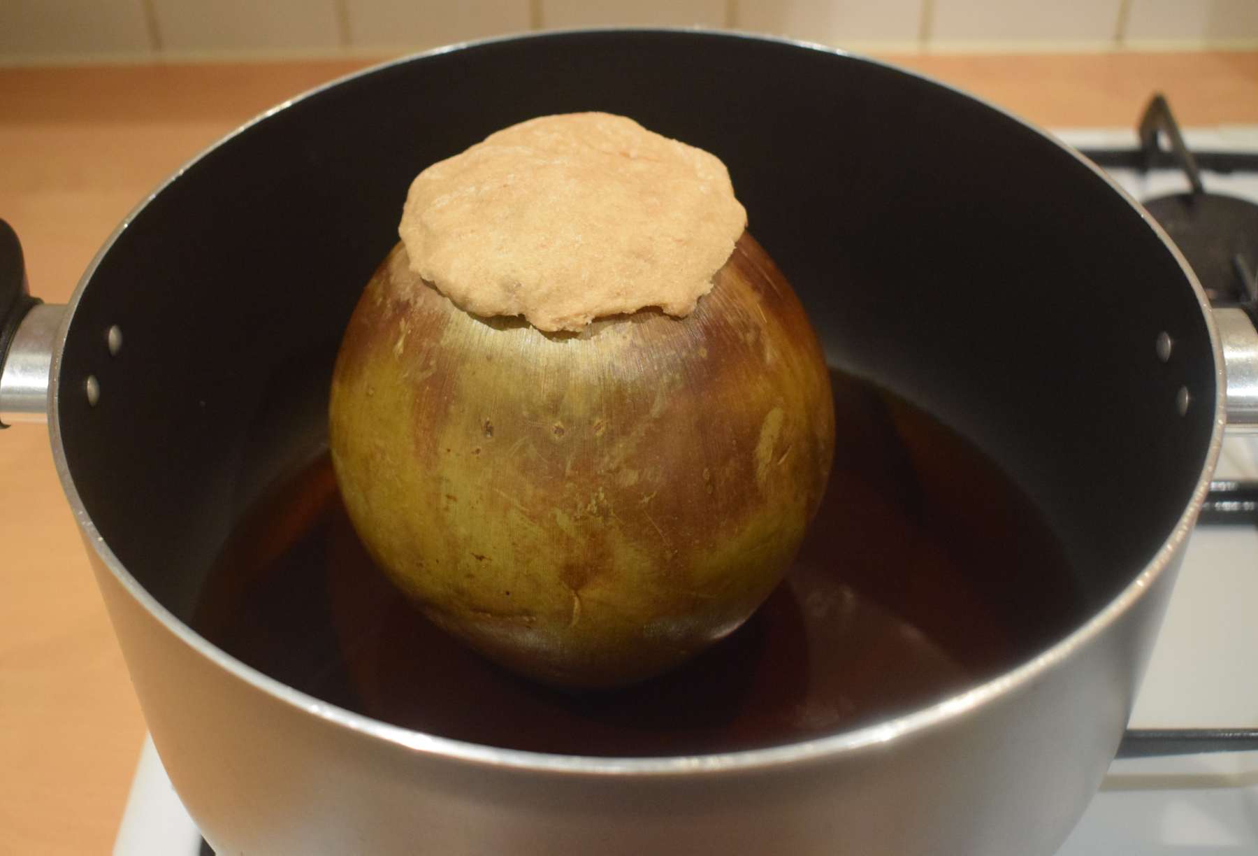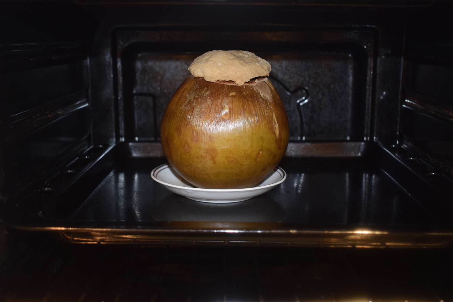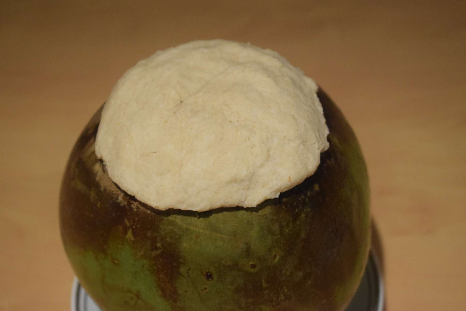 - Seal the coconut shell with the cut-out piece and then tack it with soft atta dough.
