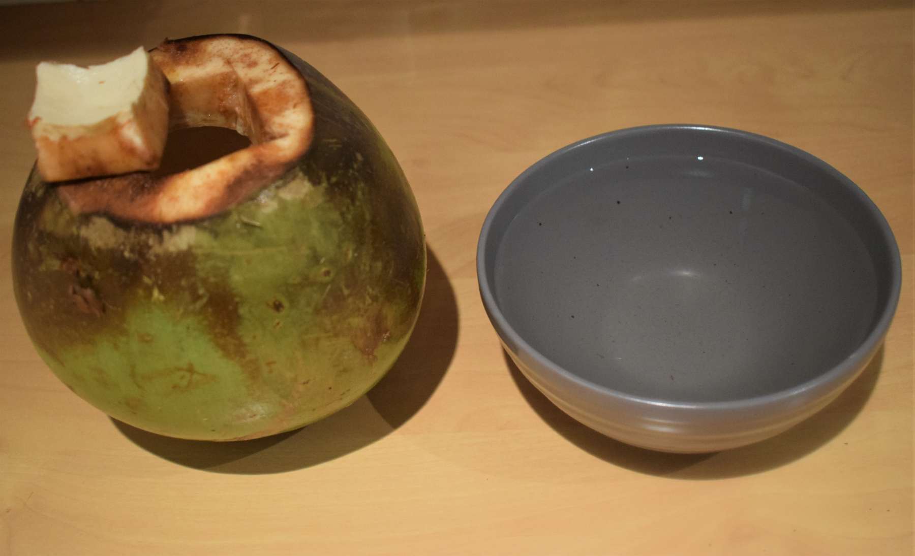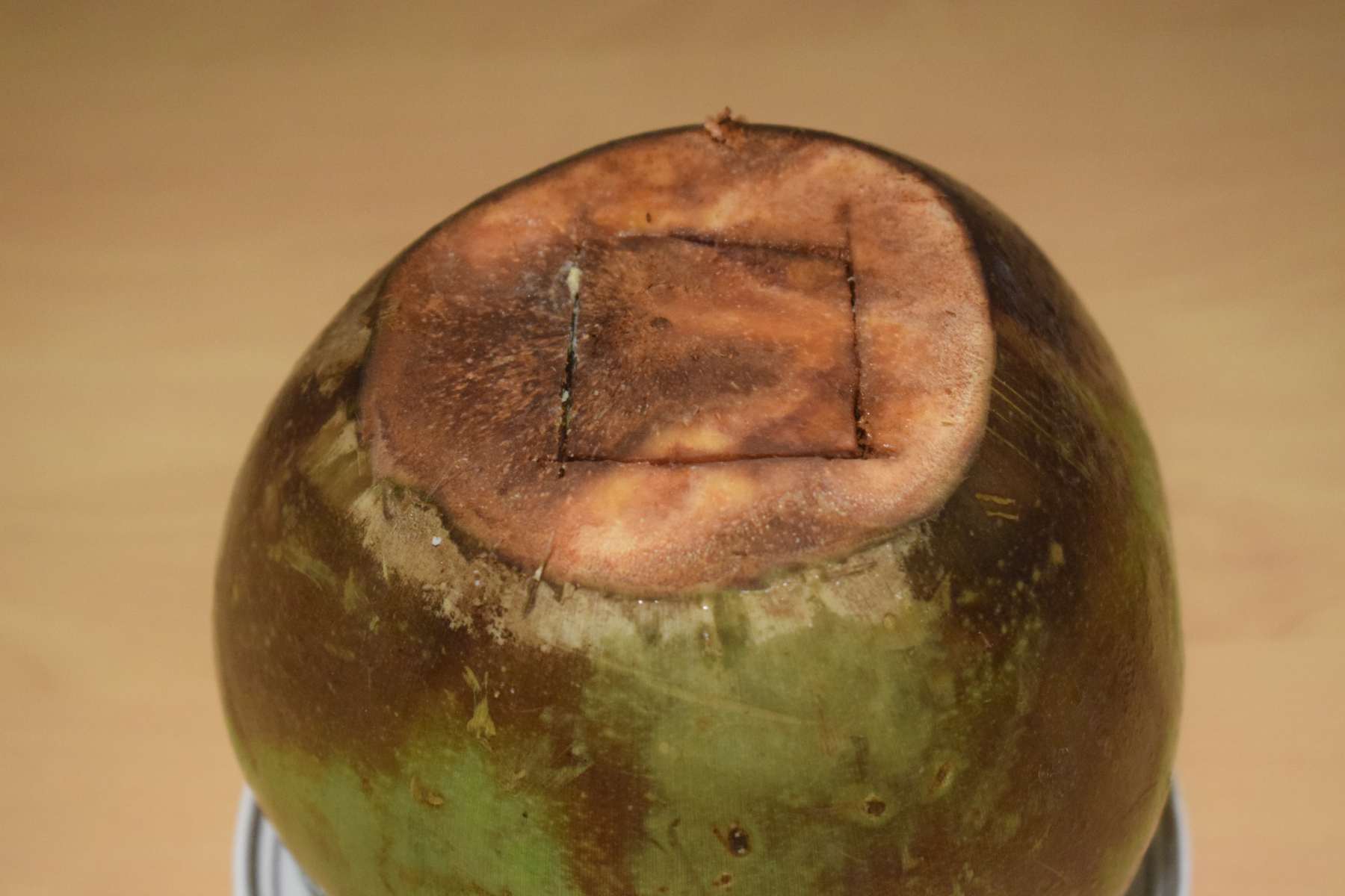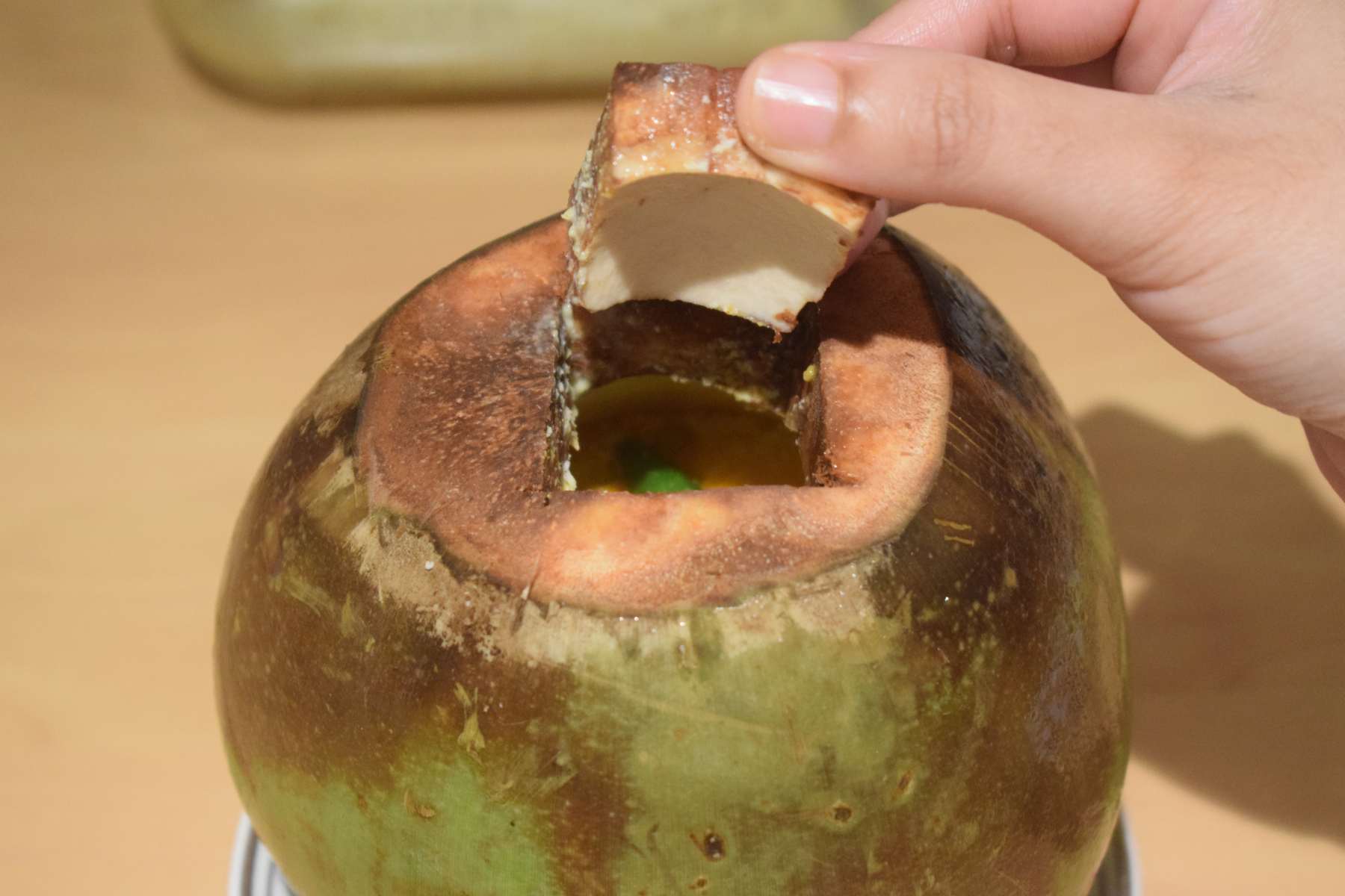 - Remove the atta dough seal of the tender coconut. Take off the cut-out piece of the coconut with a knife.