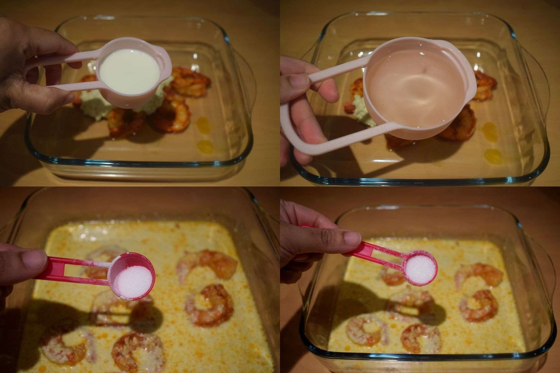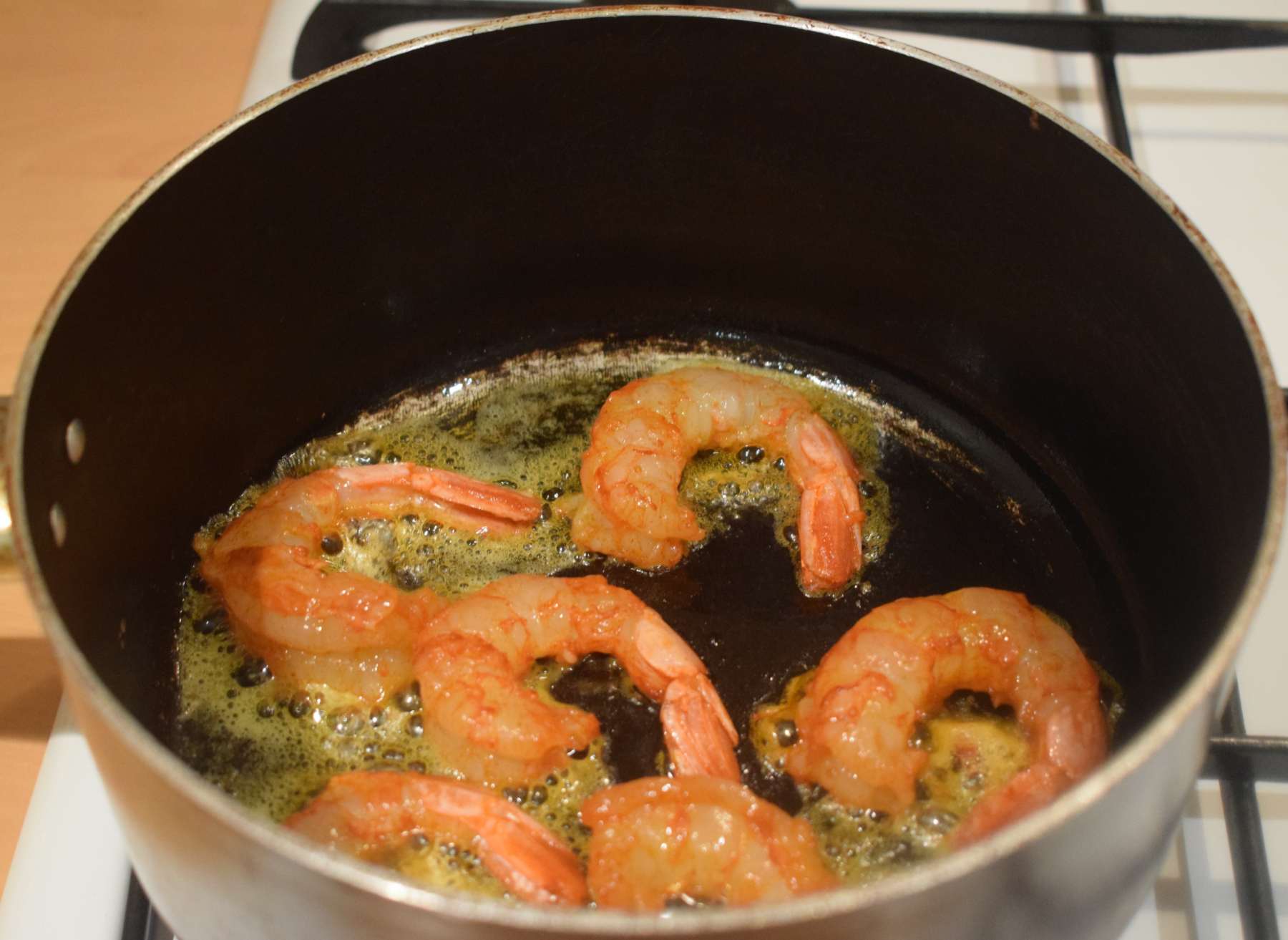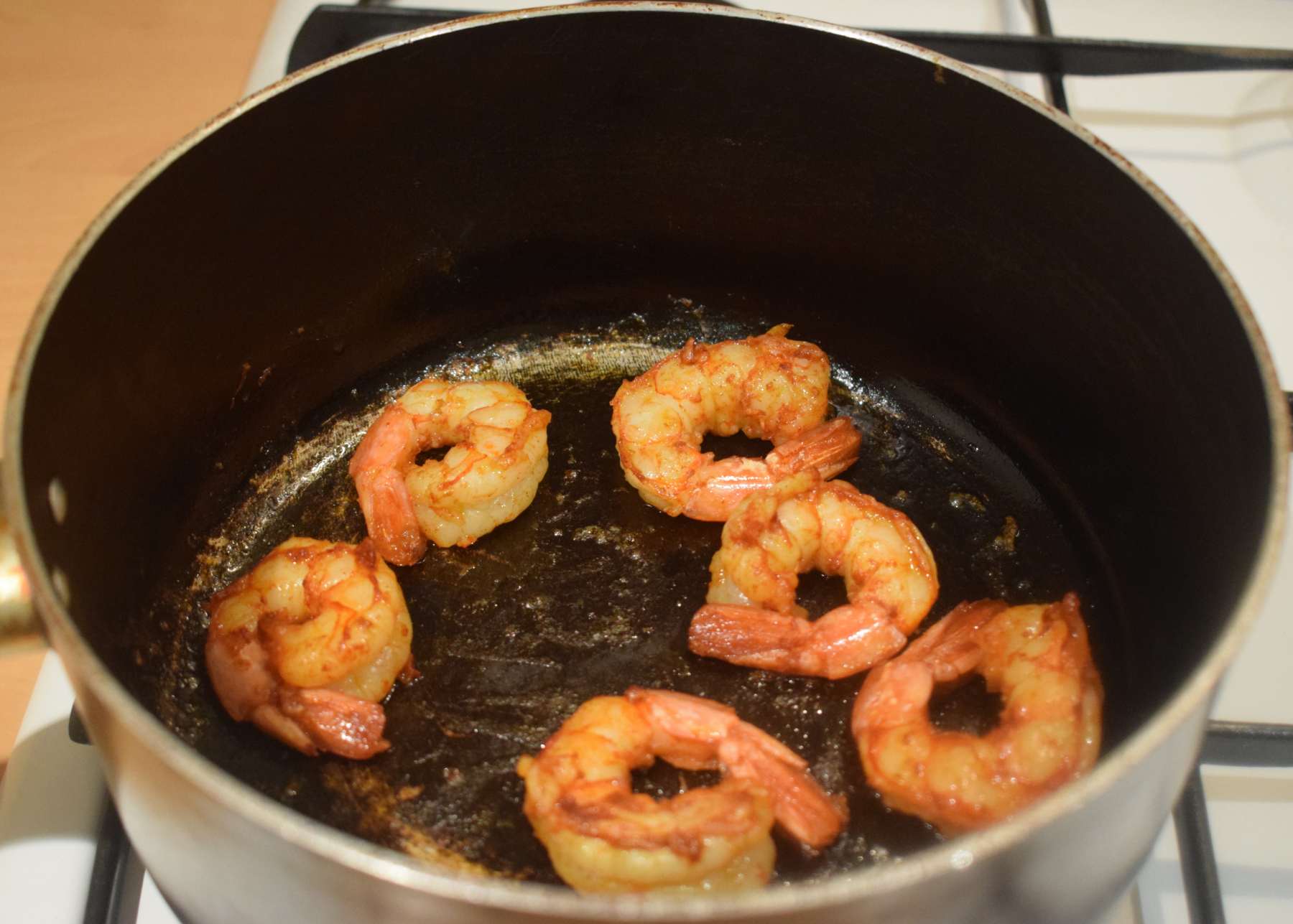 - Add the marinated prawns (Step 2) and fry them in low flame for 30 seconds on each side. Don’t over fry the prawns or else it will become rubbery.