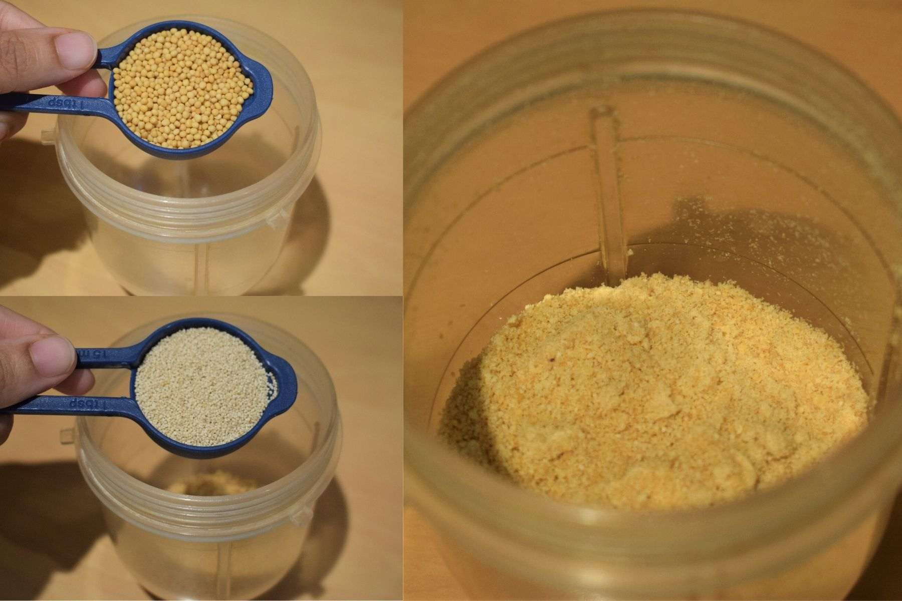 - To prepare the masala paste, take a jar of the mixer grinder and add mustard seeds, poppy seeds and pulse it to a powder.