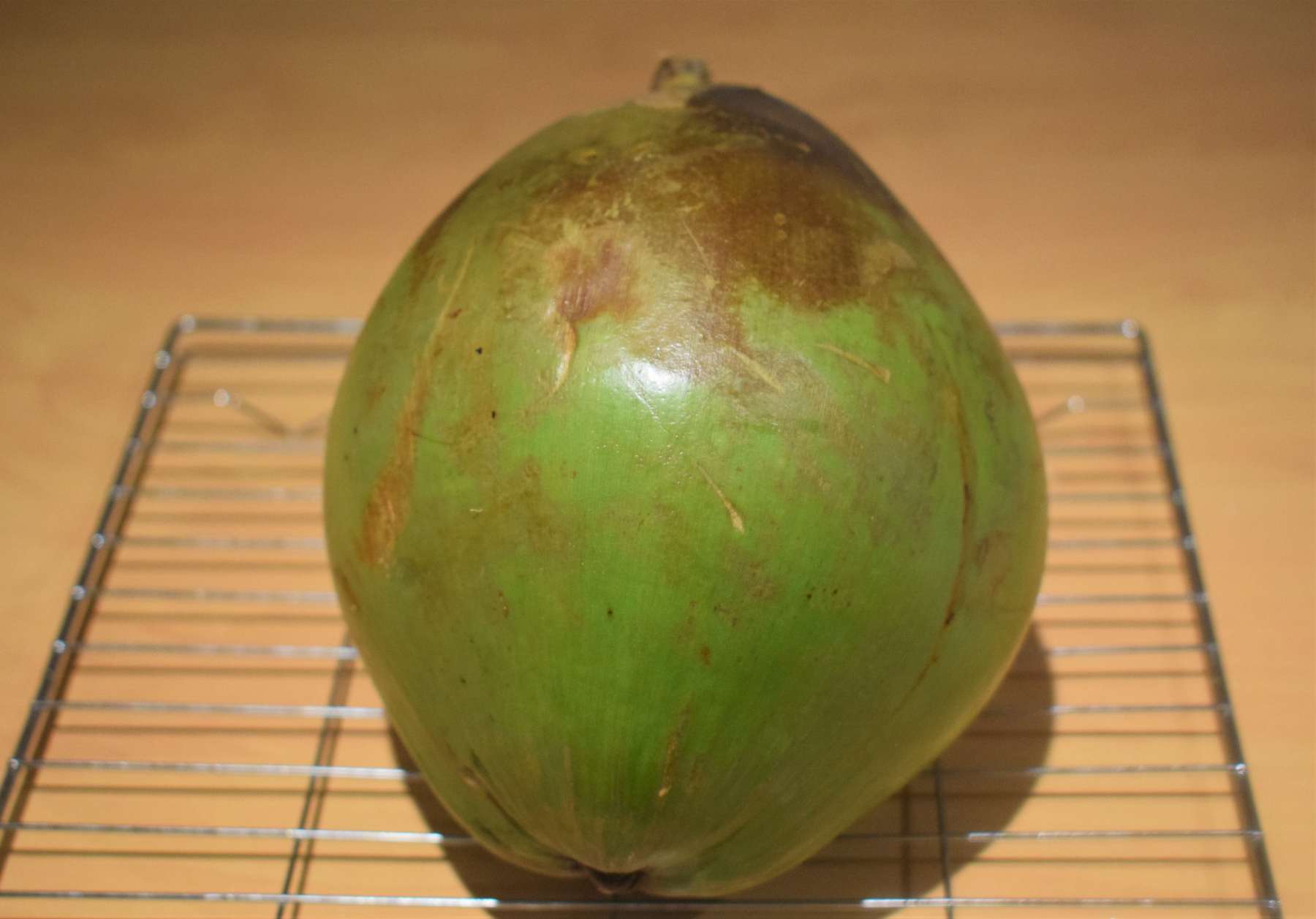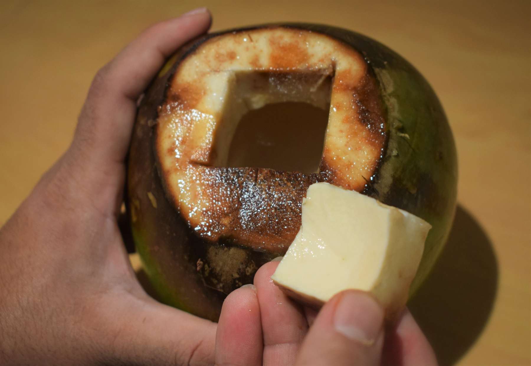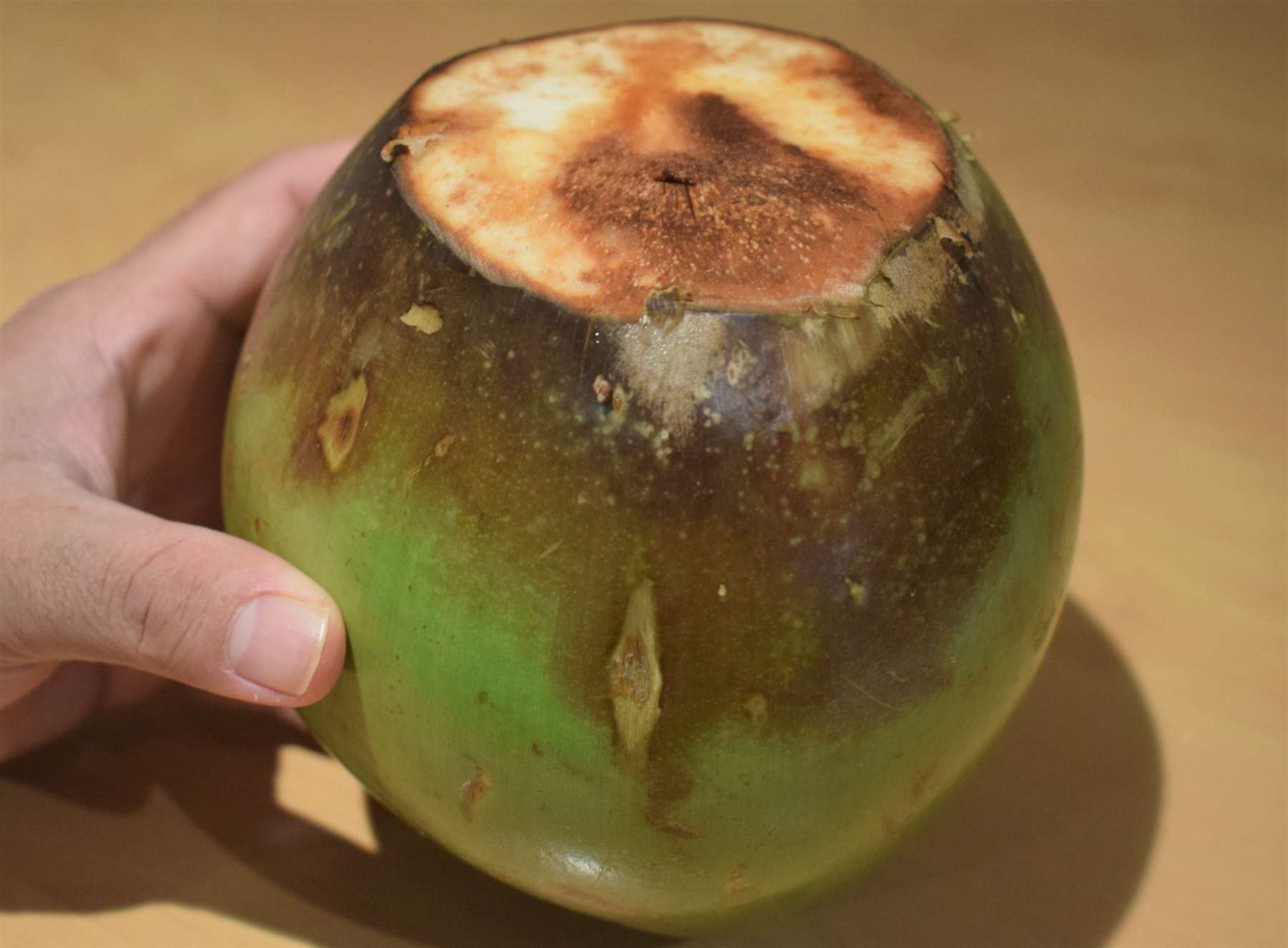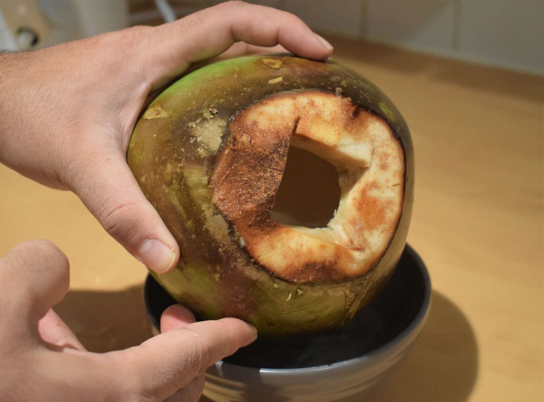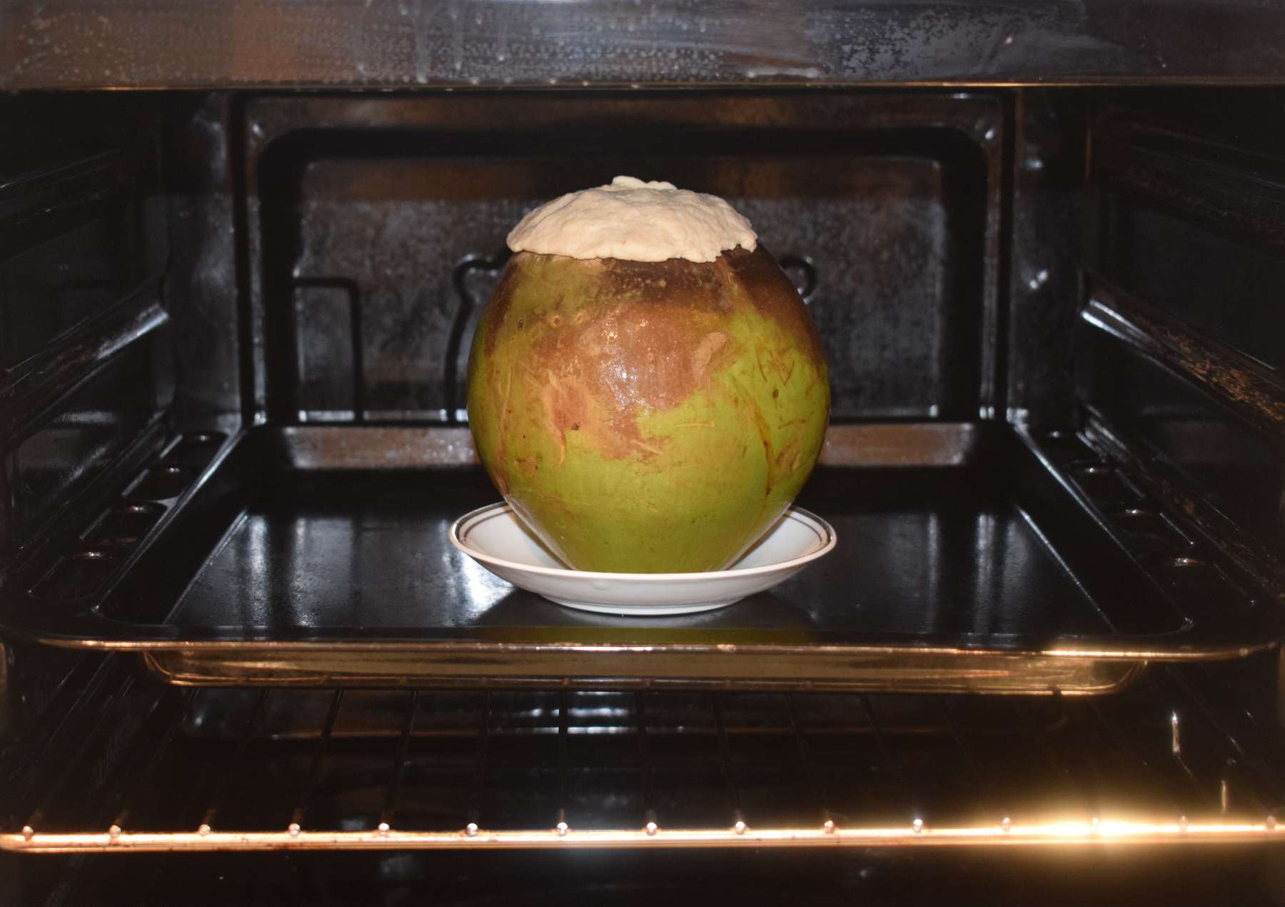 - Place the tender coconut on oven-proof plate and put it inside the middle of the preheated oven.
