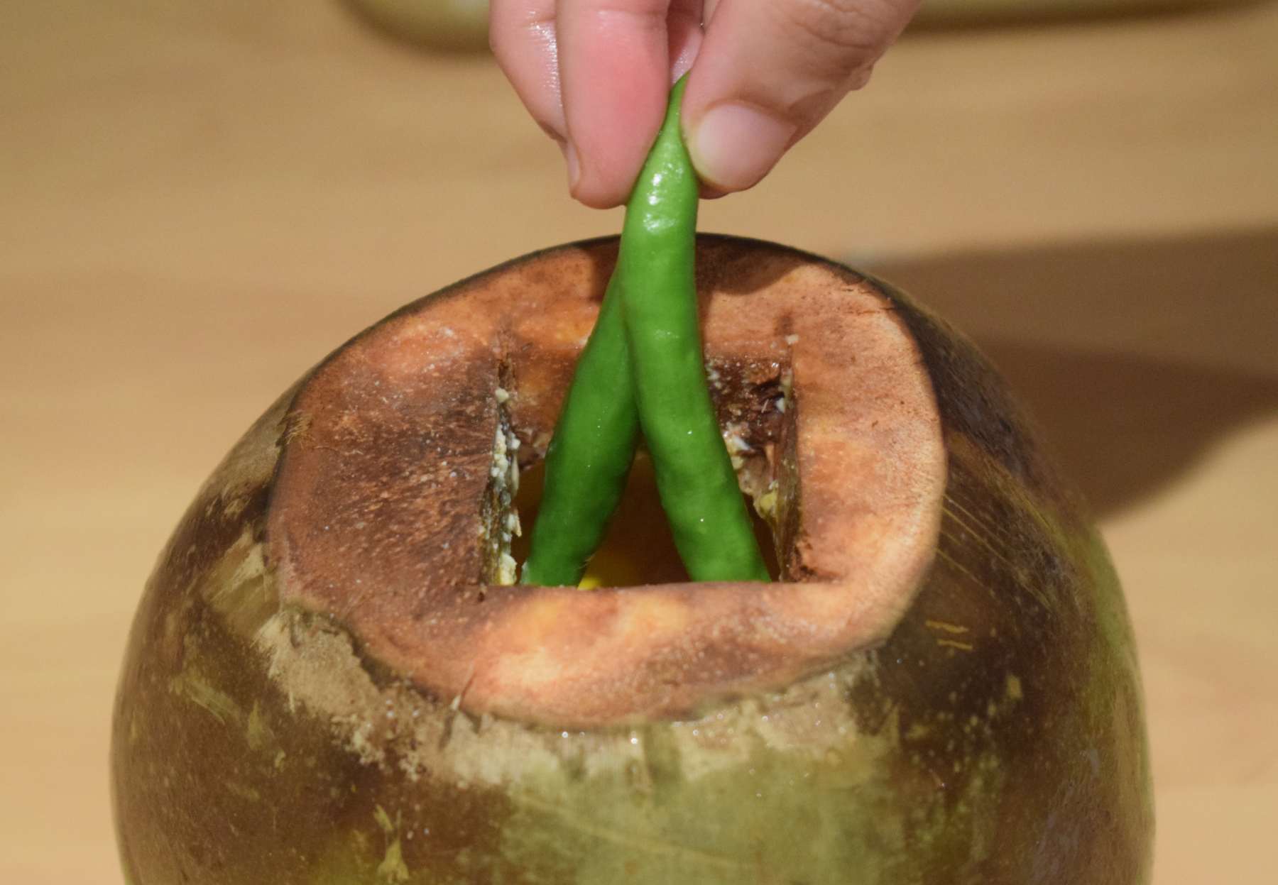 - Pour 1 teaspoon mustard oil inside the coconut shell and add 3 green chillies in it.