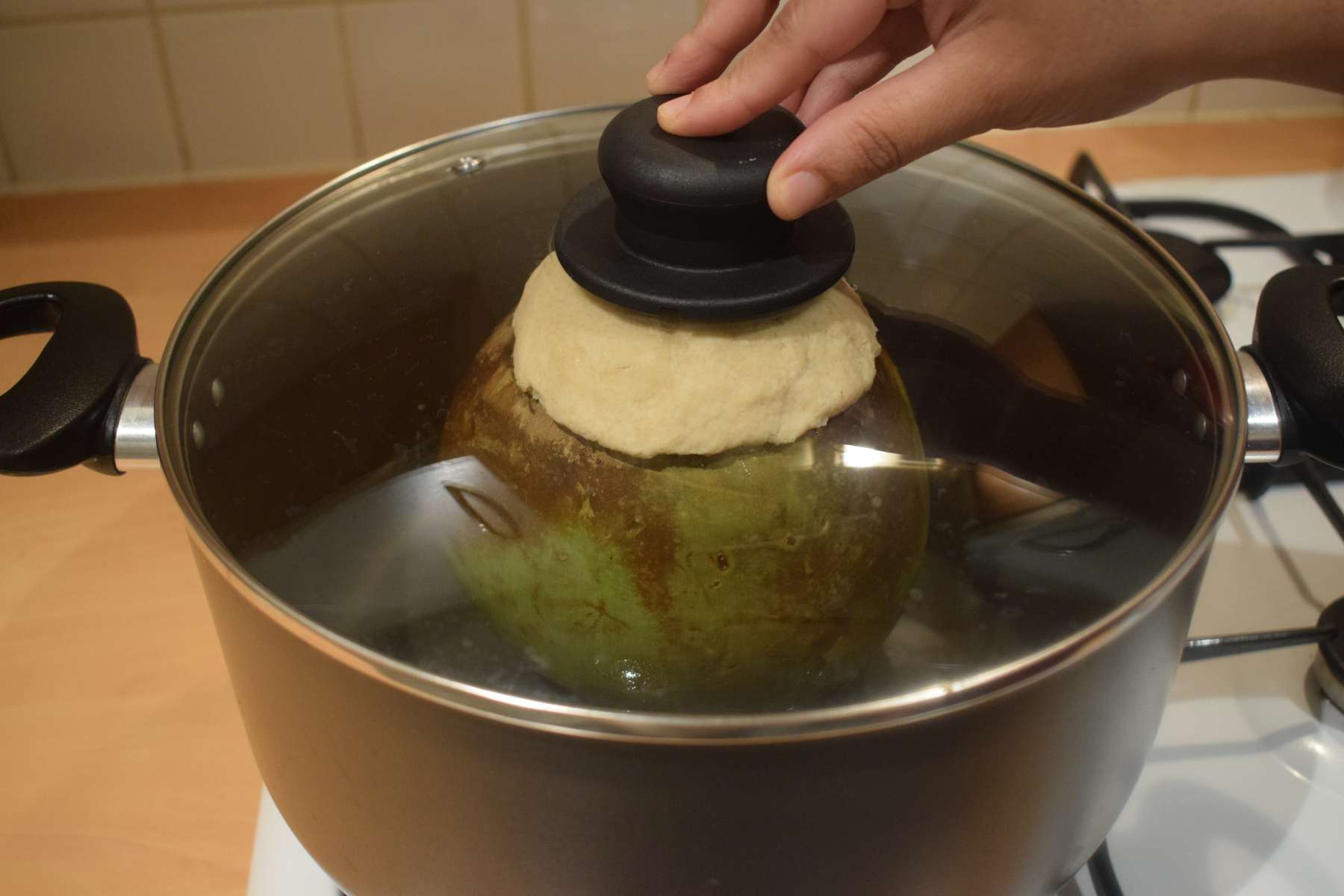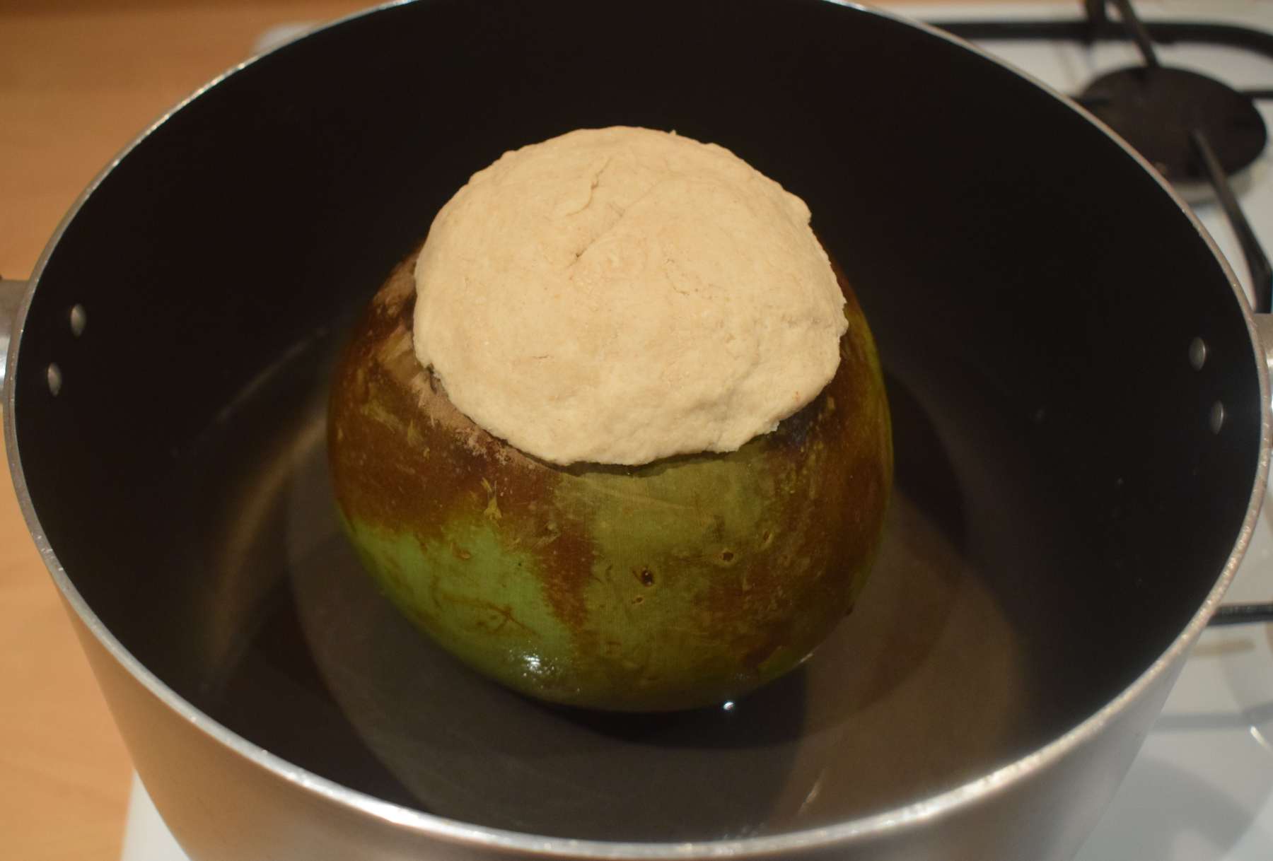 - Take a large kadai and add water in it. Place the coconut carefully into the kadai. The water level should be 1/3rd of the height of the coconut.