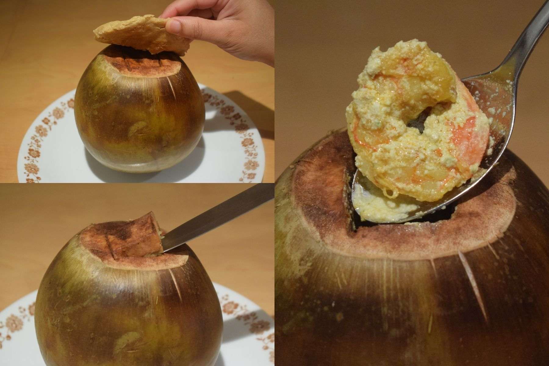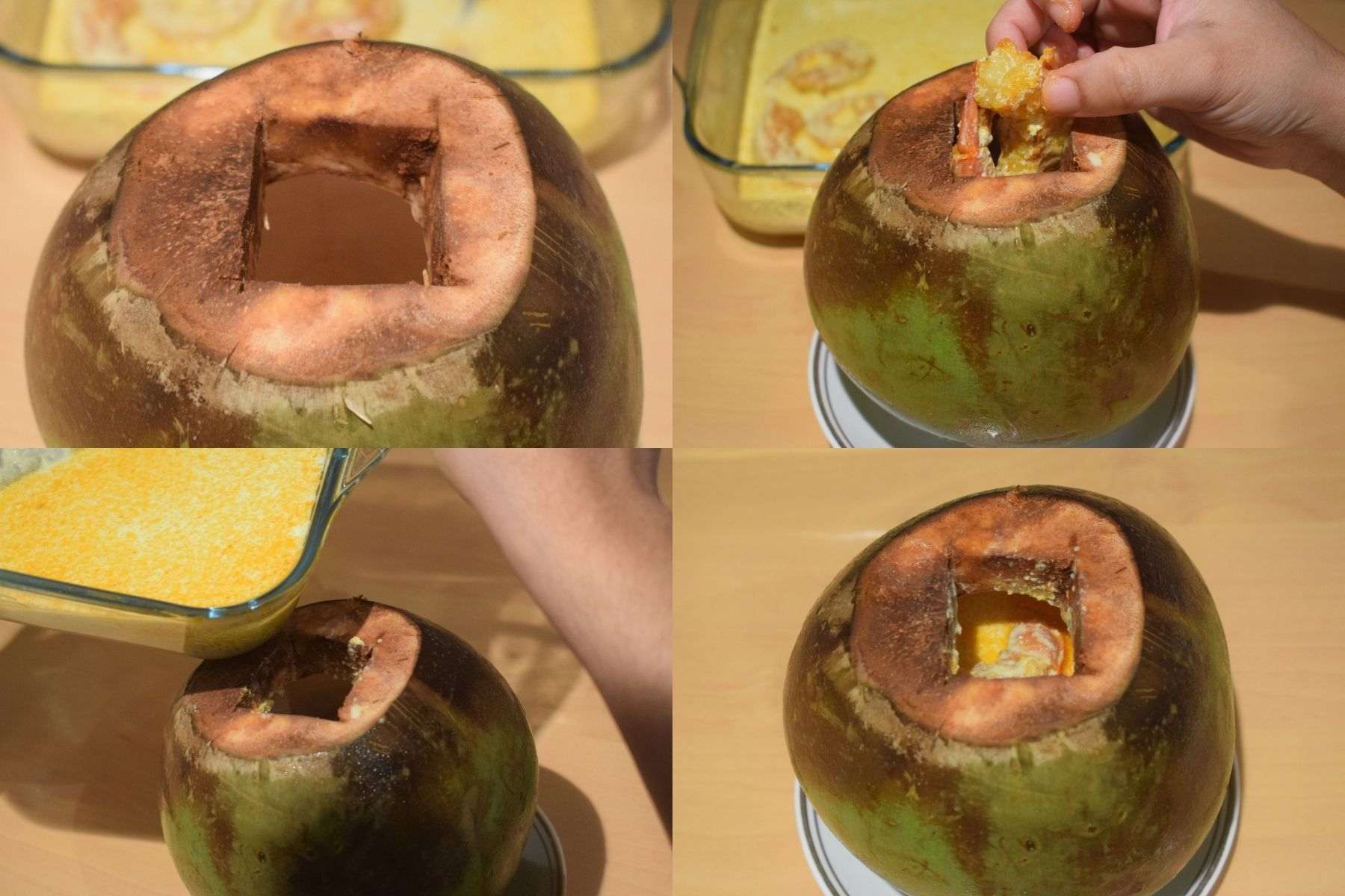 - Fill the whole content carefully inside the coconut shell but leave a little space inside the shell.